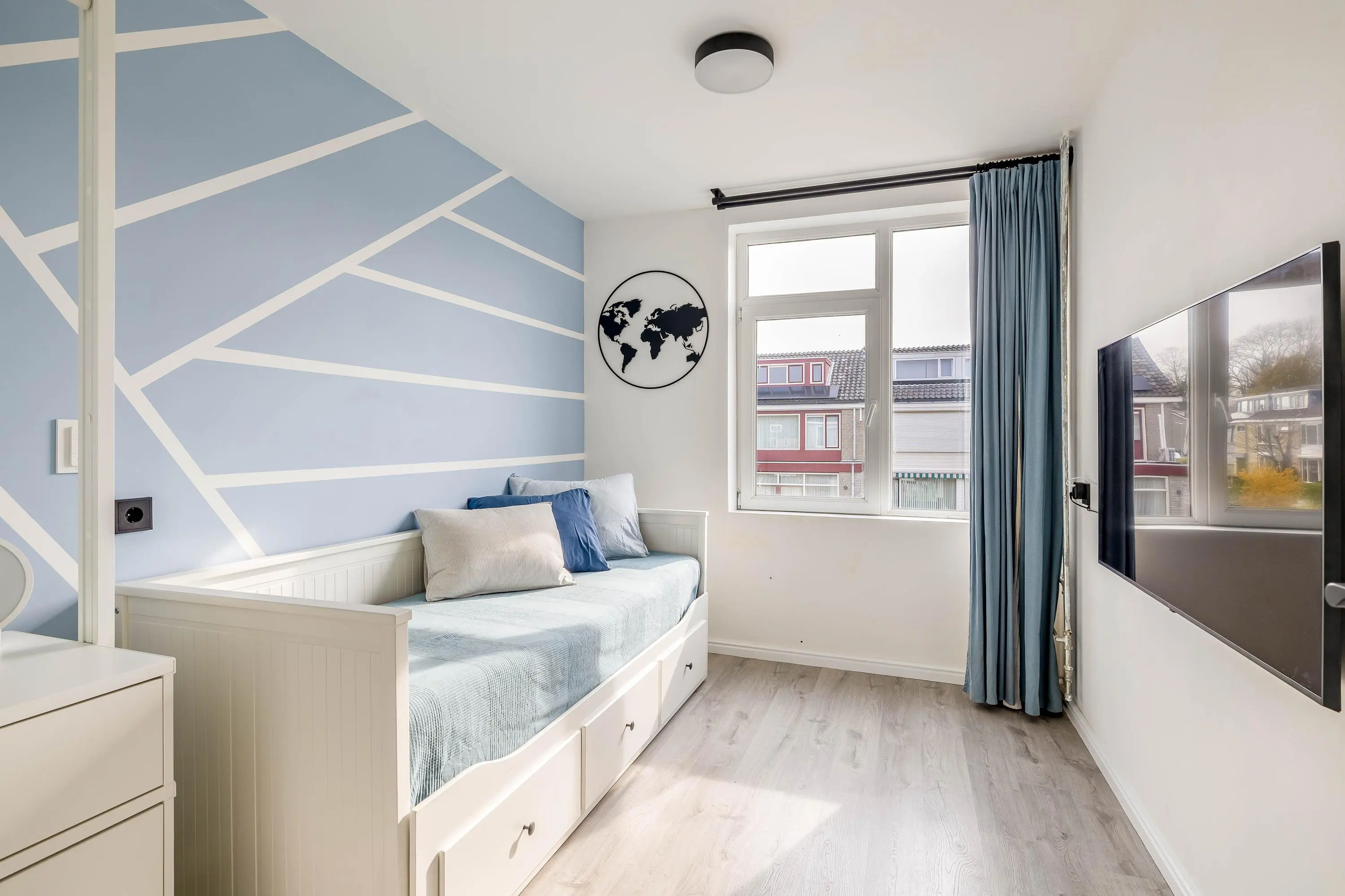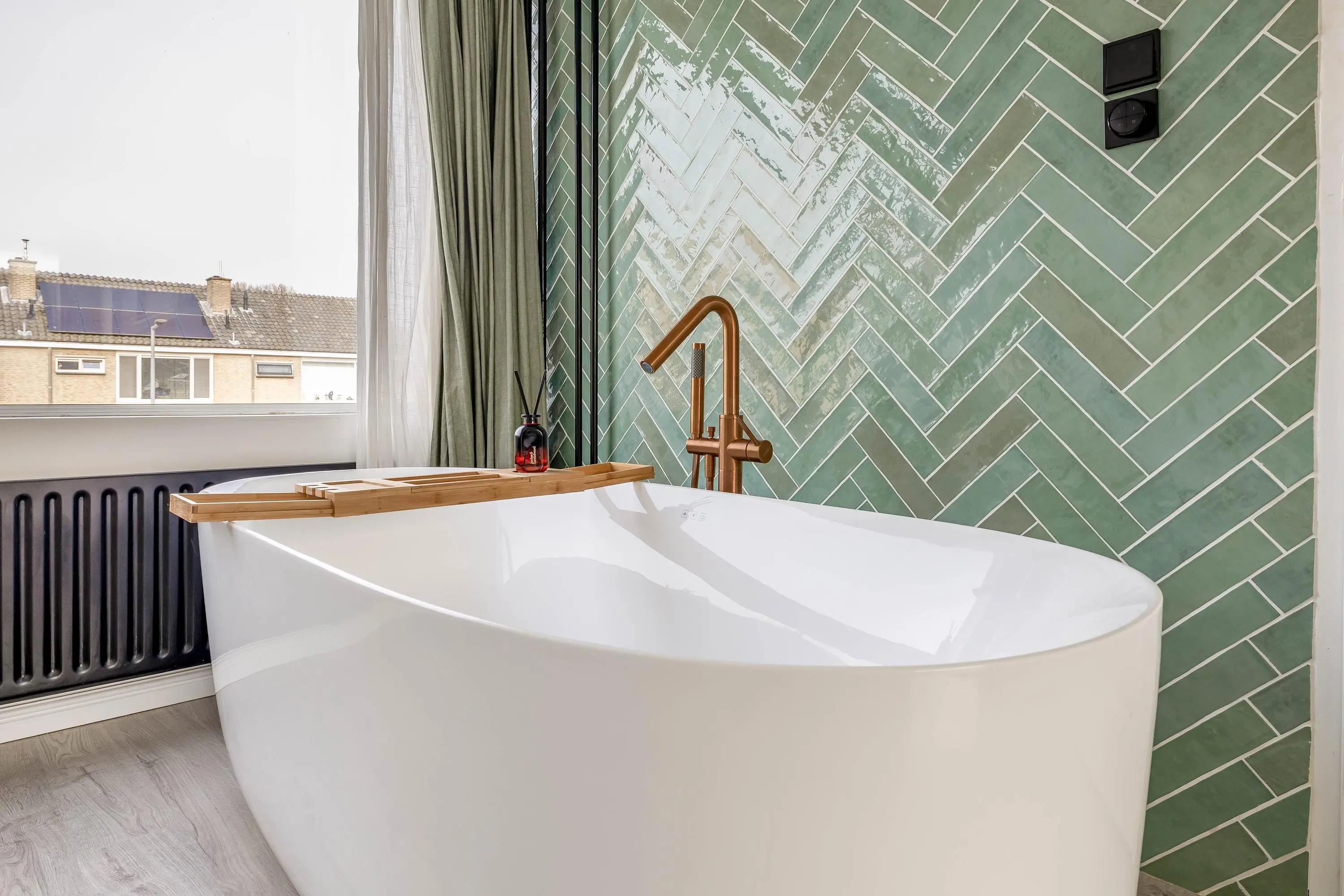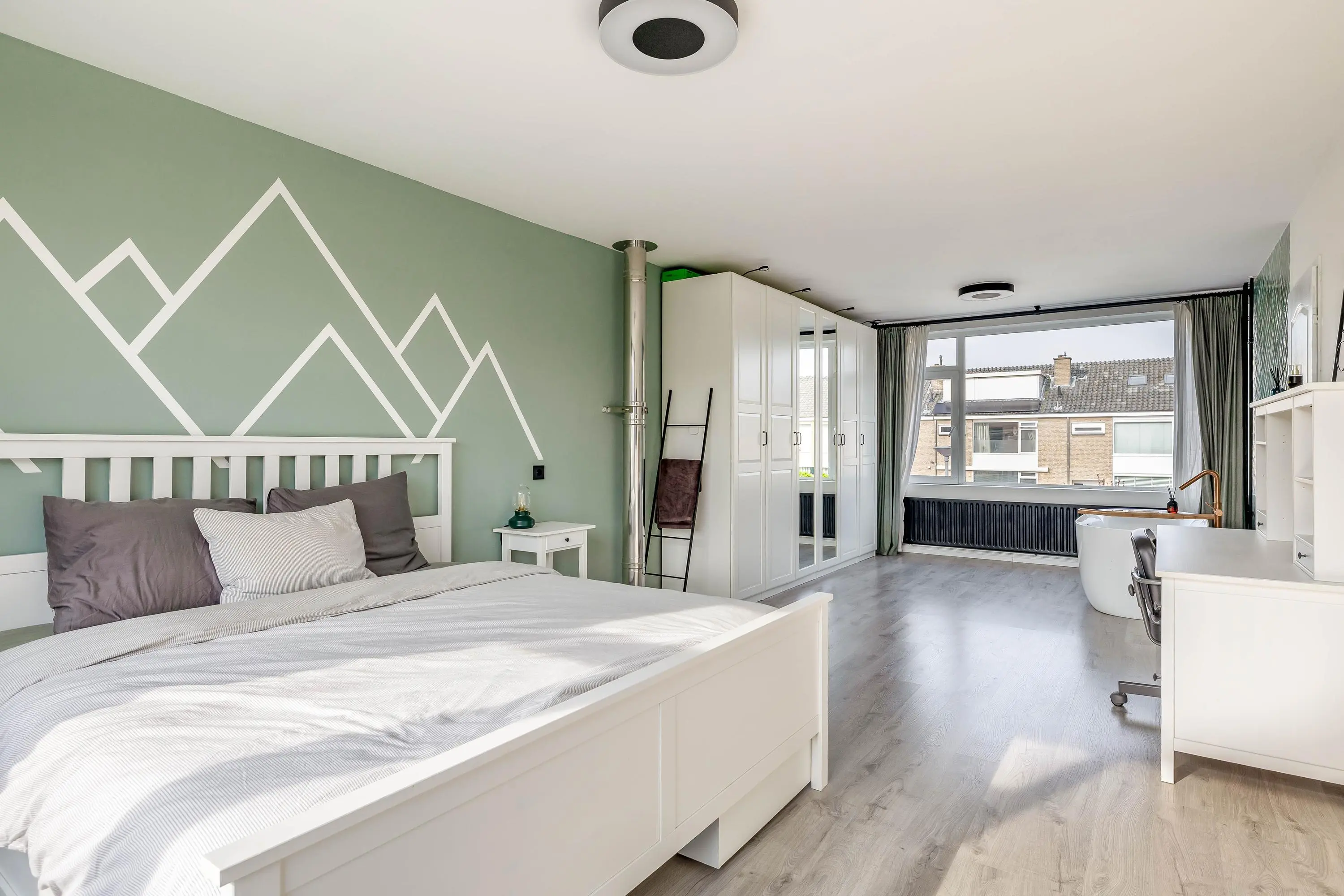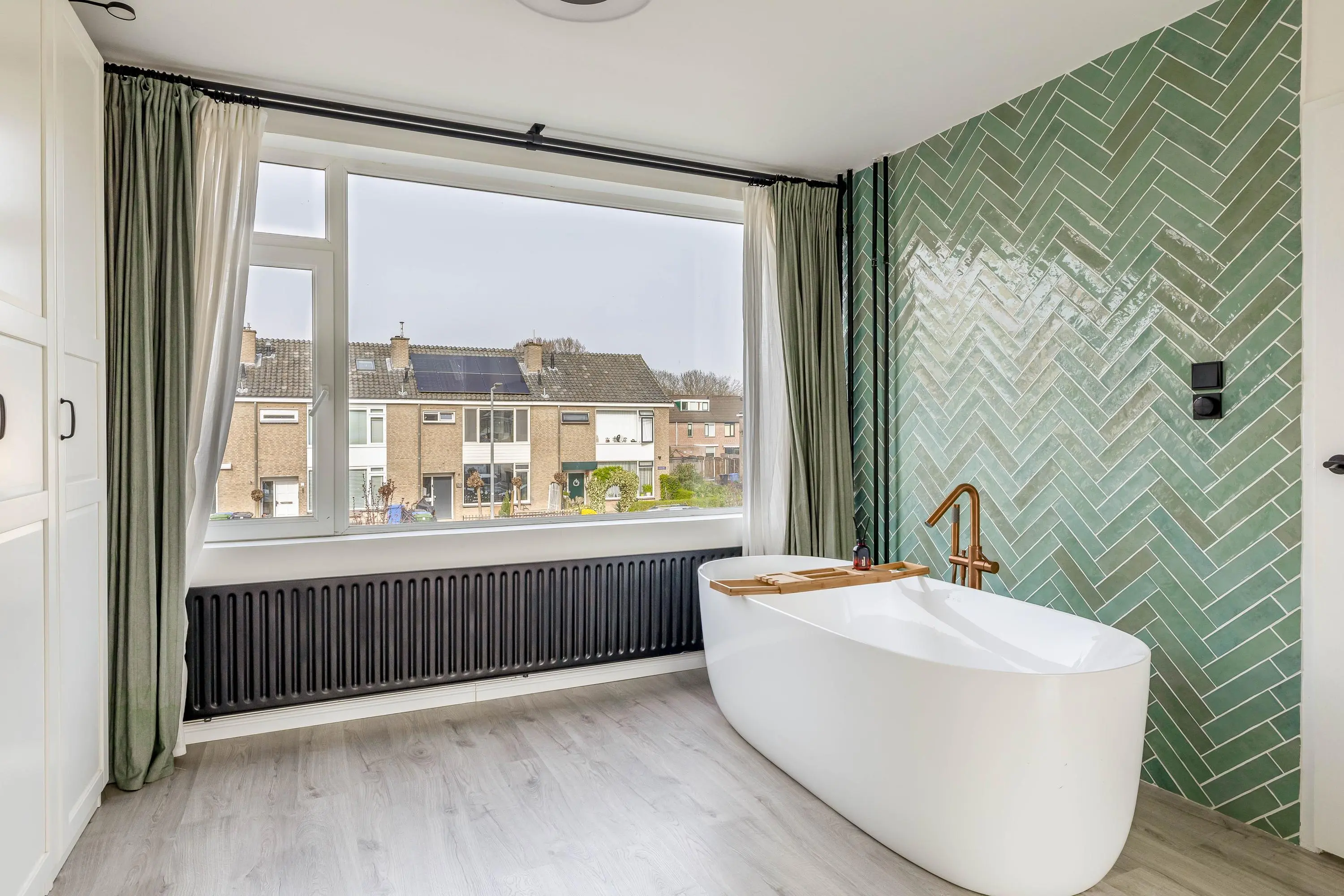 De zeer ruime master bedroom van circa 30,5m² voelt als een echte suite en beschikt over een bijzonder detail met een exclusief vrijstaand design bubbelbad met koperen kraan, geplaatst tegen een wand met groene tegels in visgraatmotief, compleet met sfeervolle ingebouwde verlichting voor een ultiem wellness gevoel. De tweede slaapkamer van ca. 9m² is eveneens licht en prettig van formaat.