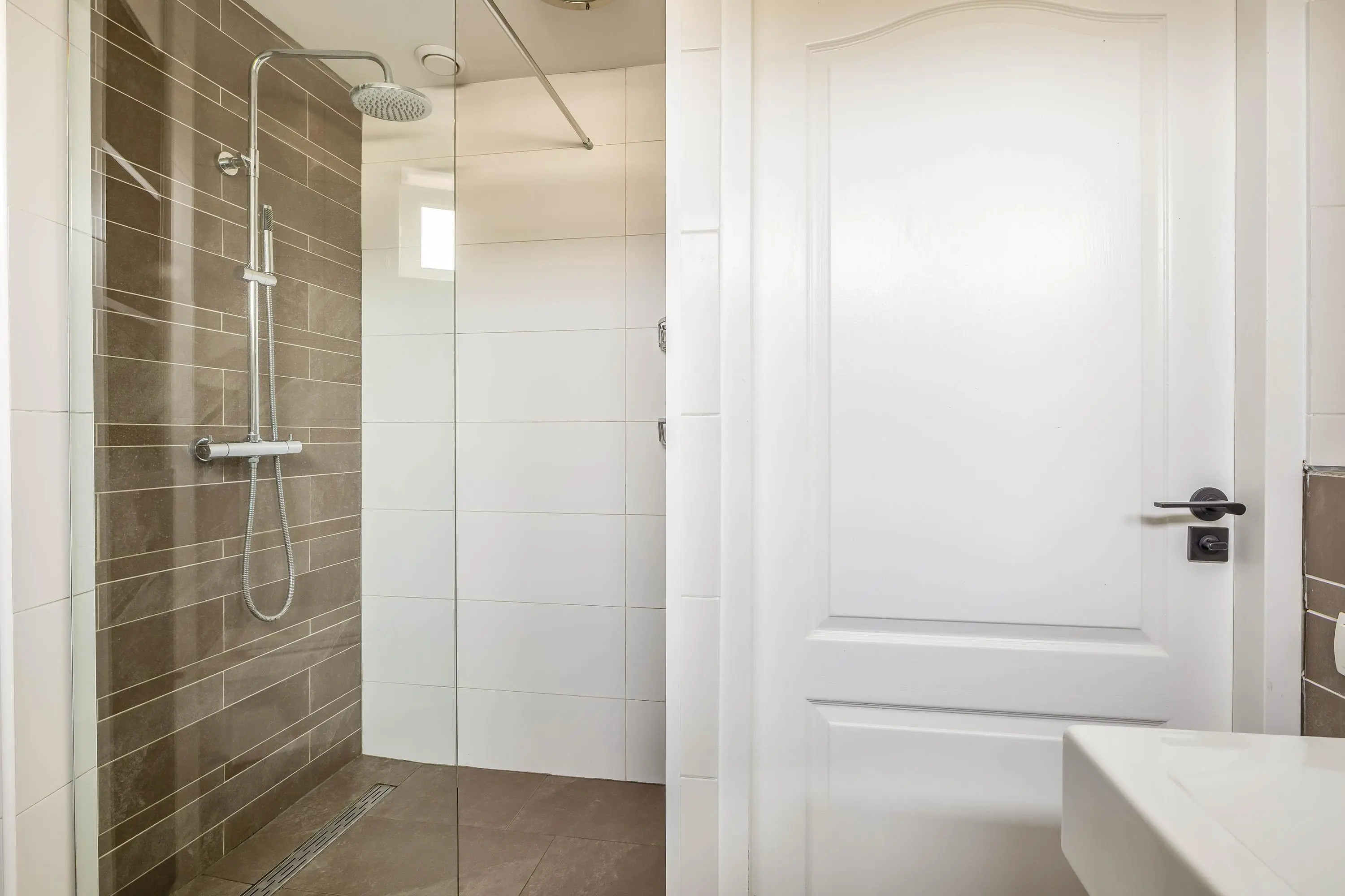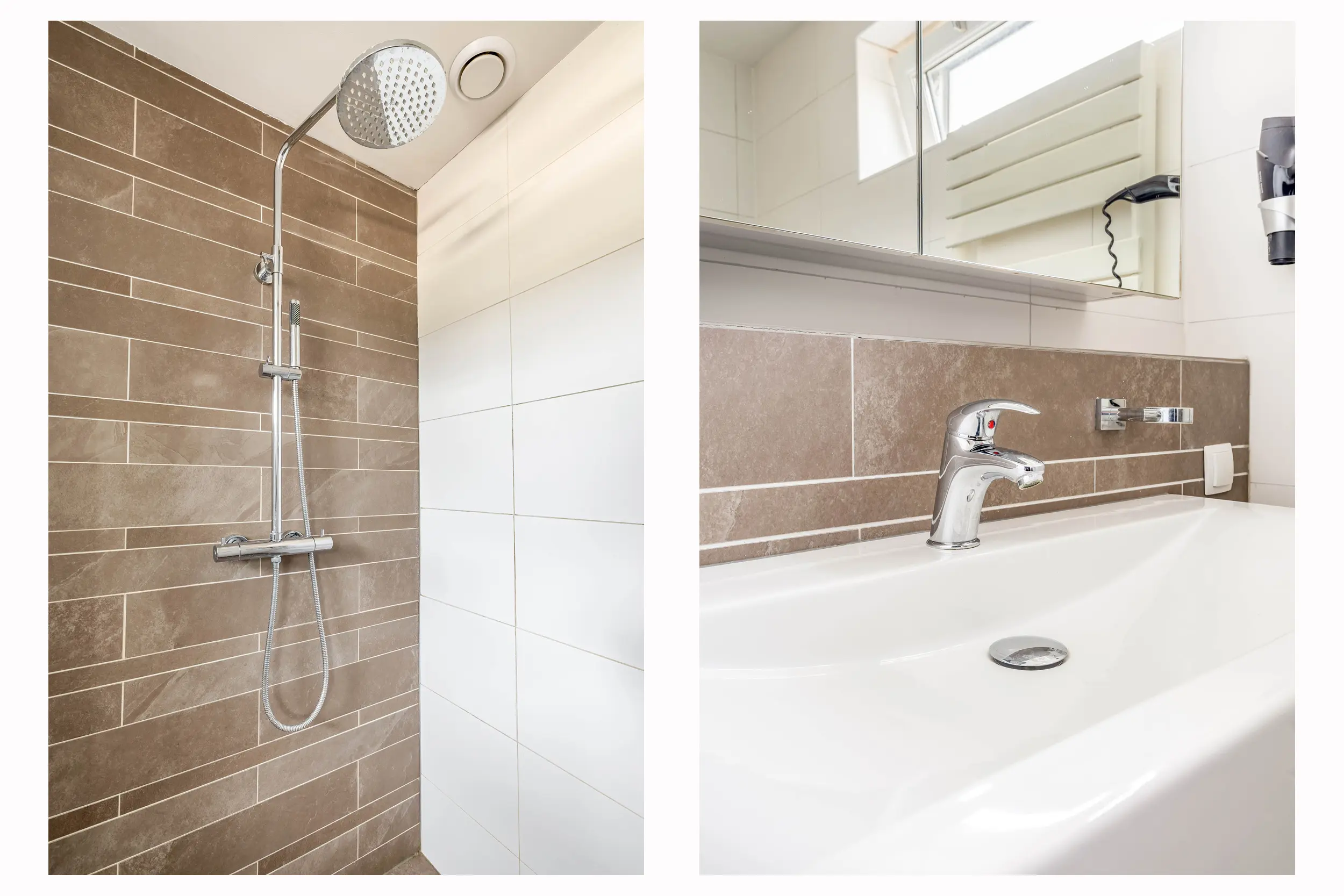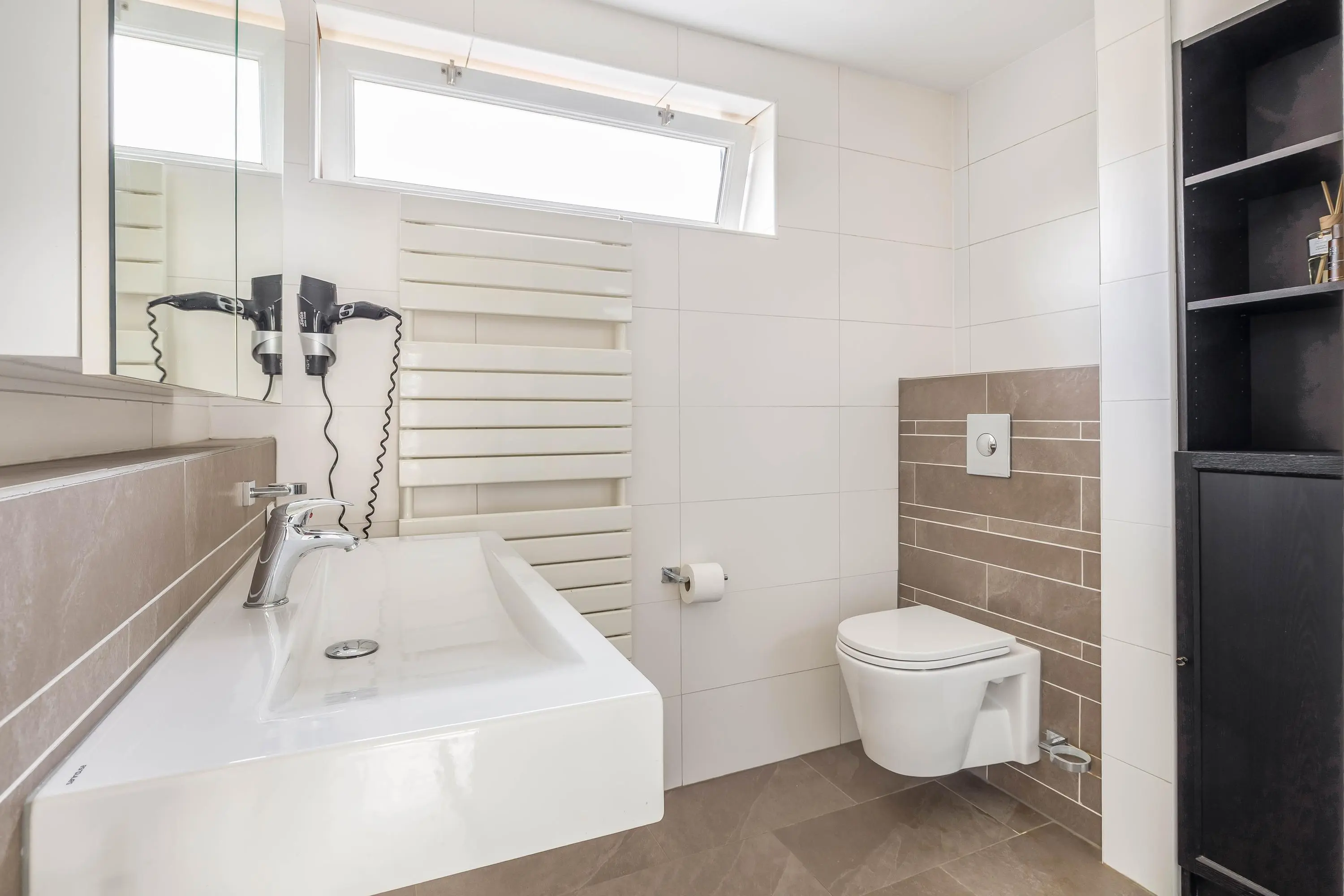 De volledig betegelde badkamer is functioneel ingericht met een inloopdouche voorzien van een glazen wand, een zwevend toilet, een breed wastafelmeubel en een witte designradiator. Het aanwezige raam zorgt voor natuurlijke ventilatie.