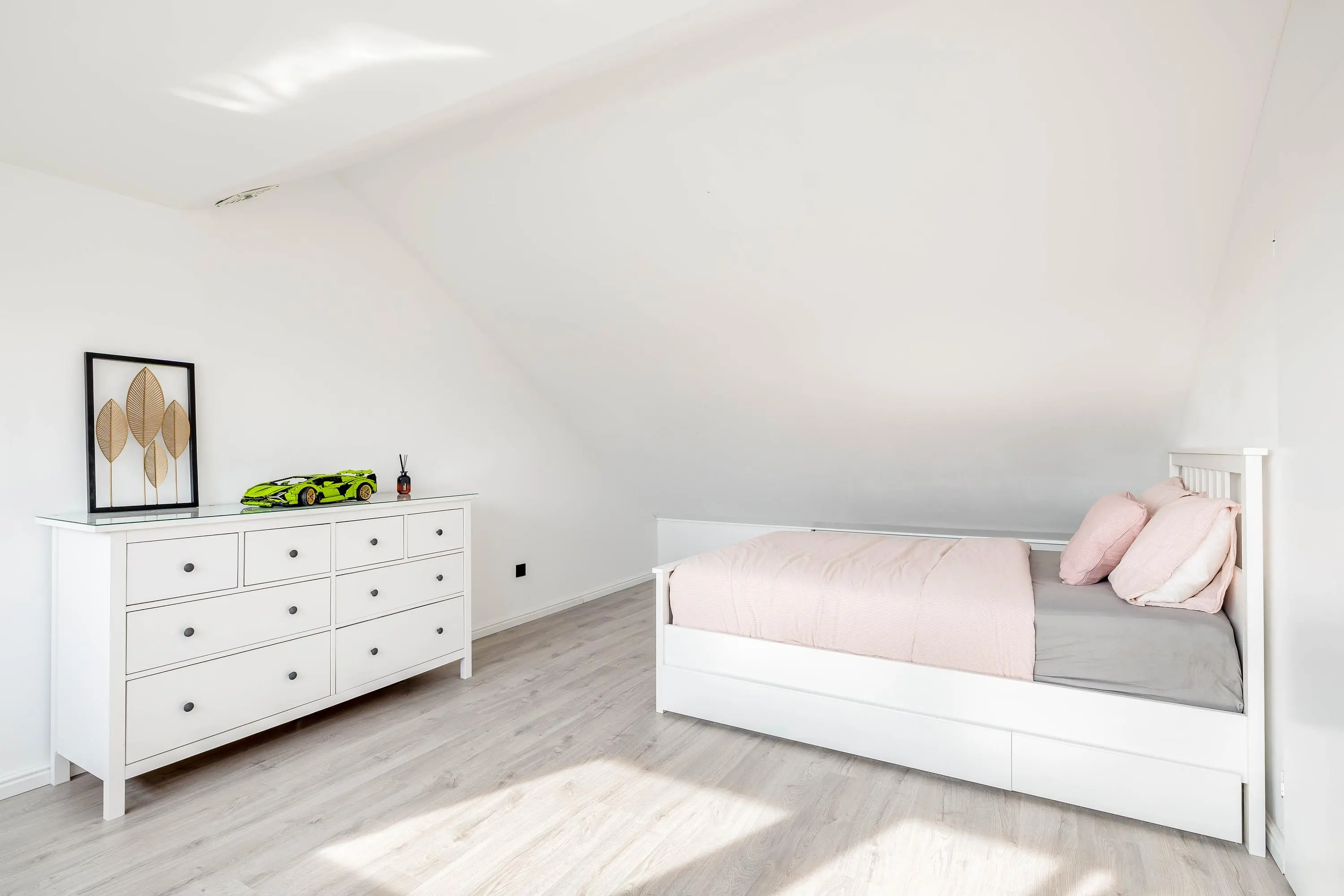 De zolderverdieping biedt een ruime derde slaapkamer van circa 15,5m². Dankzij de grote dakkapel aan de achterzijde is het een volwaardige, lichte kamer geworden, met praktische kastruimte in de muur van het schuine dak.
