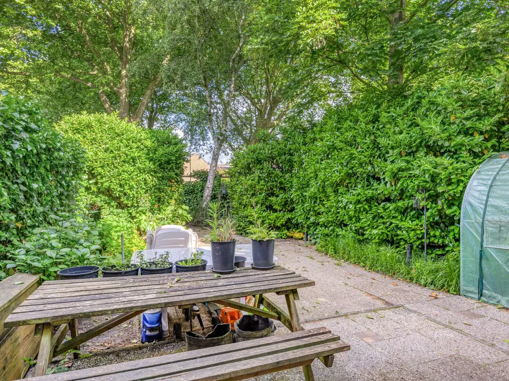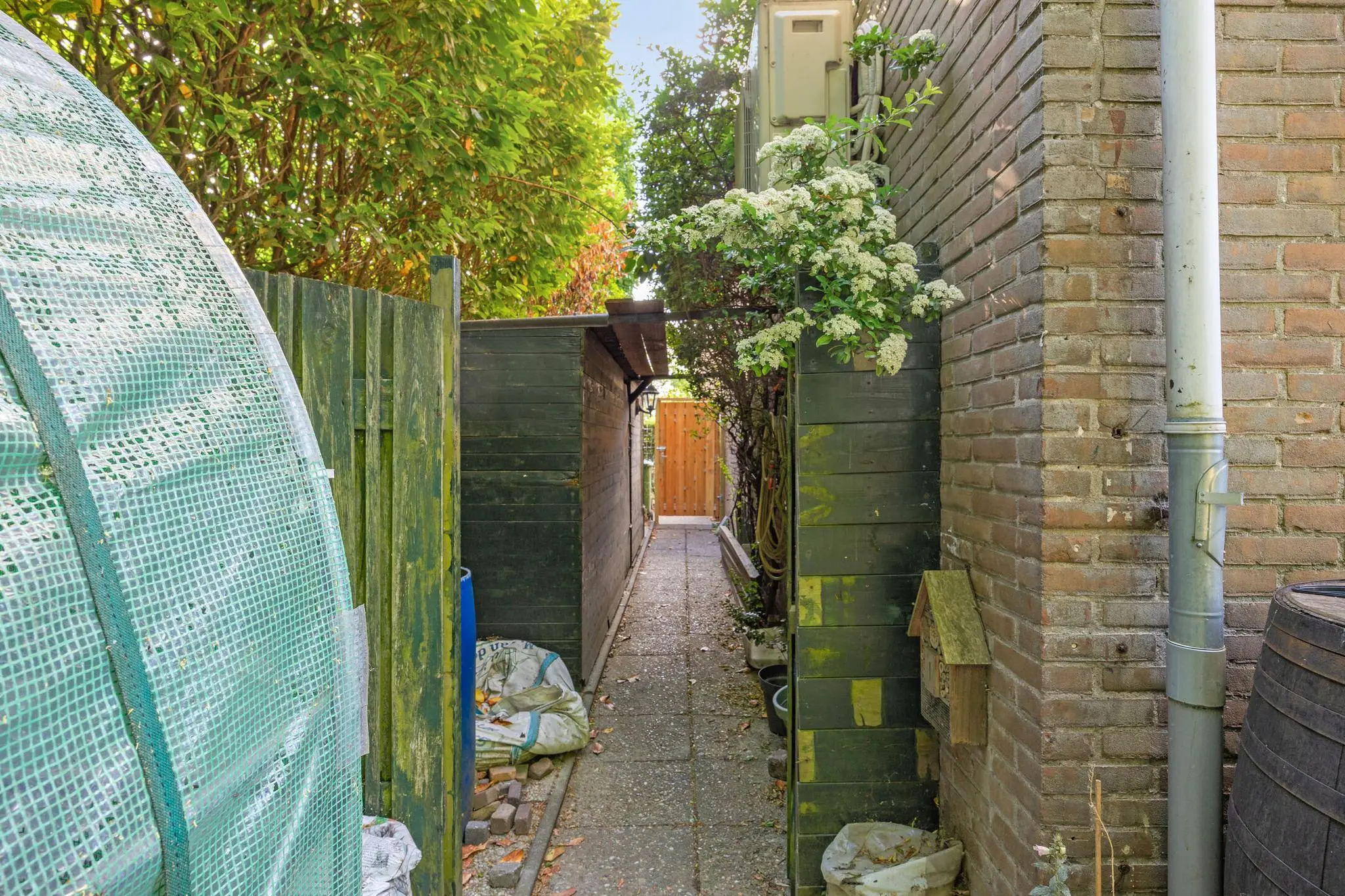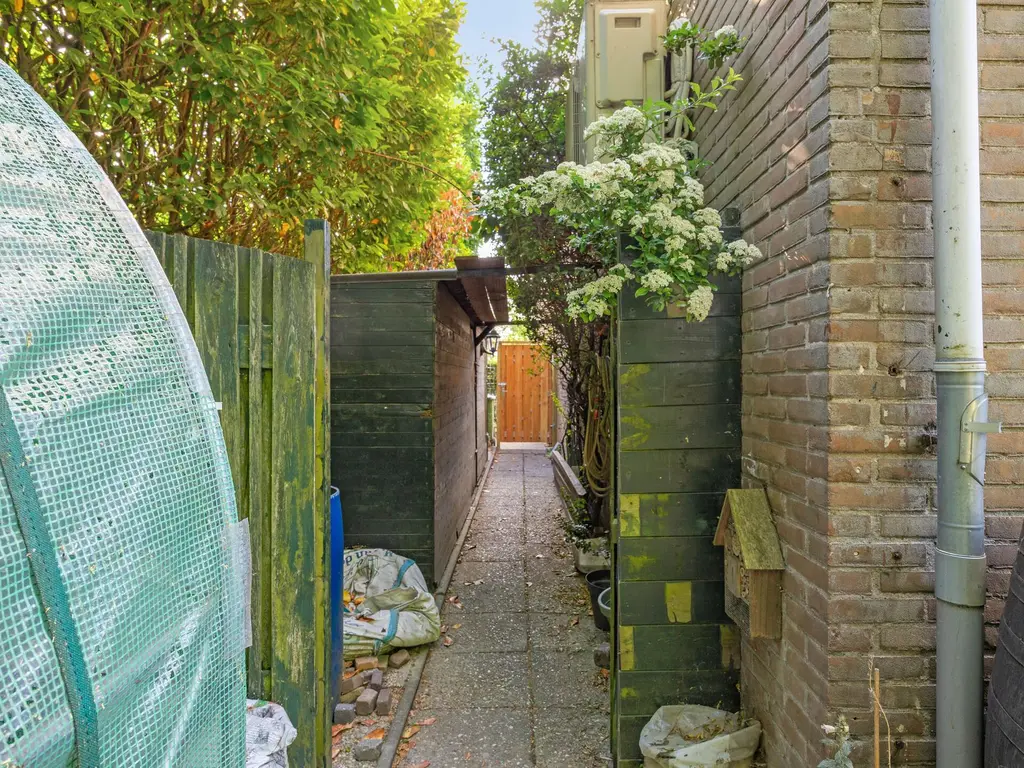 De voortuin biedt de mogelijkheid om te parkeren op de eigen oprit. In de zijtuin vindt u de vrijstaande berging met elektra en zo is de achtertuin bereikbaar. De tuin is maar liefst 15 meter diep en dit zorgt ervoor dat u optimaal kunt genieten van het buitenleven. De tuin ligt op het noordwesten en vanwege de diepte kunt u hier de hele dag genieten van zon en schaduw. De tuin is voorzien van veel groen en beschikt over bomen, beplanting en bestrating.