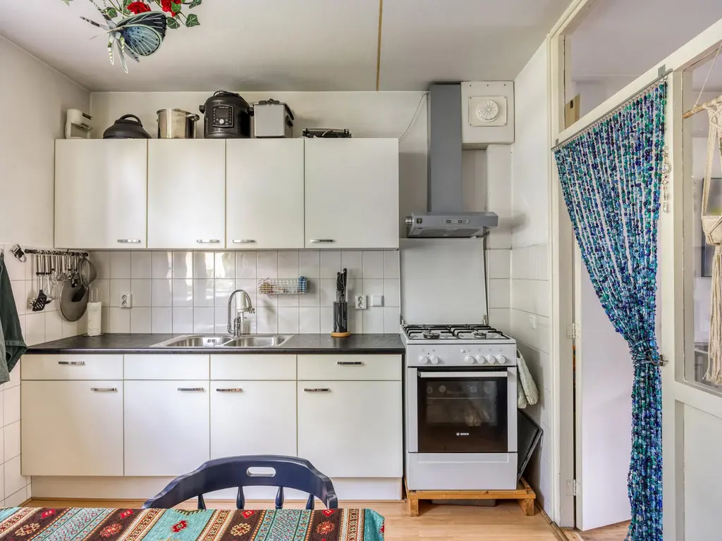 De ruime en aangenaam lichte woonkamer heeft een oppervlakte van circa 31m² en is afgewerkt met een laminaatvloer en glasvliesbehang. Ook zijn er voorzetwanden geplaatst en is de living voorzien van airconditioning. Ideaal voor de warme dagen! Aan de achterzijde ligt de ruim opgezette woonkeuken. De keuken is uitgevoerd in een rechte opstelling en bestaat uit qua apparatuur uit een afzuigkap en een gasfornuis met een oven.