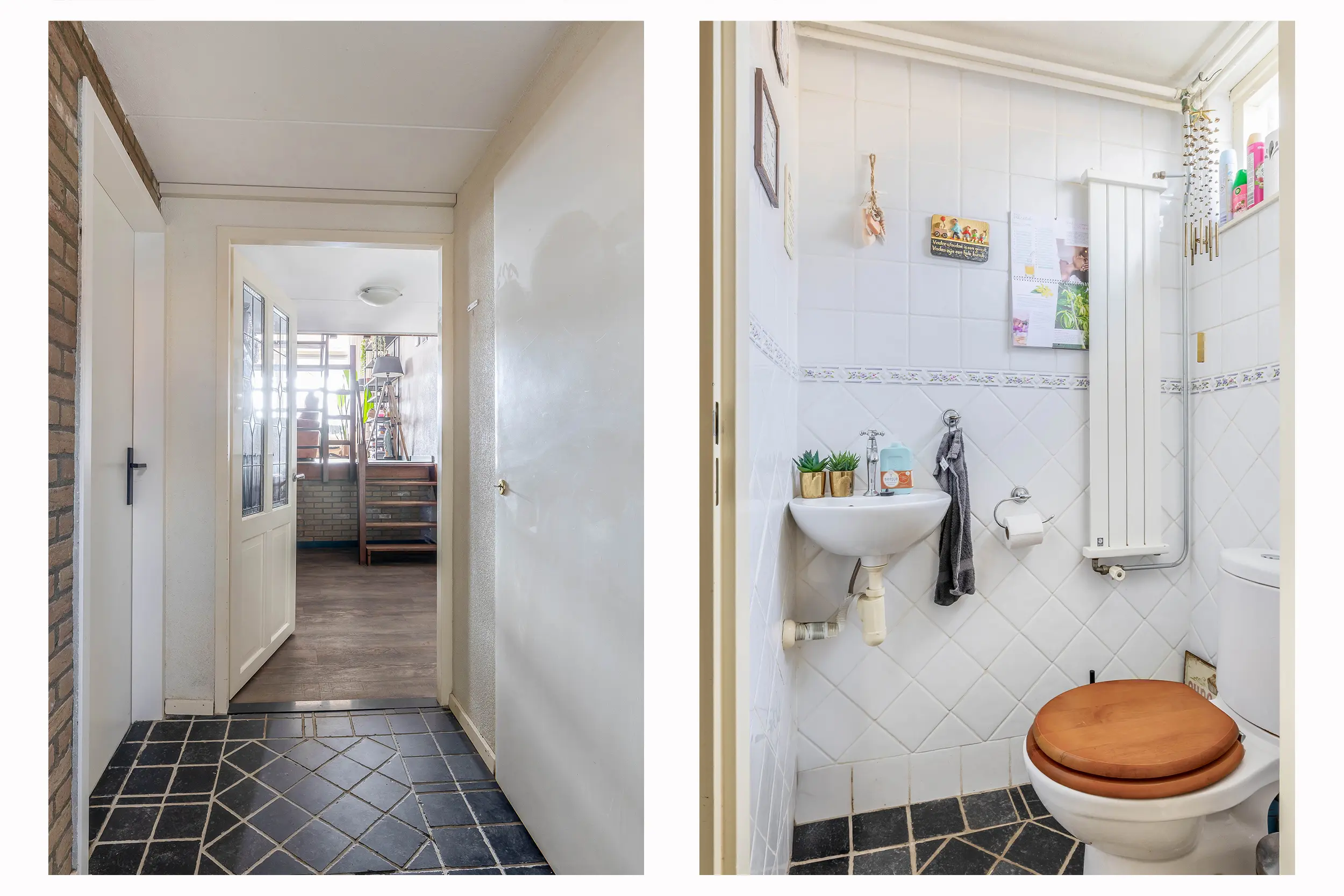 Bij binnenkomst betreedt u de hal, waar zich het separate toilet met fonteintje, een praktische bergkast en een multifunctionele ruimte bevinden. Vanuit deze hal bereikt u via een tweede hal het trappetje dat toegang geeft tot het eerste woonniveau.