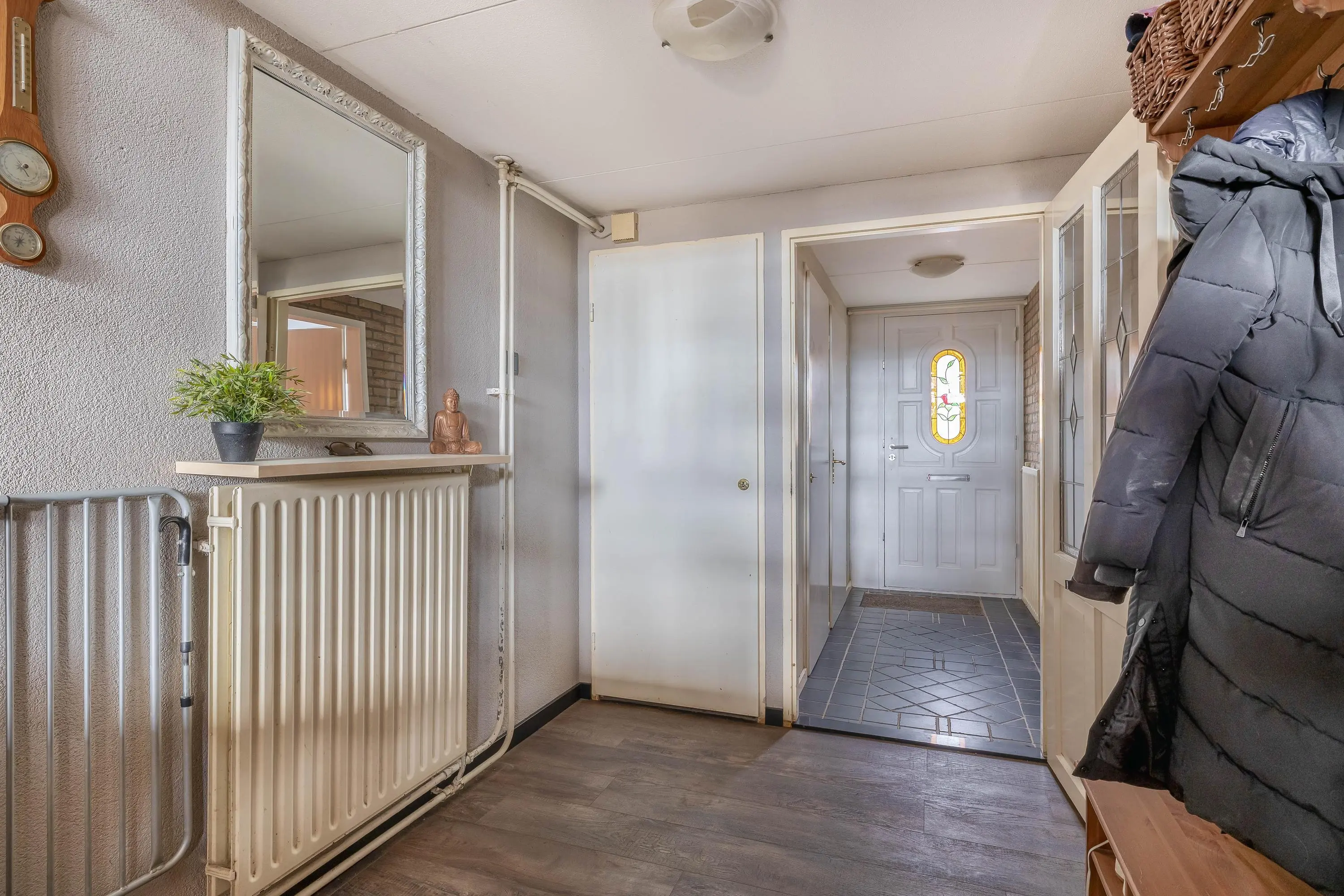 De voortuin is praktisch ingericht en biedt de mogelijkheid om op eigen grond te parkeren. De oprit is volledig bestraat, waardoor je altijd een parkeerplek direct voor de deur hebt.