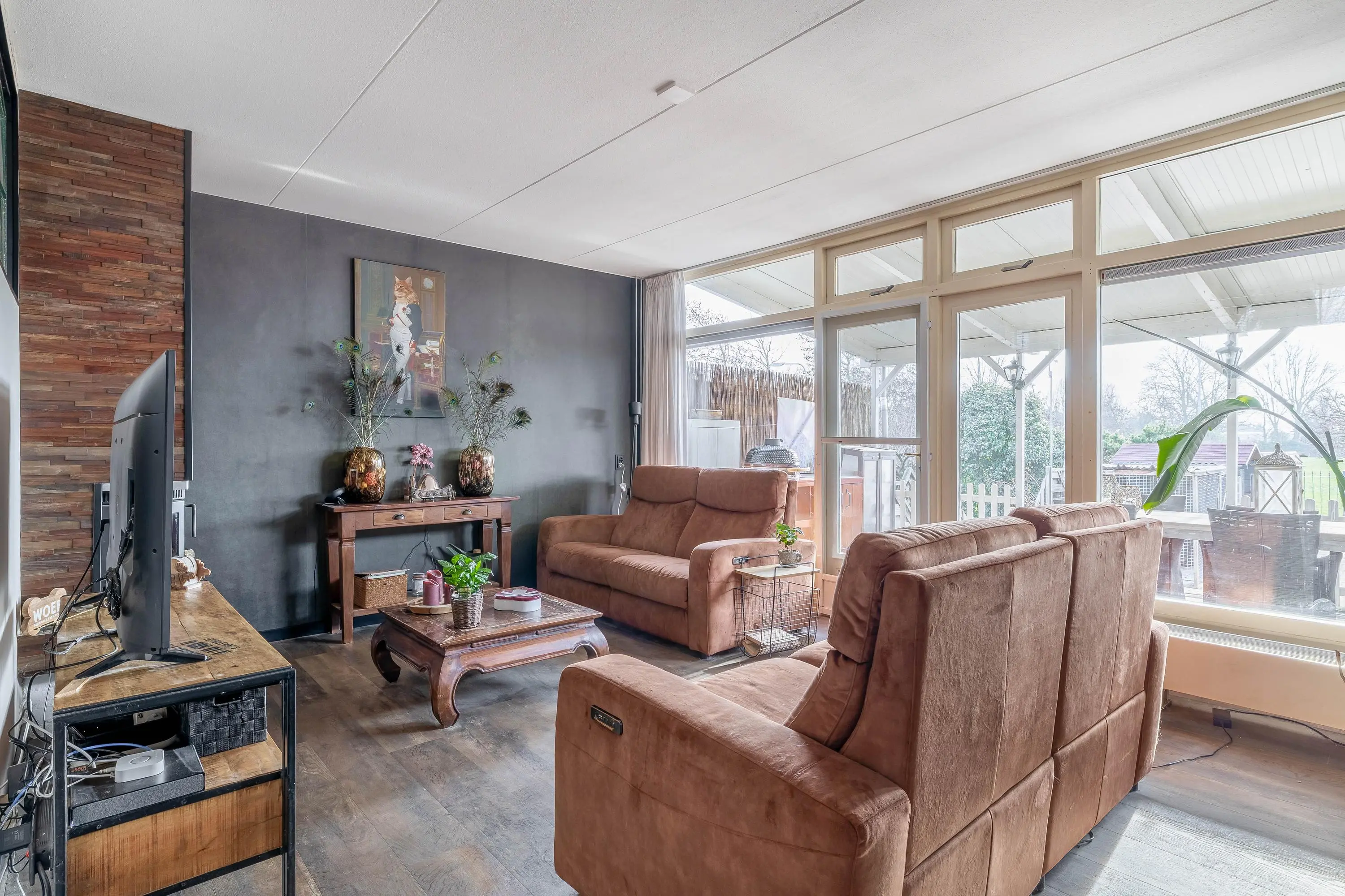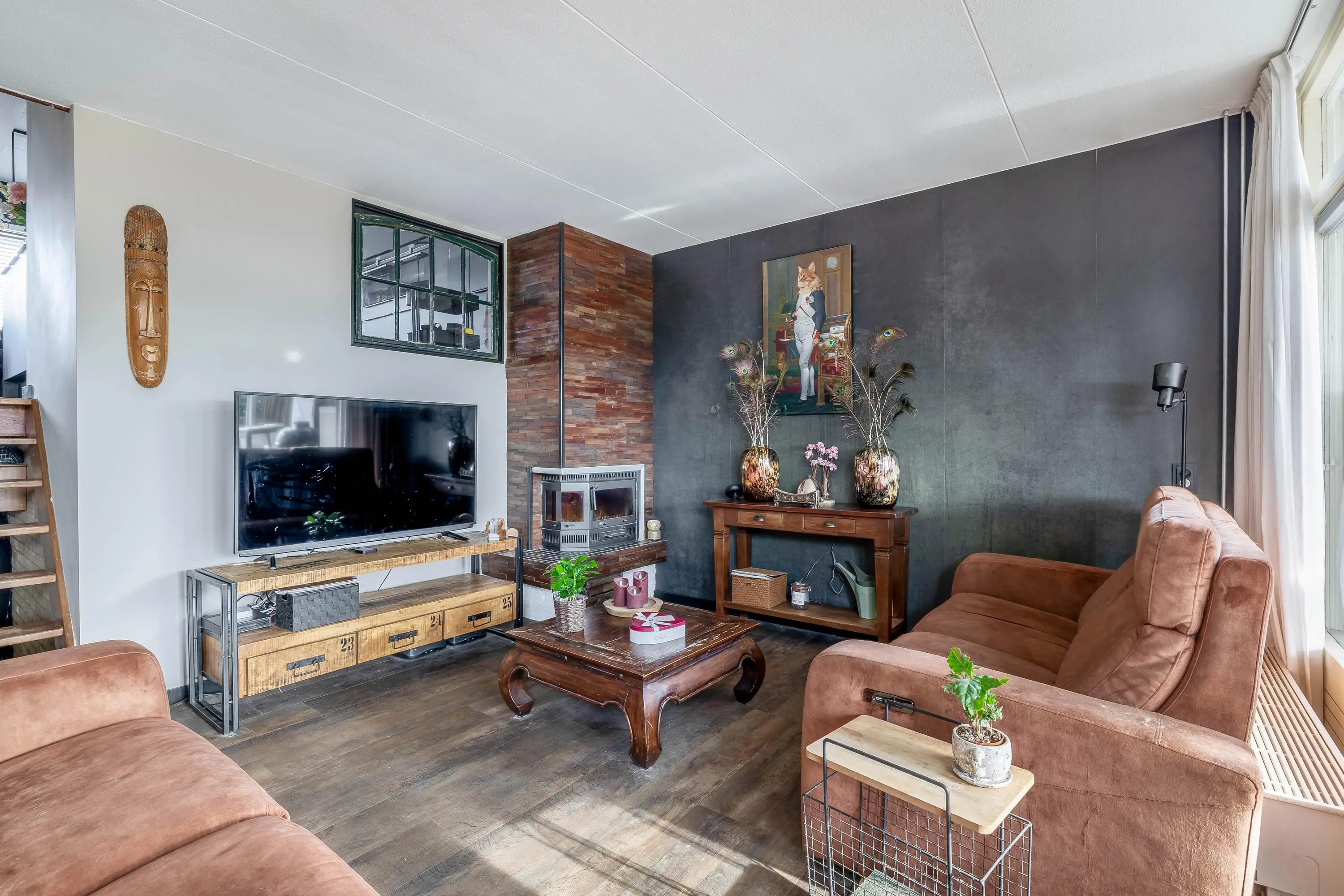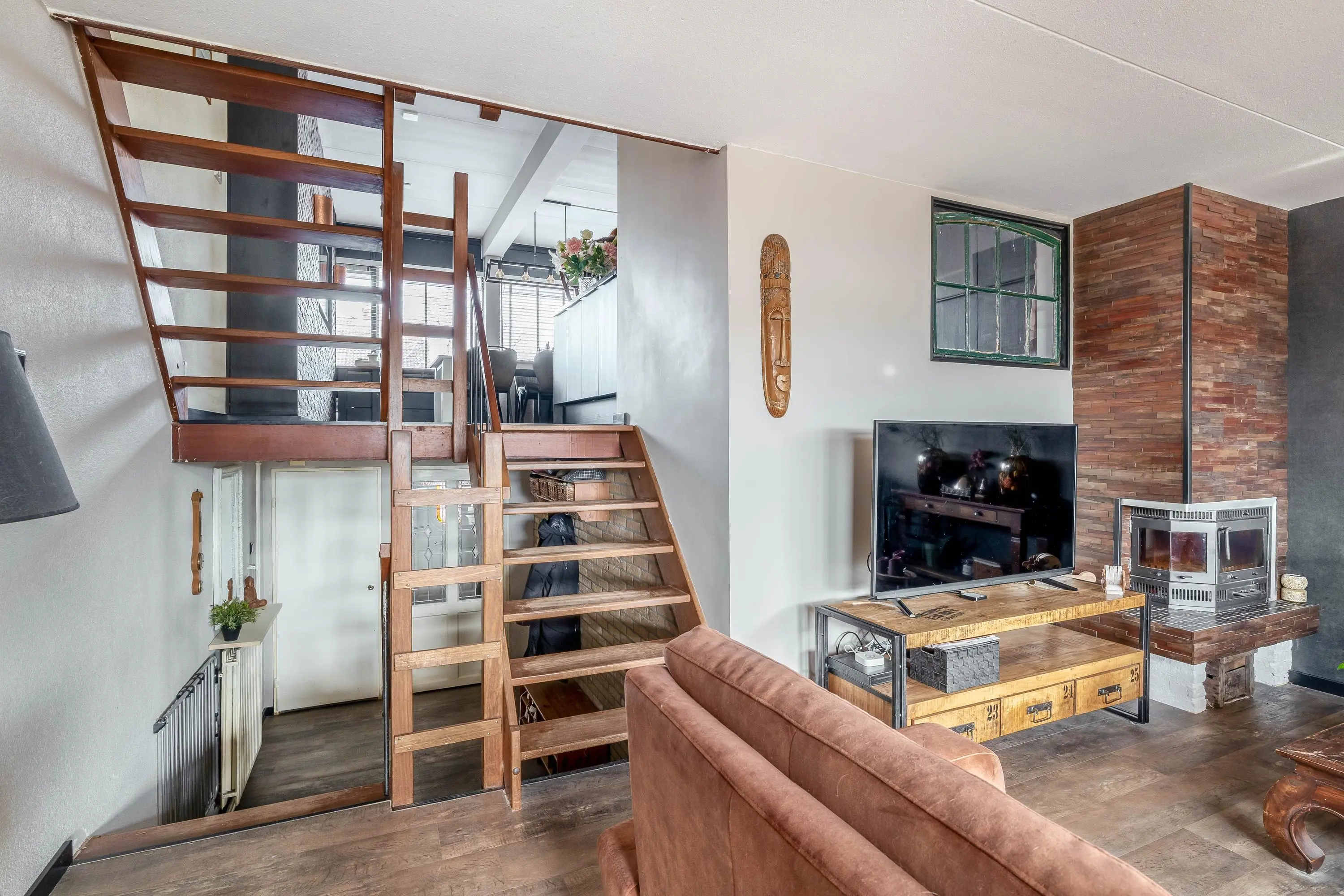 De woonkamer is afgewerkt met een nette PVC-vloer, die is doorgelegd naar het bovengelegen niveau waar de keuken zich bevindt, wat zorgt voor een rustige en moderne uitstraling.