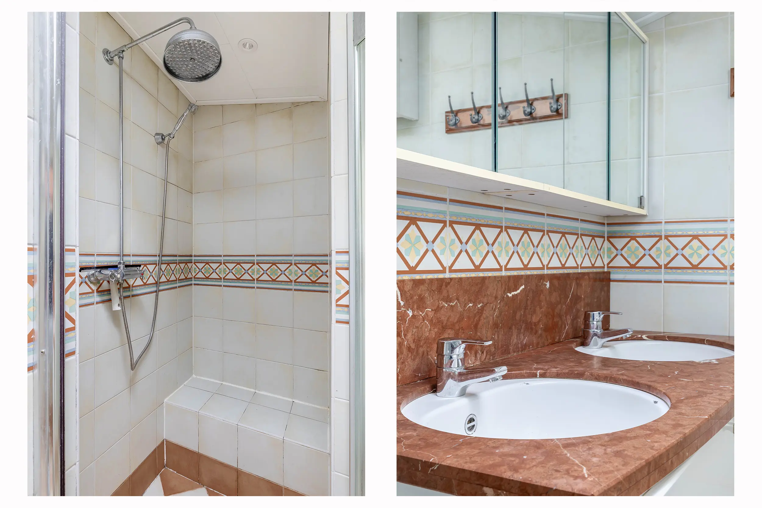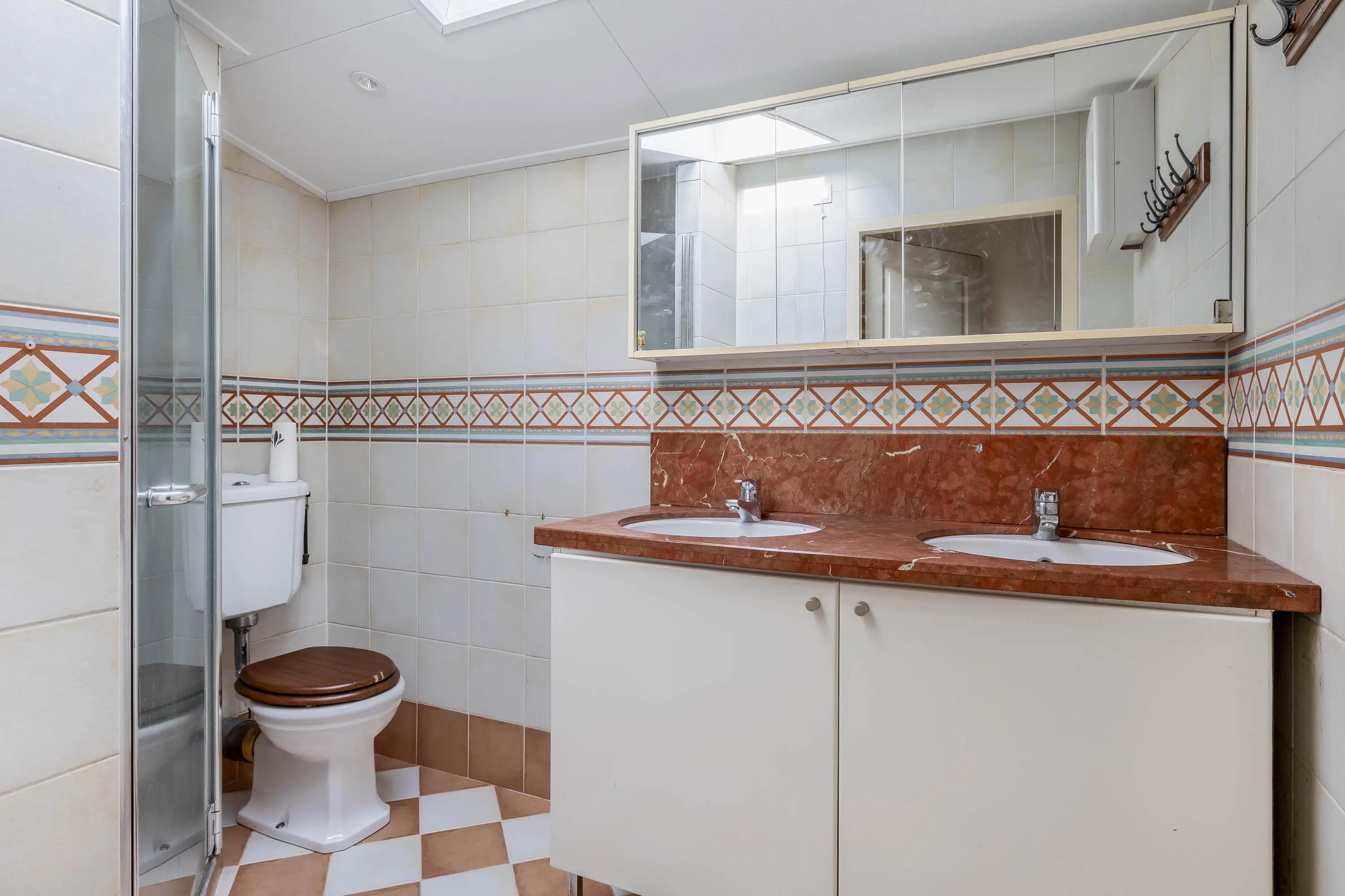De volledig betegelde badkamer is uitgerust met een douche, toilet en een wastafelmeubel met dubbele wastafel. Dankzij het aanwezige dakraam profiteert de badkamer van natuurlijke lichtinval en ventilatie.