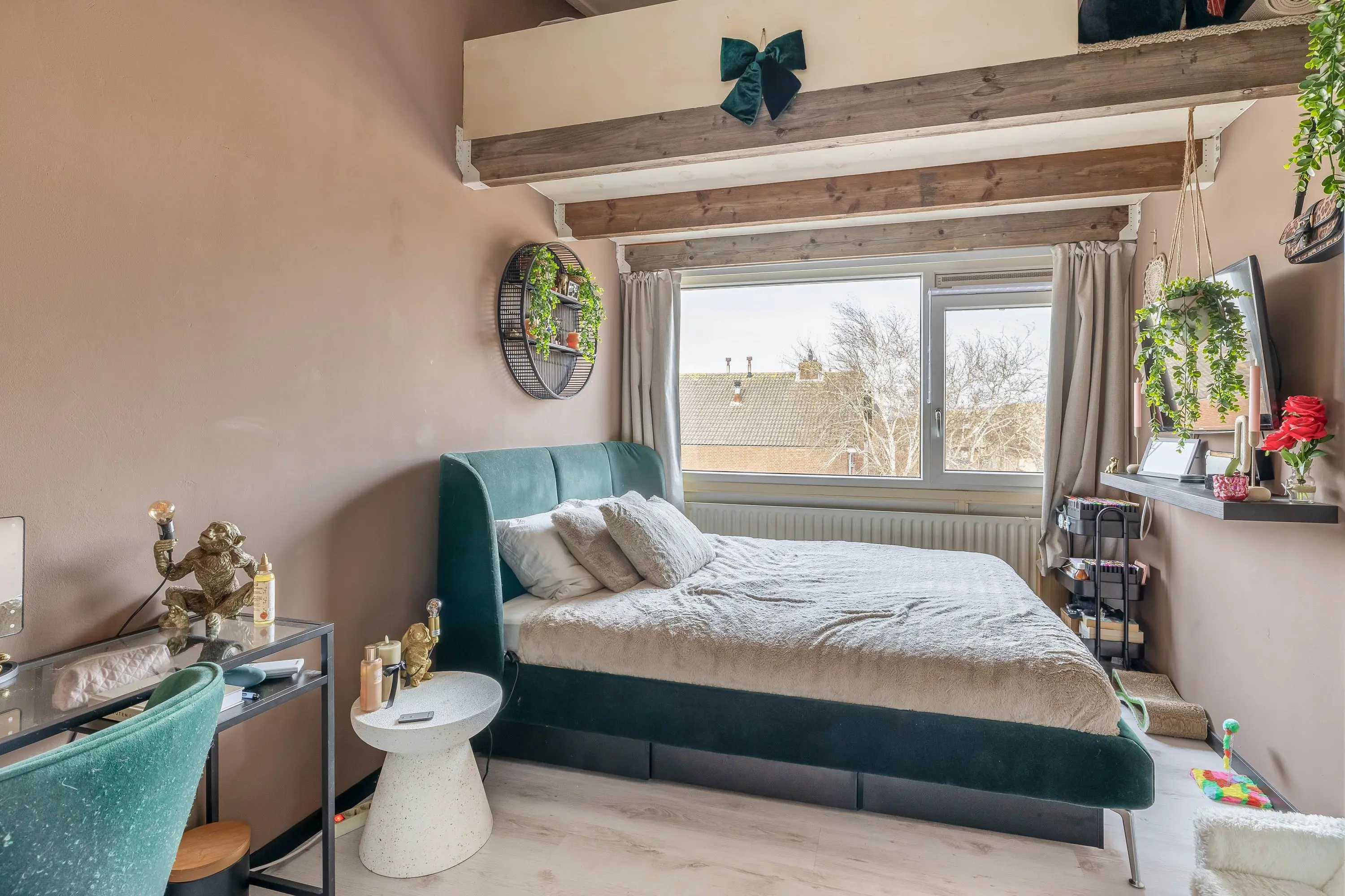 De royale hoofdslaapkamer is gelegen aan de achterzijde van de woning en heeft een oppervlakte van circa 21m². Dankzij de grote raampartijen geniet de kamer van een overvloed aan natuurlijke lichtinval. Het raam is voorzien van een rolluik, wat zorgt voor extra comfort en optimale verduistering. Daarnaast beschikt de slaapkamer over airconditioning, waardoor het binnenklimaat het hele jaar door aangenaam is. Vanuit de kamer heeft u bovendien een fraai uitzicht over het vrije groen.