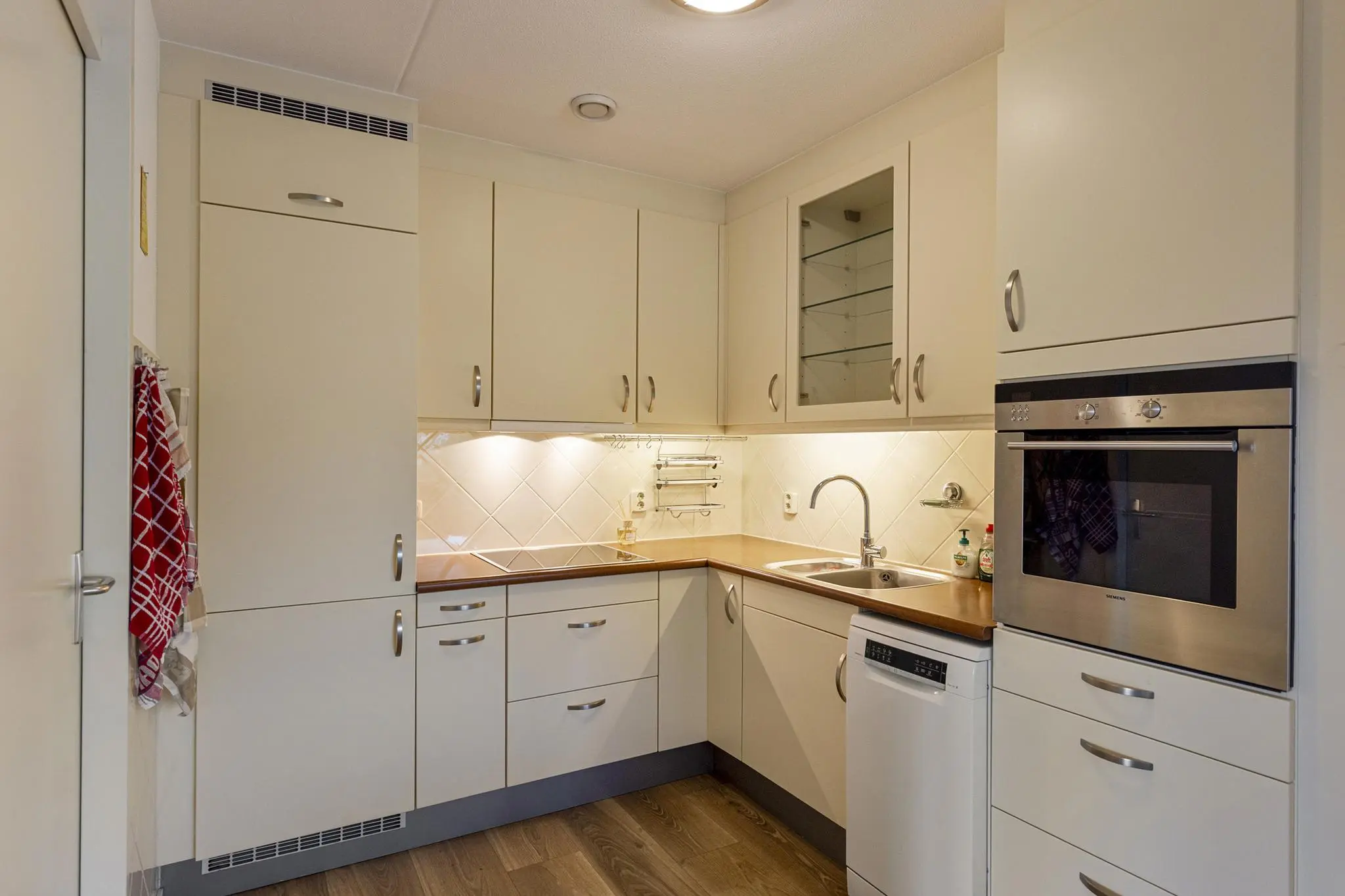 Vervolgens loopt u door naar de lichte living, waar u als eerste de open keuken treft. Deze is uitgerust met een spoelbak, inductiekookplaat, vaatwasser, oven en koel-/vriescombinatie en biedt bovendien voldoende opbergruimte.