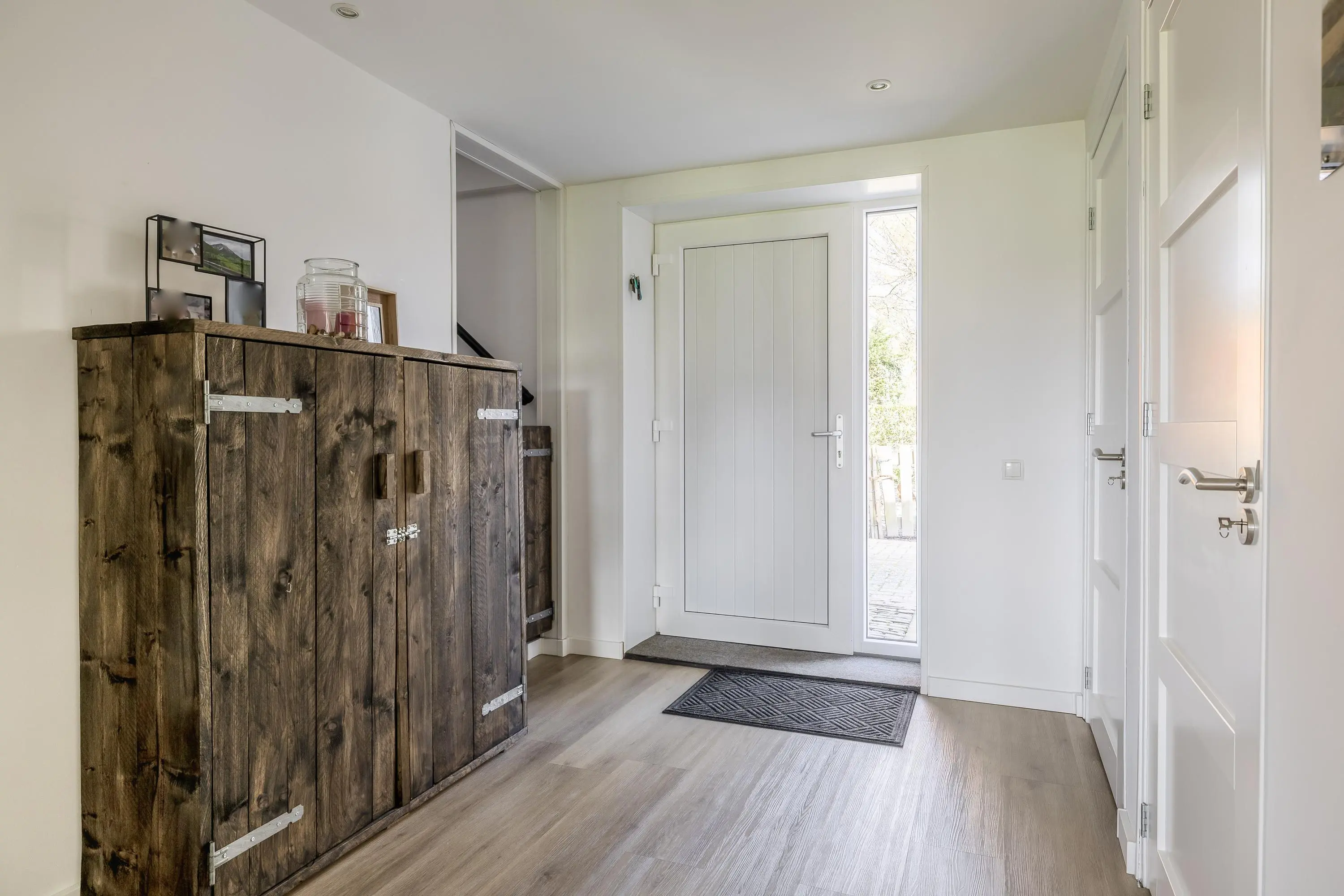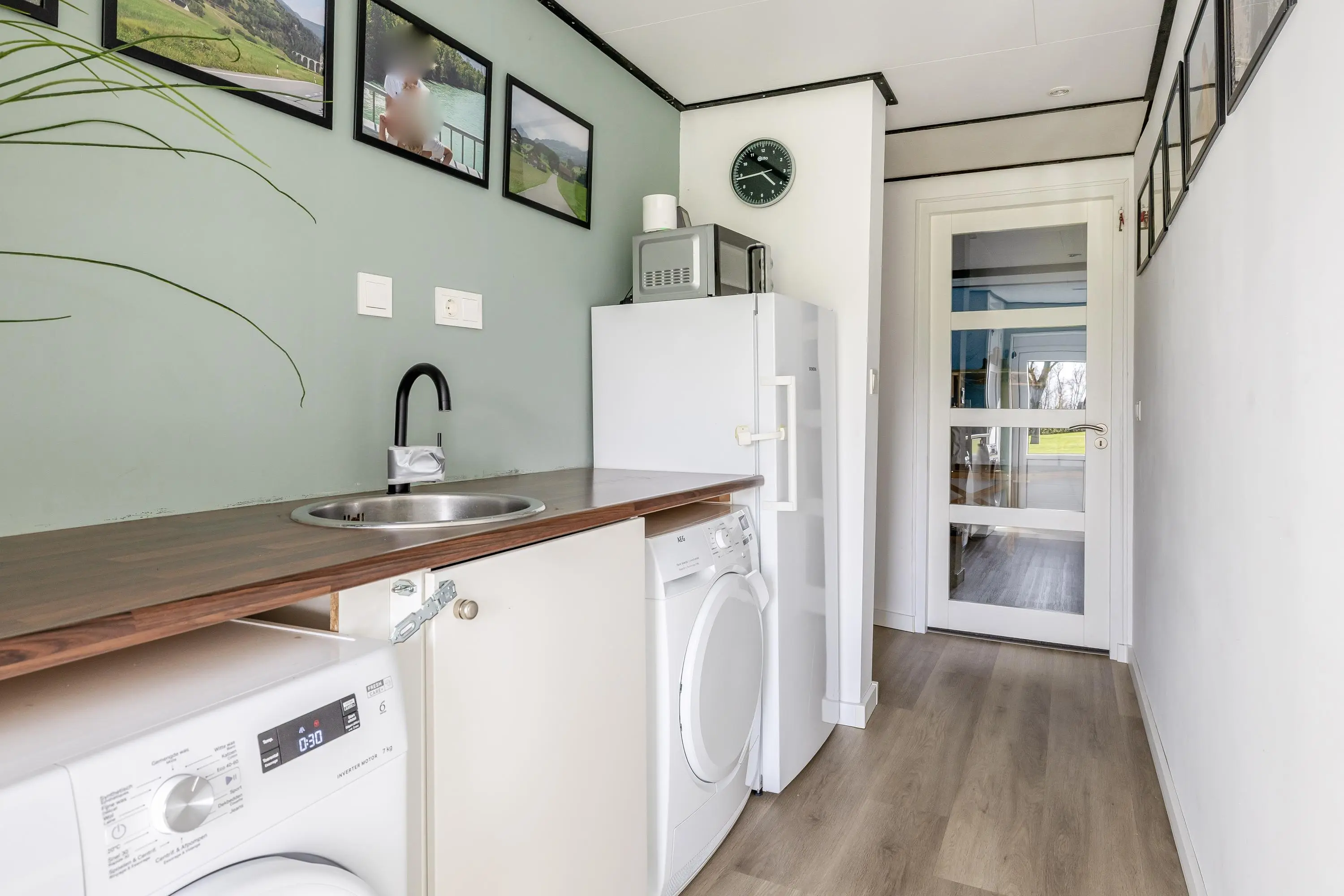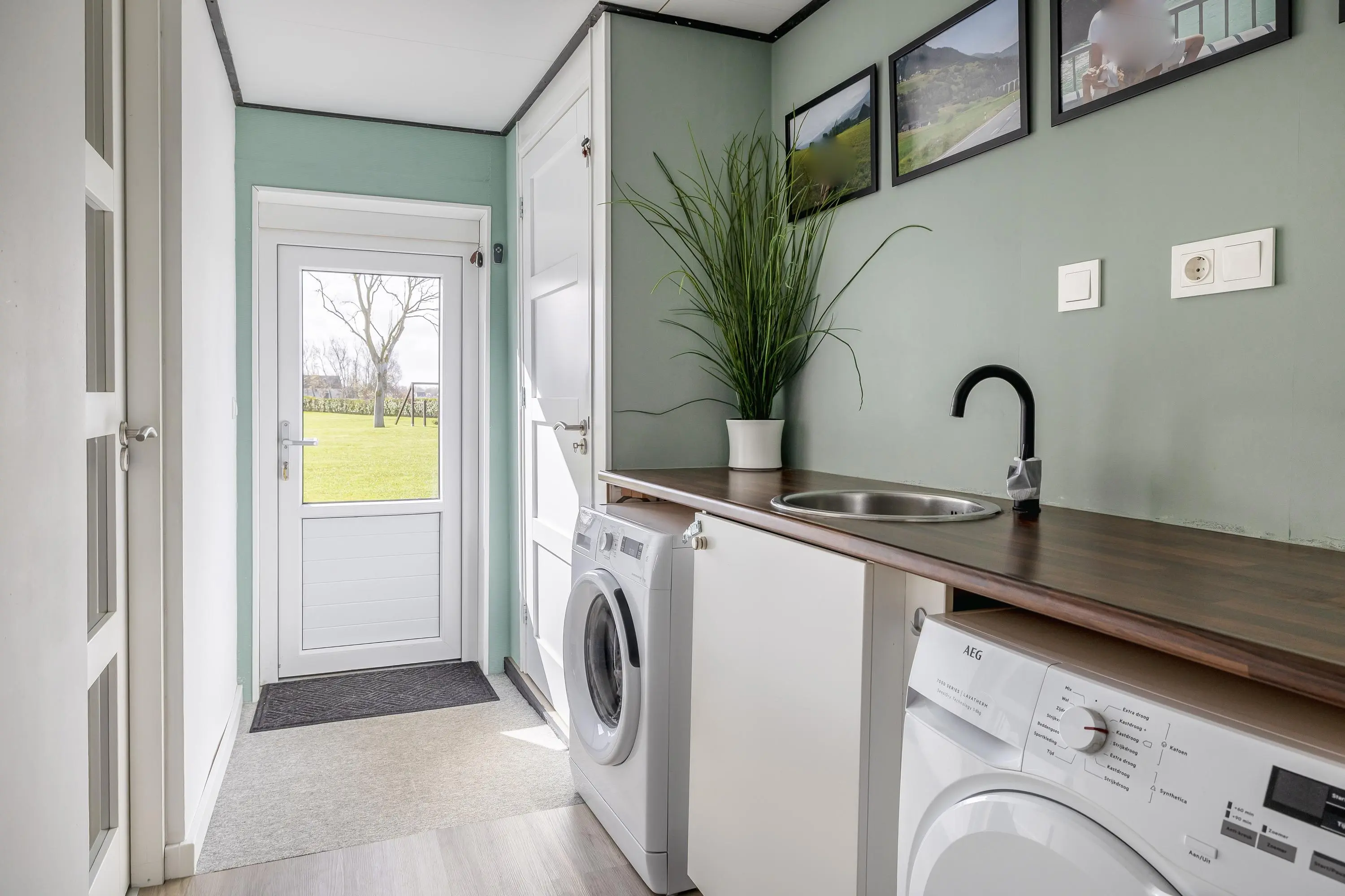 Een groot pluspunt van de indeling is de aparte bijkeuken. Hier bevinden zich de aansluitingen voor de wasmachine en droger onder een praktisch werkblad met spoelbak, evenals een aansluiting voor een extra koelkast of vriezer. De cv-installatie is netjes weggewerkt in een inbouwkast. Vanuit de bijkeuken heeft u via een enkele deur direct toegang tot de buitenruimte.