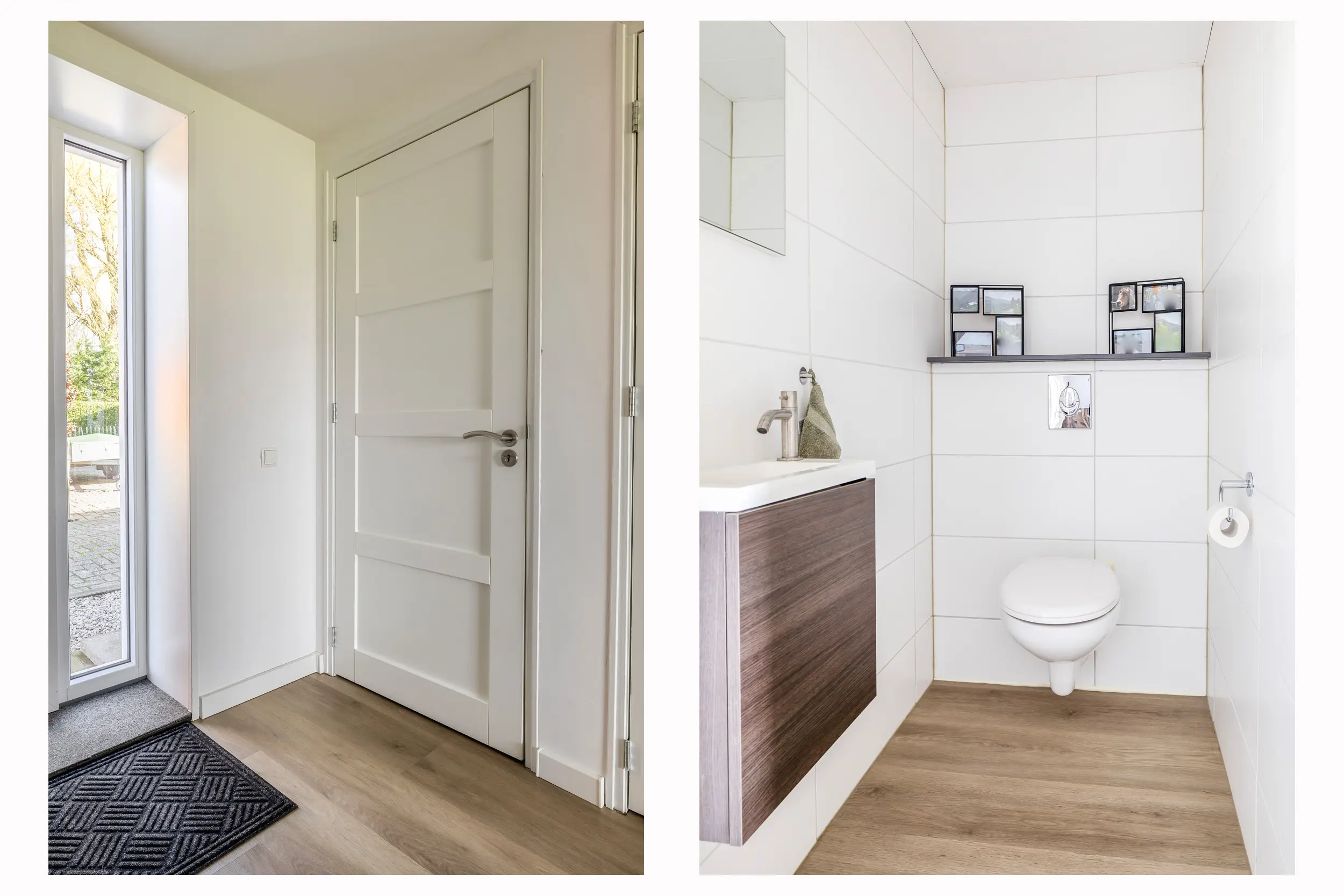Bij binnenkomst via de centrale entree/hal wordt direct de prettige indeling van de begane grond duidelijk. Vanuit deze lichte ontvangsthal heeft u toegang tot de diverse vertrekken op deze woonlaag, ook bevindt zich hier de trapopgang naar de eerste verdieping. Daarnaast biedt de hal toegang tot een toilet met fonteintje en de nette badkamer. Deze badkamer is uitgevoerd met een ligbad, een comfortabele inloopdouche en een stijlvolle wastafelmeubel.