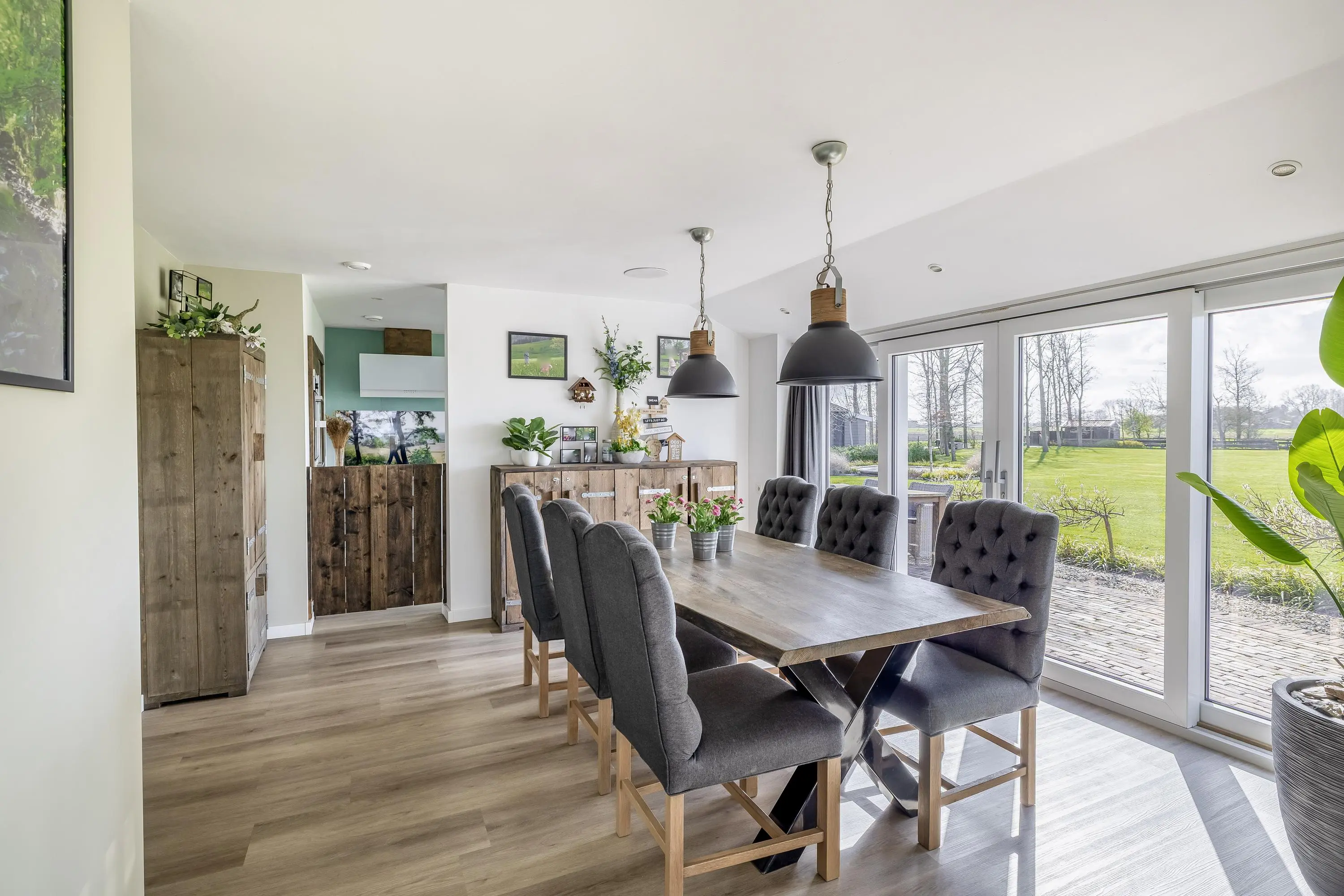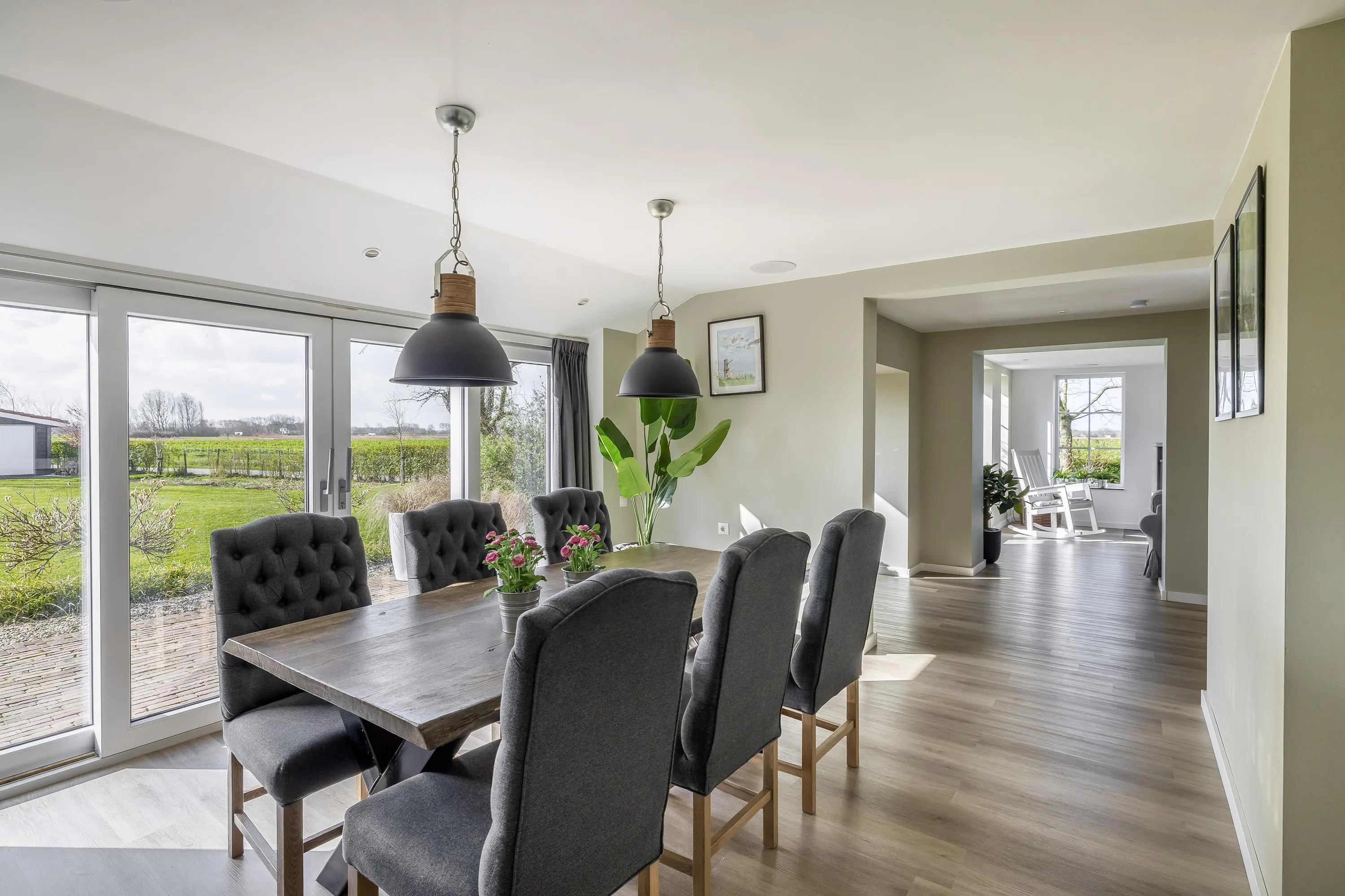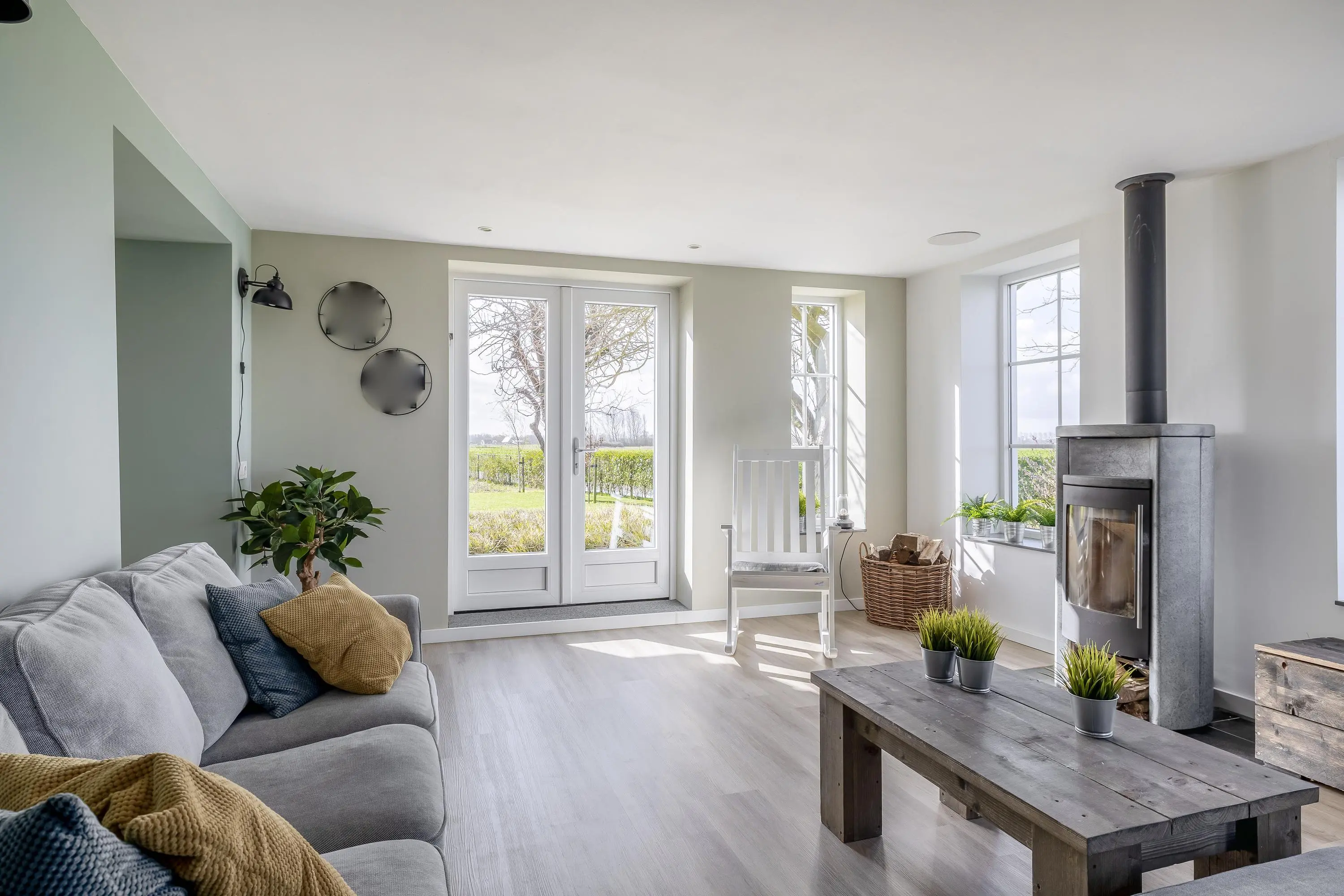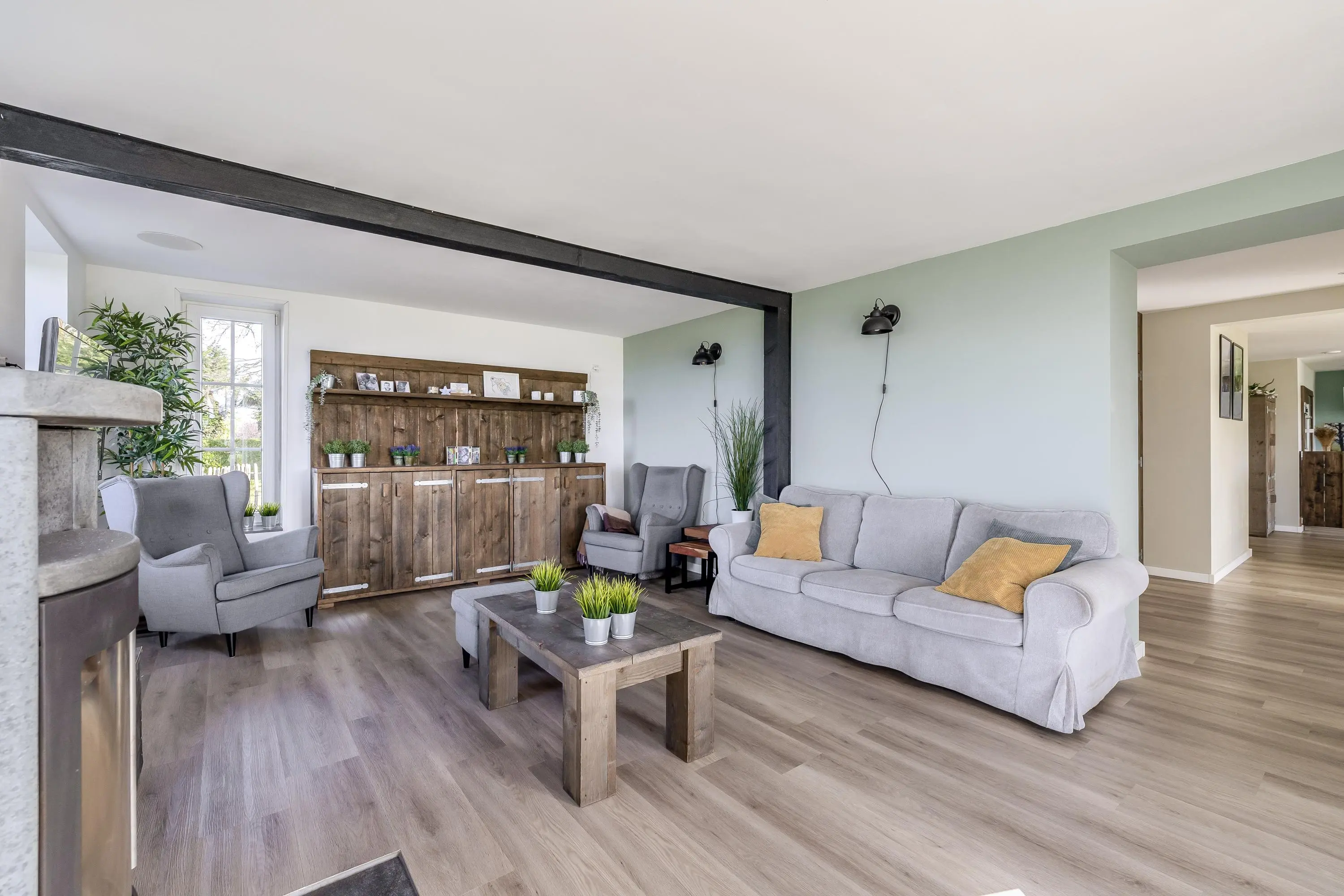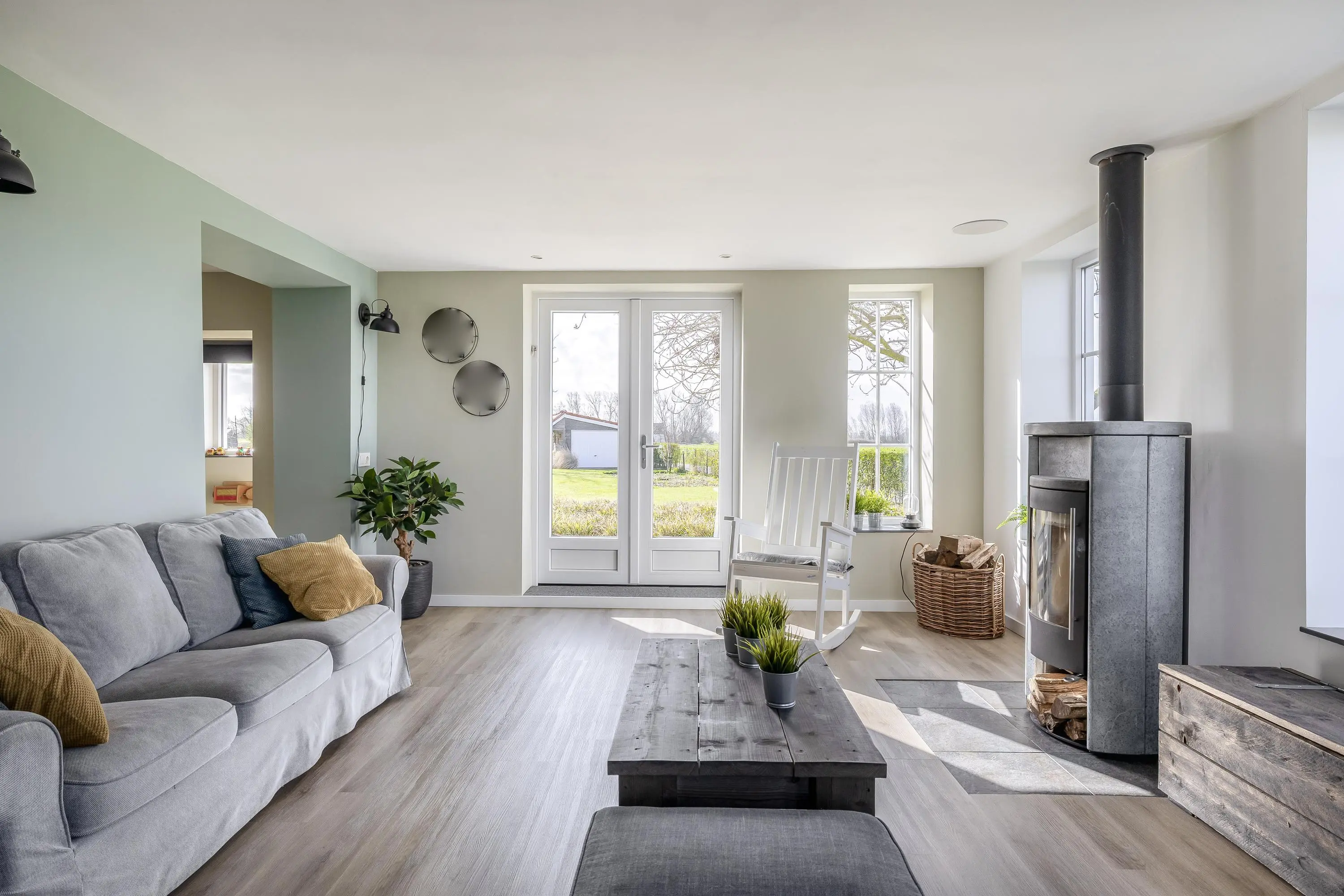 De woonkamer aan de voorzijde van de woning is een leefruimte waar u zich direct thuis voelt. Dankzij de grote raampartijen geniet u hier van een schitterend, onbelemmerd uitzicht over de eigen tuin en de omliggende landerijen. De woonkamer is strak afgewerkt met gestuukte wanden en plafonds en voorzien van een moderne PVC-vloer met vloerverwarming, die is doorgelegd over de gehele begane grond. Het subtiel geïntegreerde audiosysteem in het plafond maakt de woonbeleving compleet. Daarnaast is er een houtkachel met speksteen omlijsting aanwezig, wat extra warmte en sfeer toevoegt aan de ruimte. Ook de zwarte houten balk brengt een karakteristiek element naar voren. Middels de openslaande deuren is er toegang tot de buitenruimte, waarbij binnen en buiten in elkaar overlopen.
