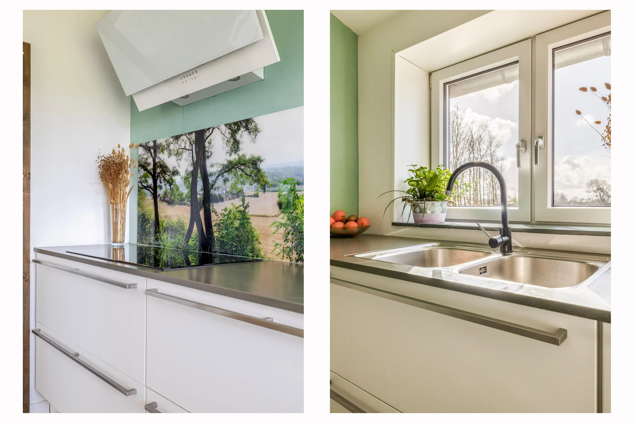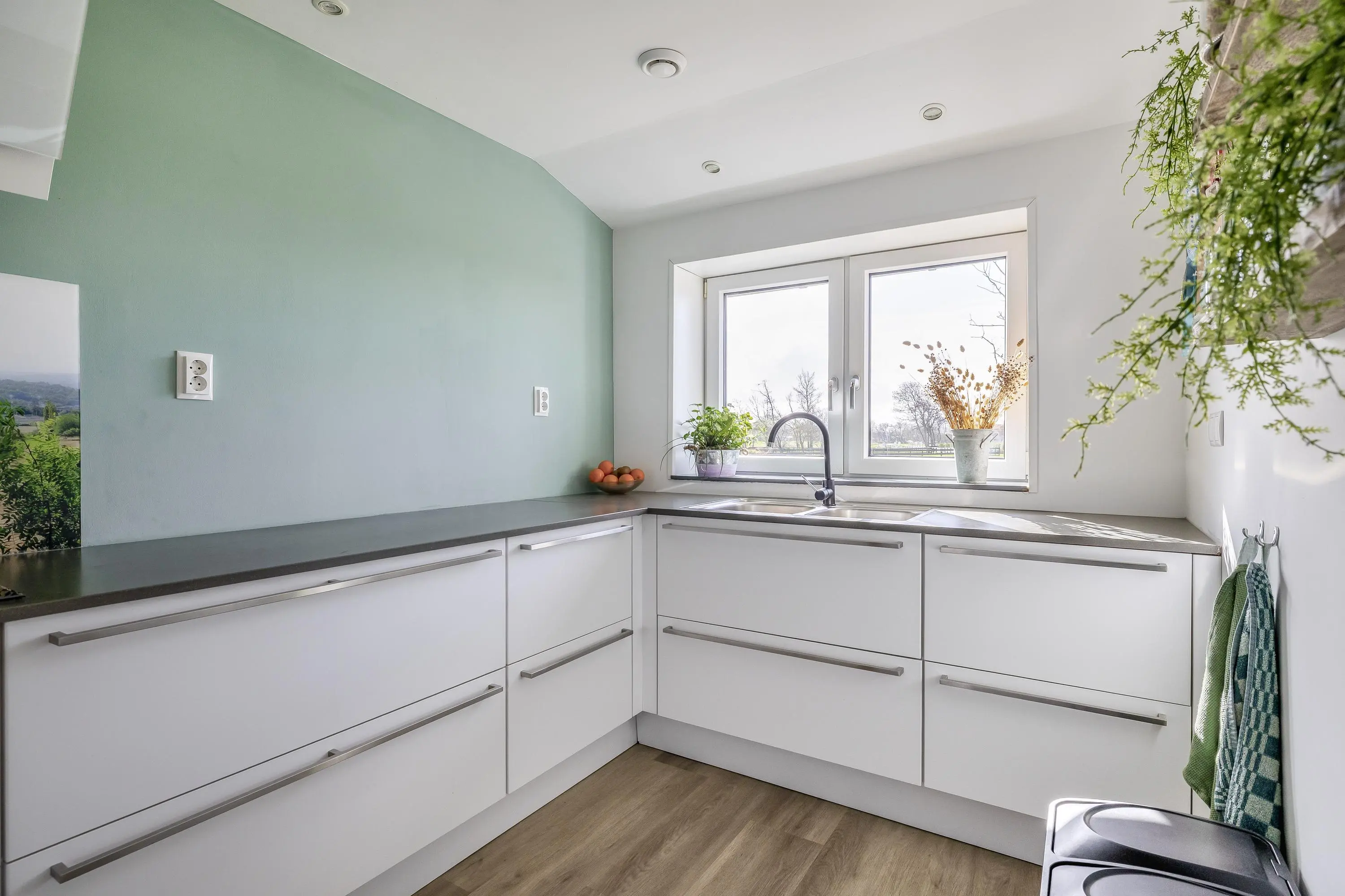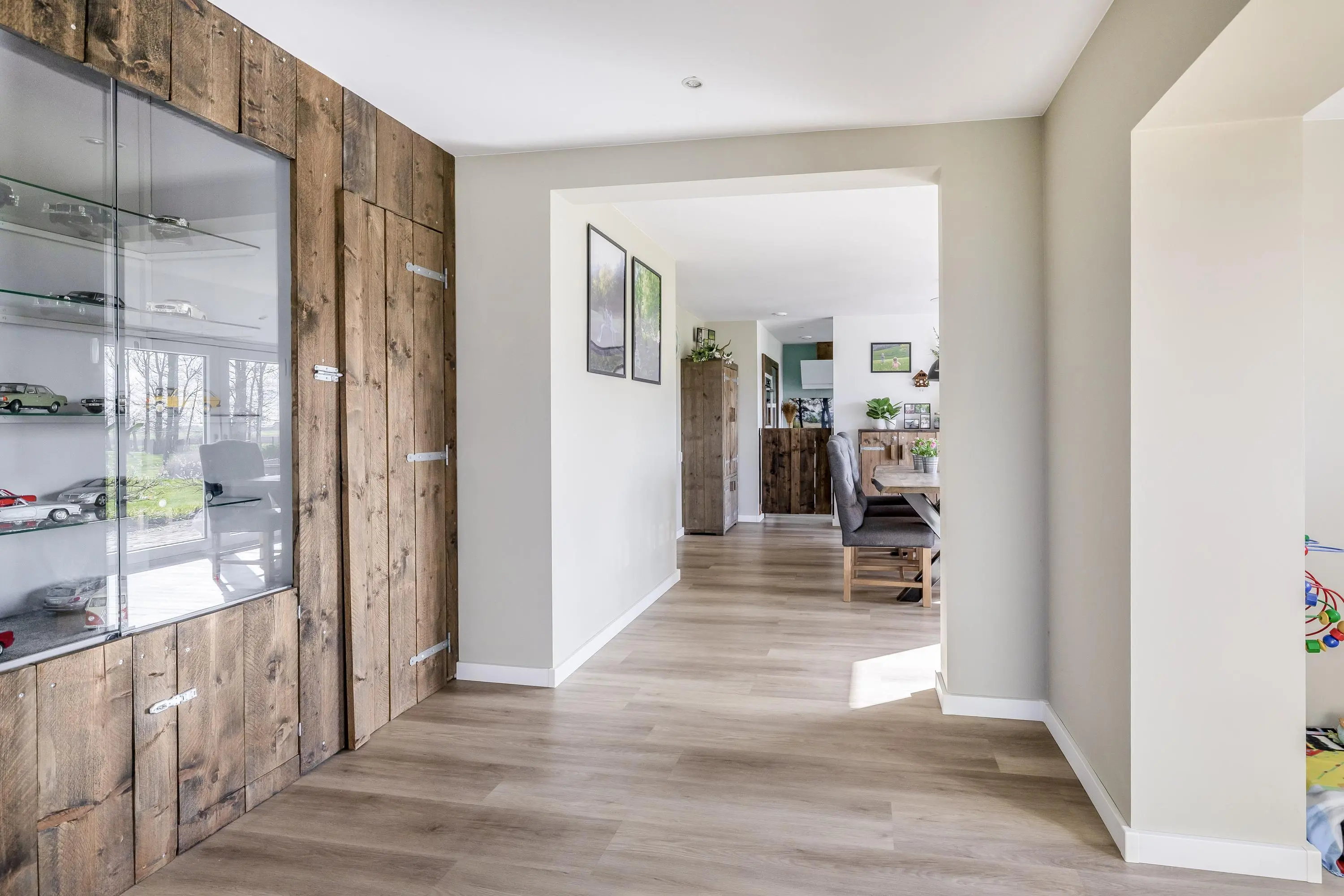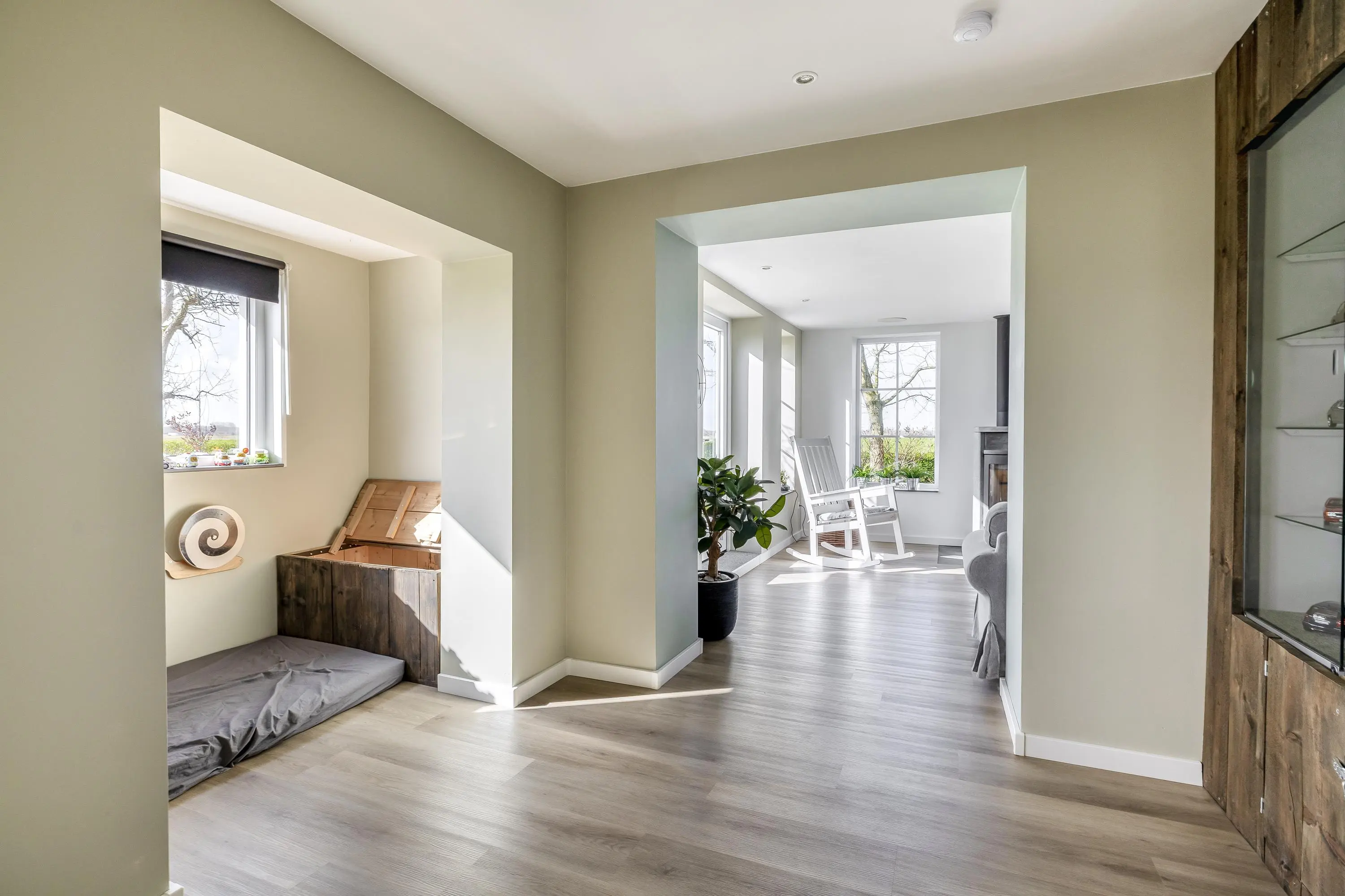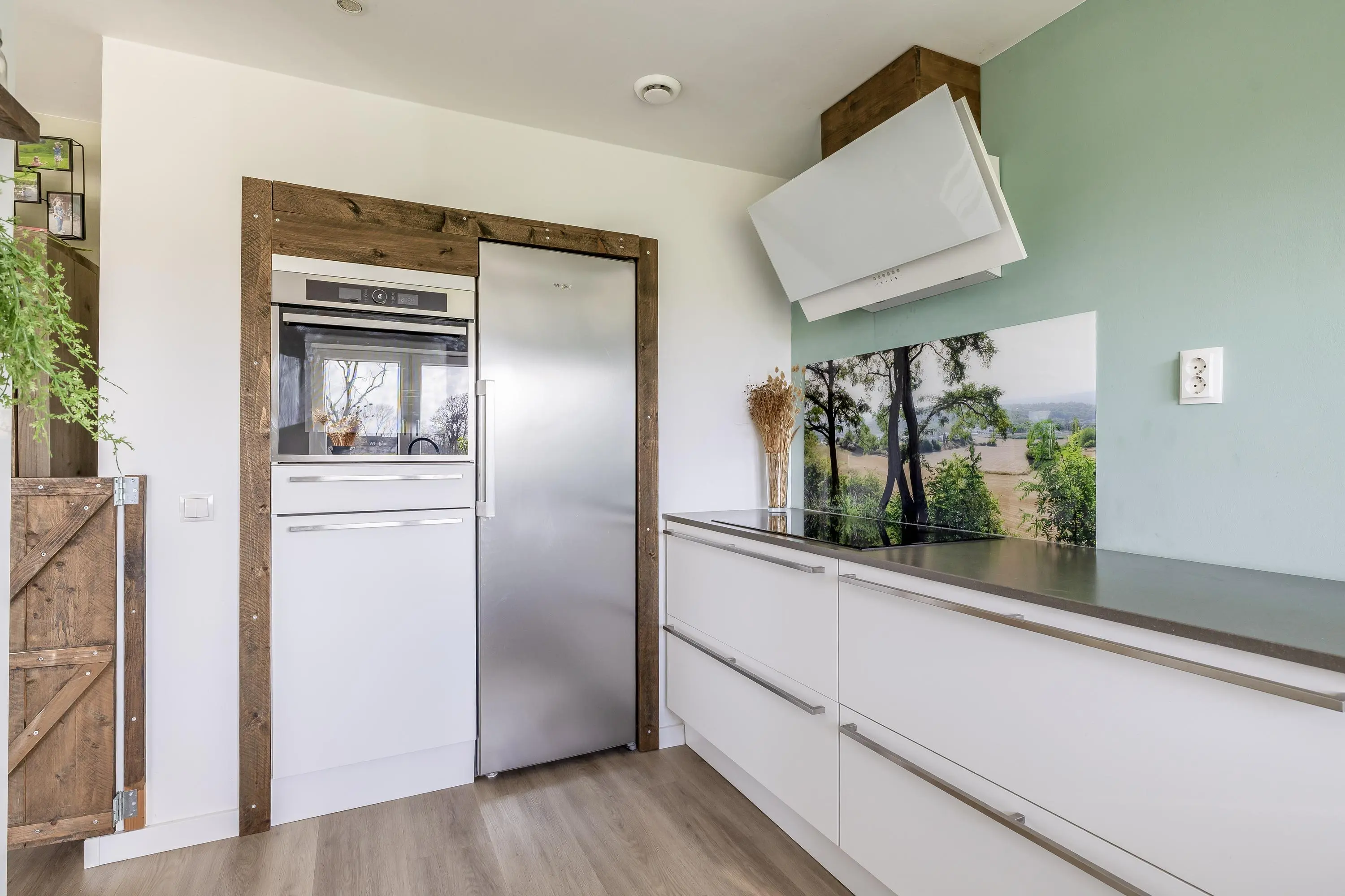 De woonkamer aan de voorzijde van de woning is een leefruimte waar u zich direct thuis voelt. Dankzij de grote raampartijen geniet u hier van een schitterend, onbelemmerd uitzicht over de eigen tuin en de omliggende landerijen. De woonkamer is strak afgewerkt met gestuukte wanden en plafonds en voorzien van een moderne PVC-vloer met vloerverwarming, die is doorgelegd over de gehele begane grond. Het subtiel geïntegreerde audiosysteem in het plafond maakt de woonbeleving compleet. Daarnaast is er een houtkachel met speksteen omlijsting aanwezig, wat extra warmte en sfeer toevoegt aan de ruimte. Ook de zwarte houten balk brengt een karakteristiek element naar voren. Middels de openslaande deuren is er toegang tot de buitenruimte, waarbij binnen en buiten in elkaar overlopen.
