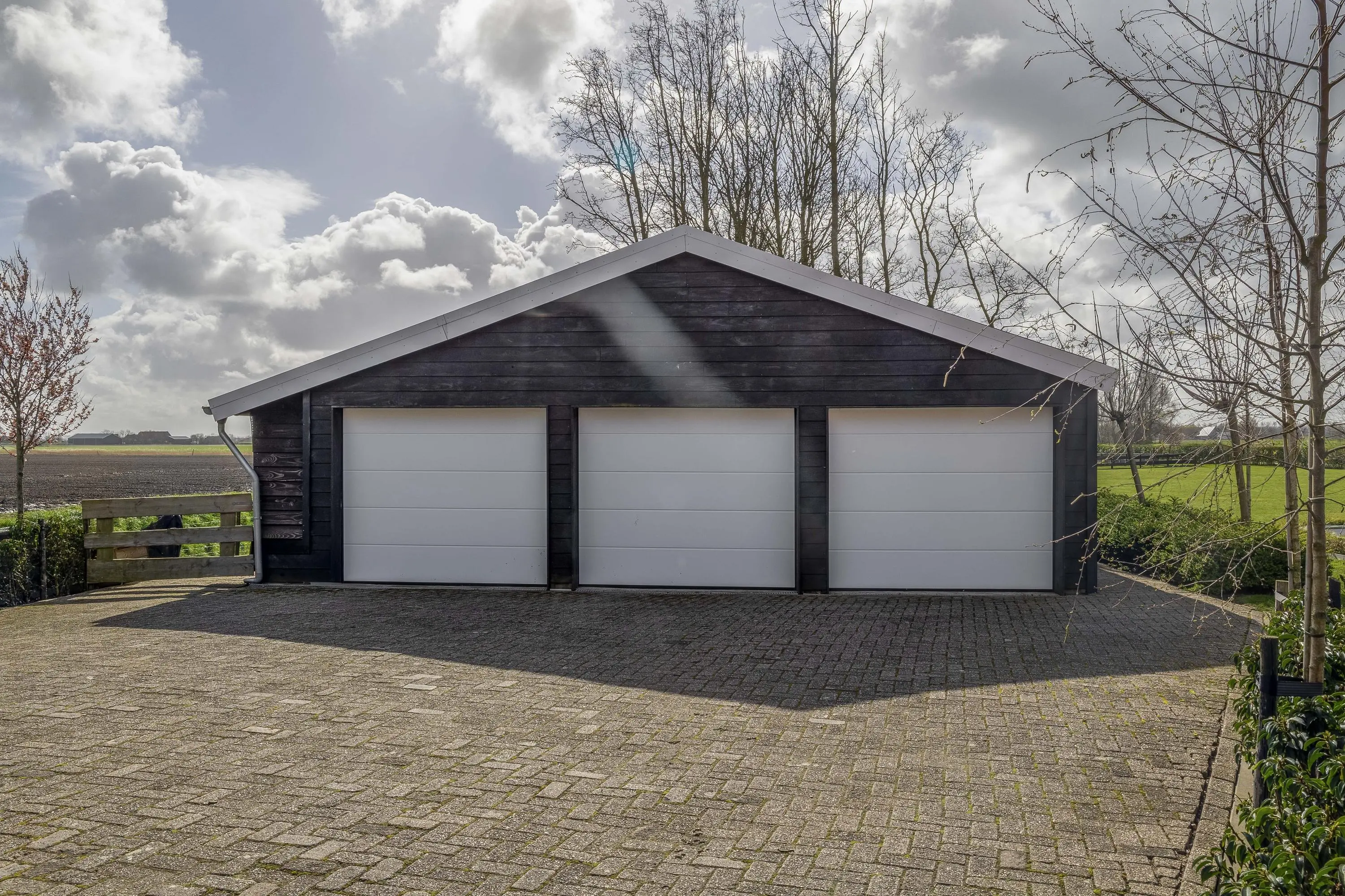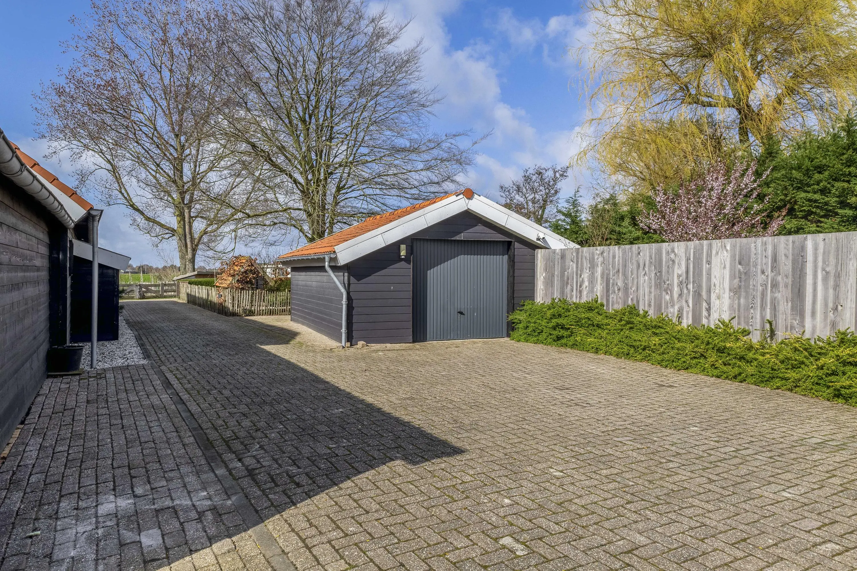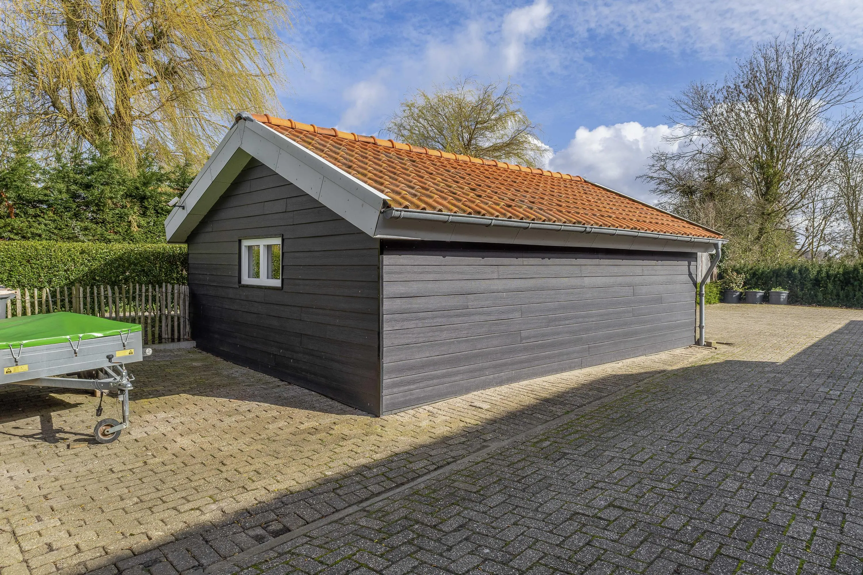 De functionele mogelijkheden worden verder versterkt door de diverse hoogwaardige bijgebouwen. De blikvanger is de riante, zwart gepotdekselde garage met drie brede elektrische roldeuren, perfect voor het stallen van voertuigen of de inrichting van een professionele werkplaats. Dankzij het royale, volledig bestrate plein tussen de woning en de bijgebouwen is er een overvloed aan parkeergelegenheid op eigen terrein. Verderop in de diepe tuin, omgeven door strakke hagen en volwassen bomen, vindt u nog diverse houten bergingen en een sfeervol tuinhuis met een eigen terras en speelgelegenheid. Of u nu droomt van het houden van dieren, een eigen rijbak, substantiële opslagruimte of simpelweg wilt genieten van uw eigen groene domein, dit perceel biedt de ruimte en de faciliteiten om al die dromen werkelijkheid te maken.