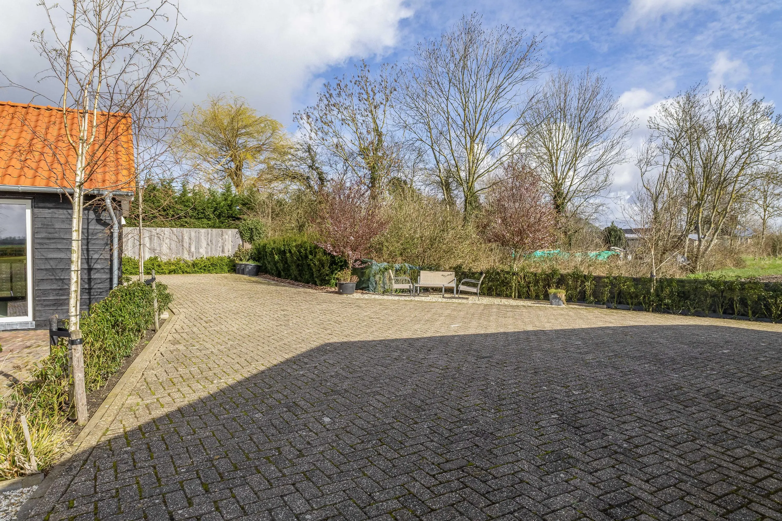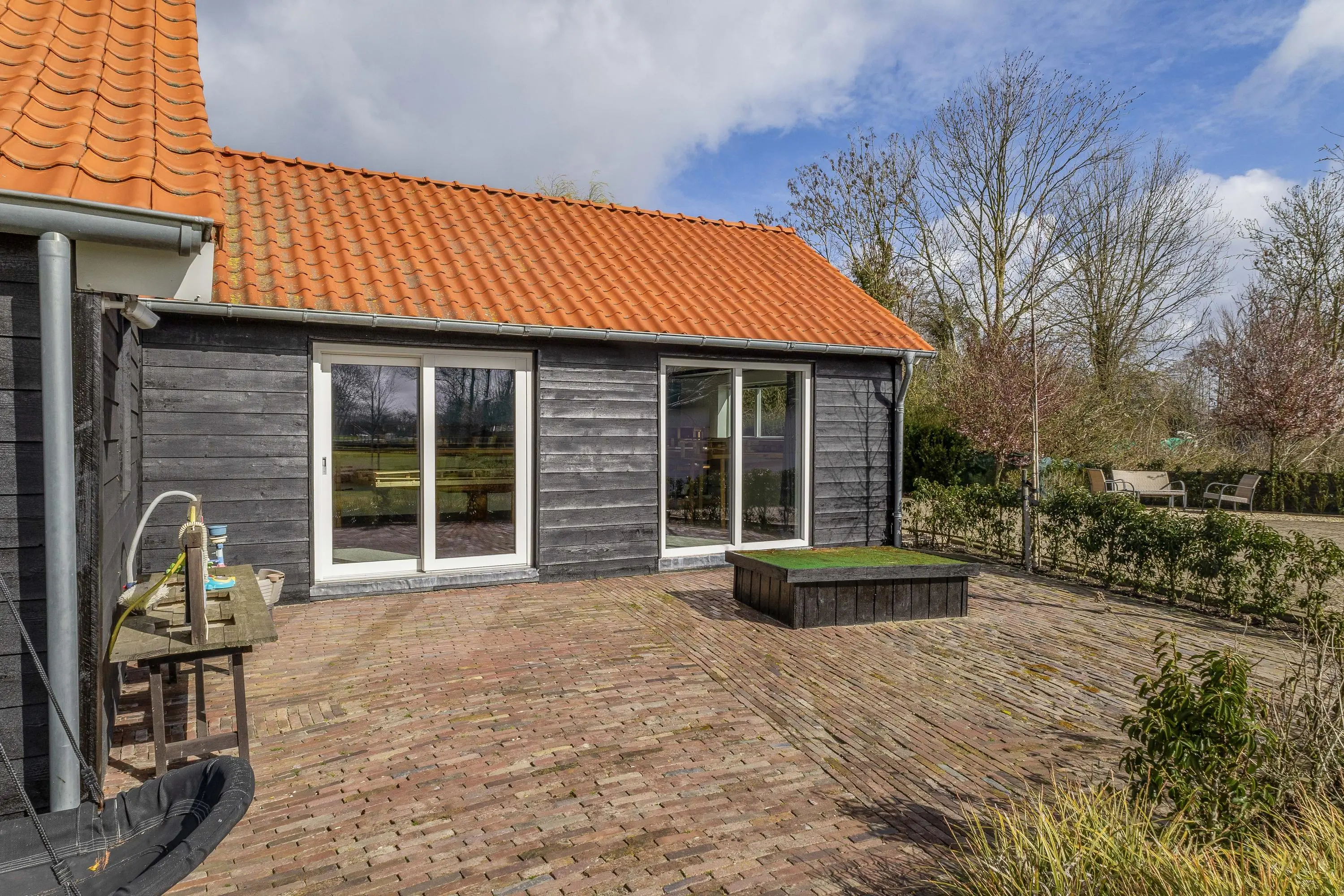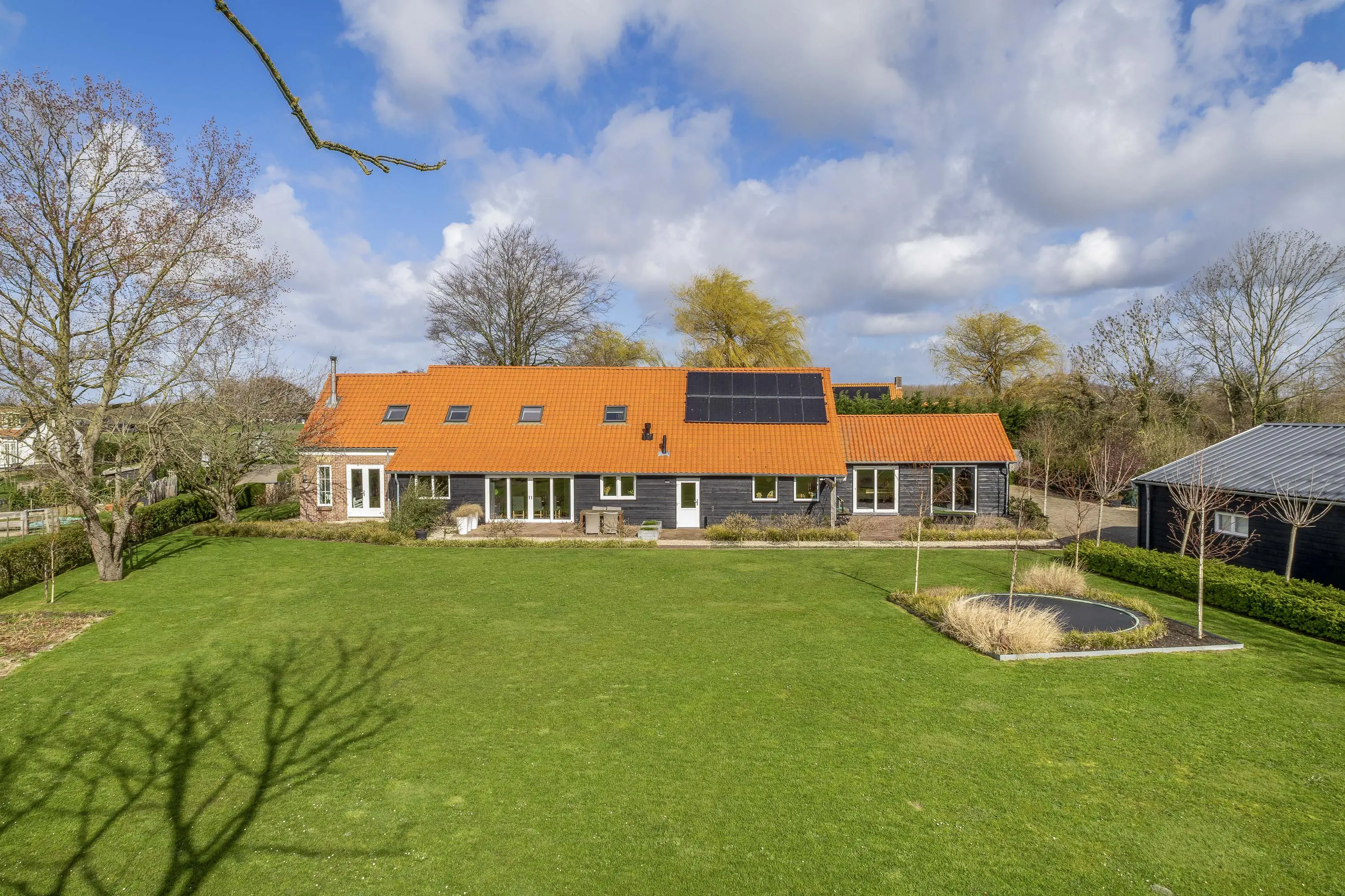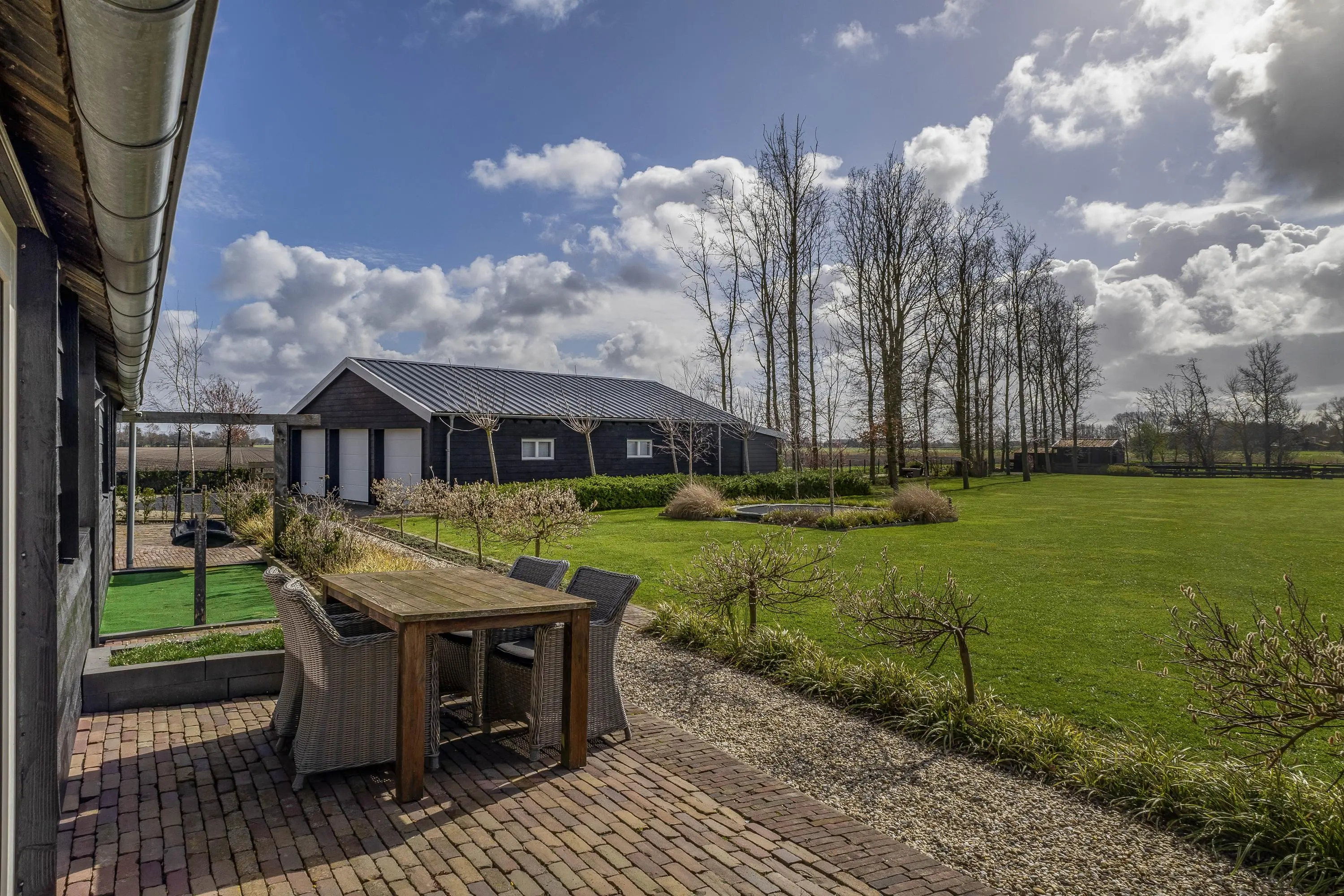 Direct achter de woning bevindt zich een royaal terras van robuuste klinkers, waar u in alle rust geniet van het uitzicht over uw eigen perceel. Voor de kinderen is er alle ruimte om te spelen, met als eyecatcher een strak in het gazon en geïntegreerde trampoline.