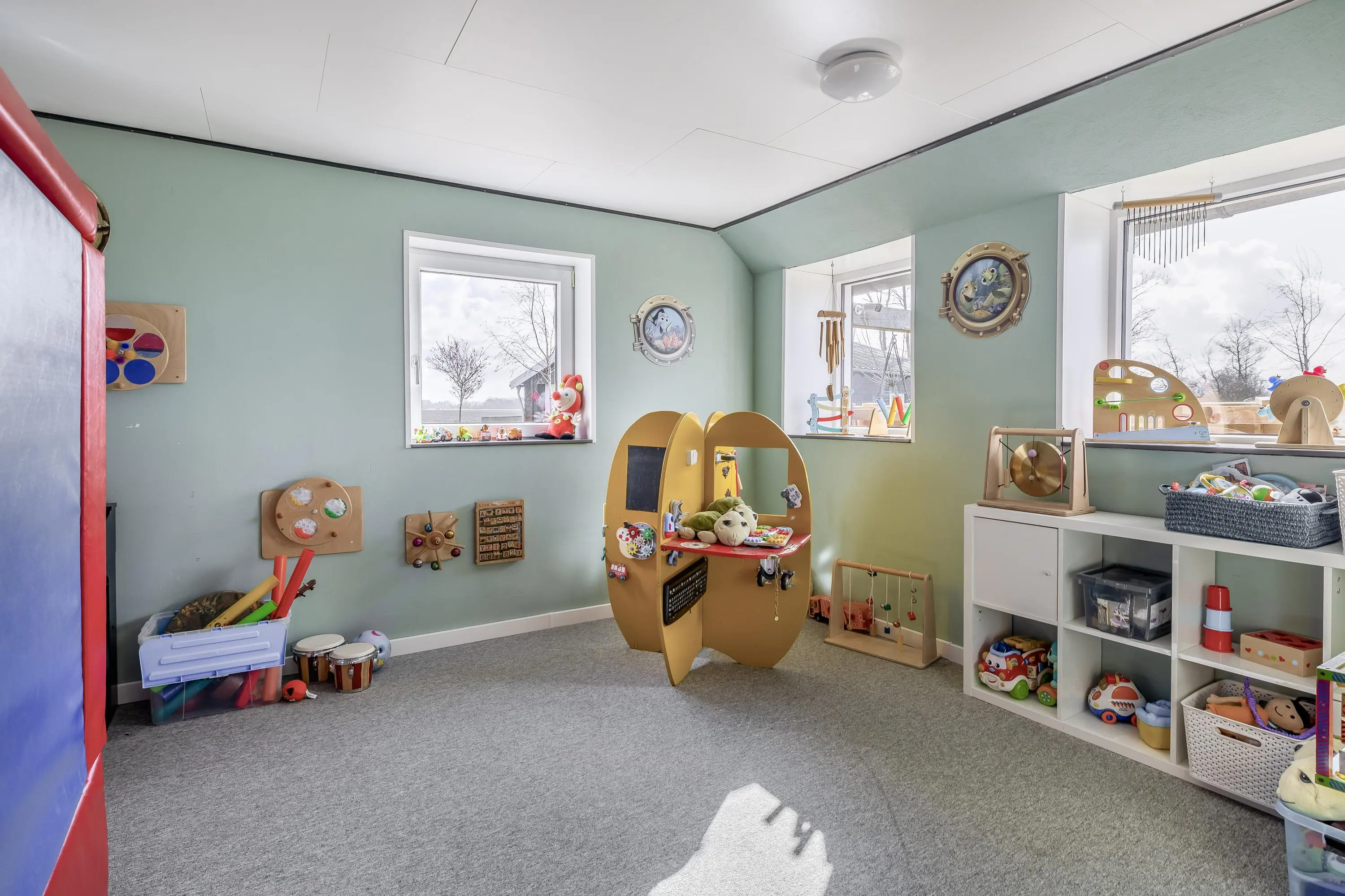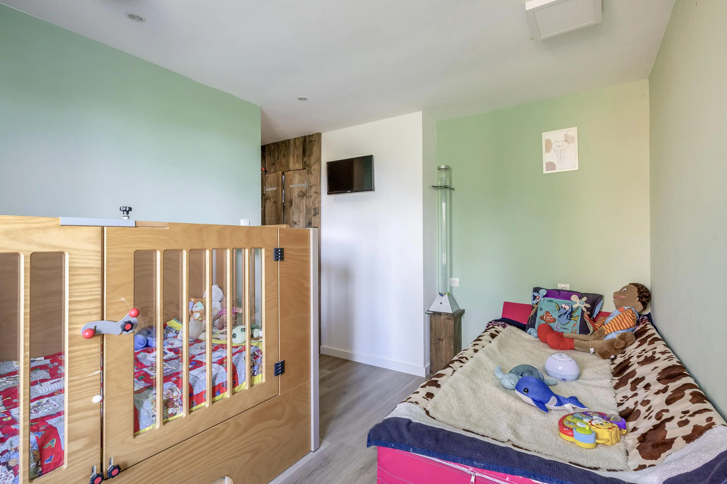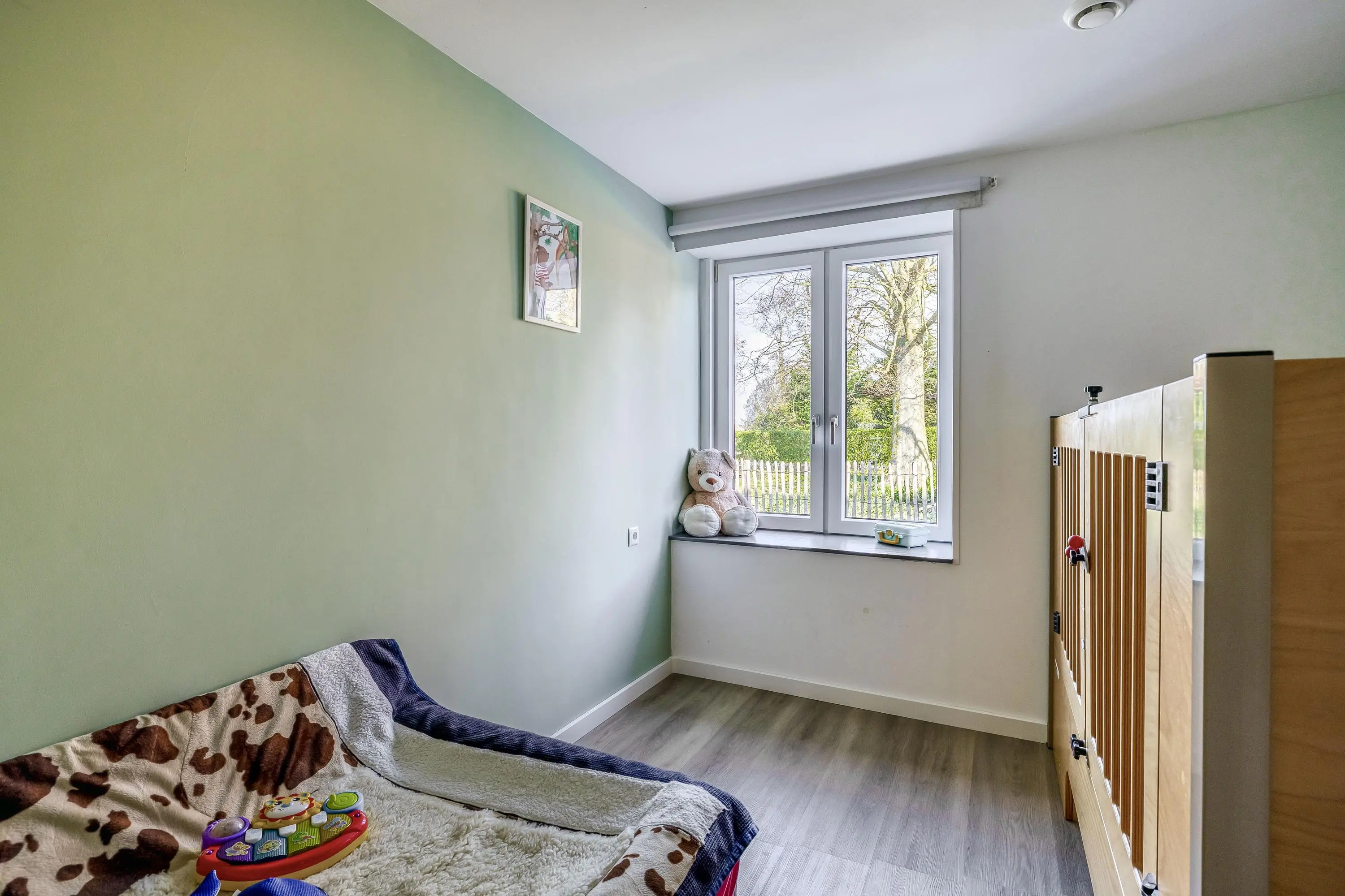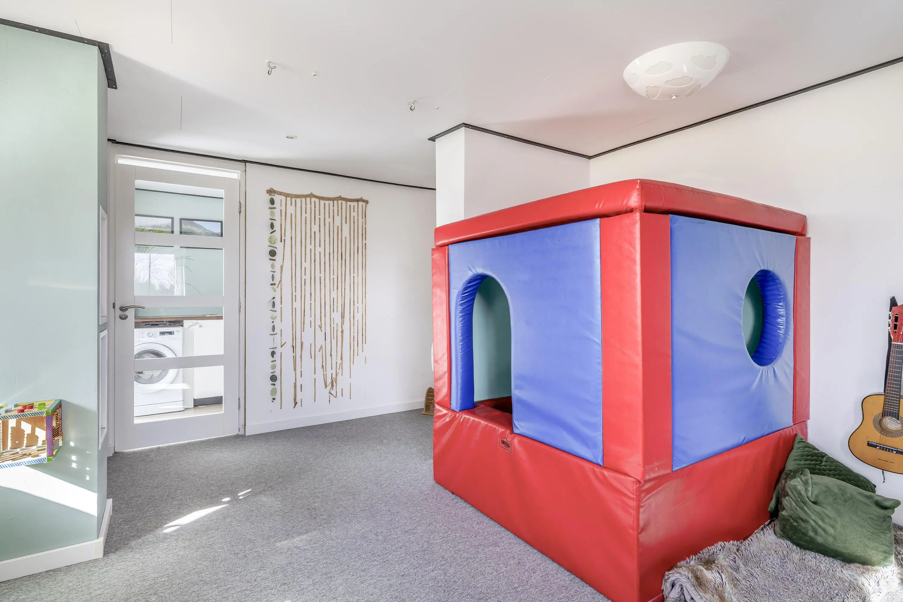 Op de begane grond bevinden zich twee volwaardige slaapkamers, waarbij de speelkamer is voorzien van vloerbedekking. De eerste kamer, direct bereikbaar vanuit de hal, heeft een oppervlakte van circa 10m² en is uitermate geschikt als logeer-, werk- of hobbykamer. Deze kamer is voorzien van een PVC-vloer. De tweede kamer bevindt zich verderop in de woning en is met circa 21m² royaal van opzet en momenteel in gebruik als sfeervolle speelkamer. In de gang die de vertrekken met elkaar verbindt, bevinden zich diverse praktische inbouwkasten en een ruime trapkast onder de opgang naar boven.