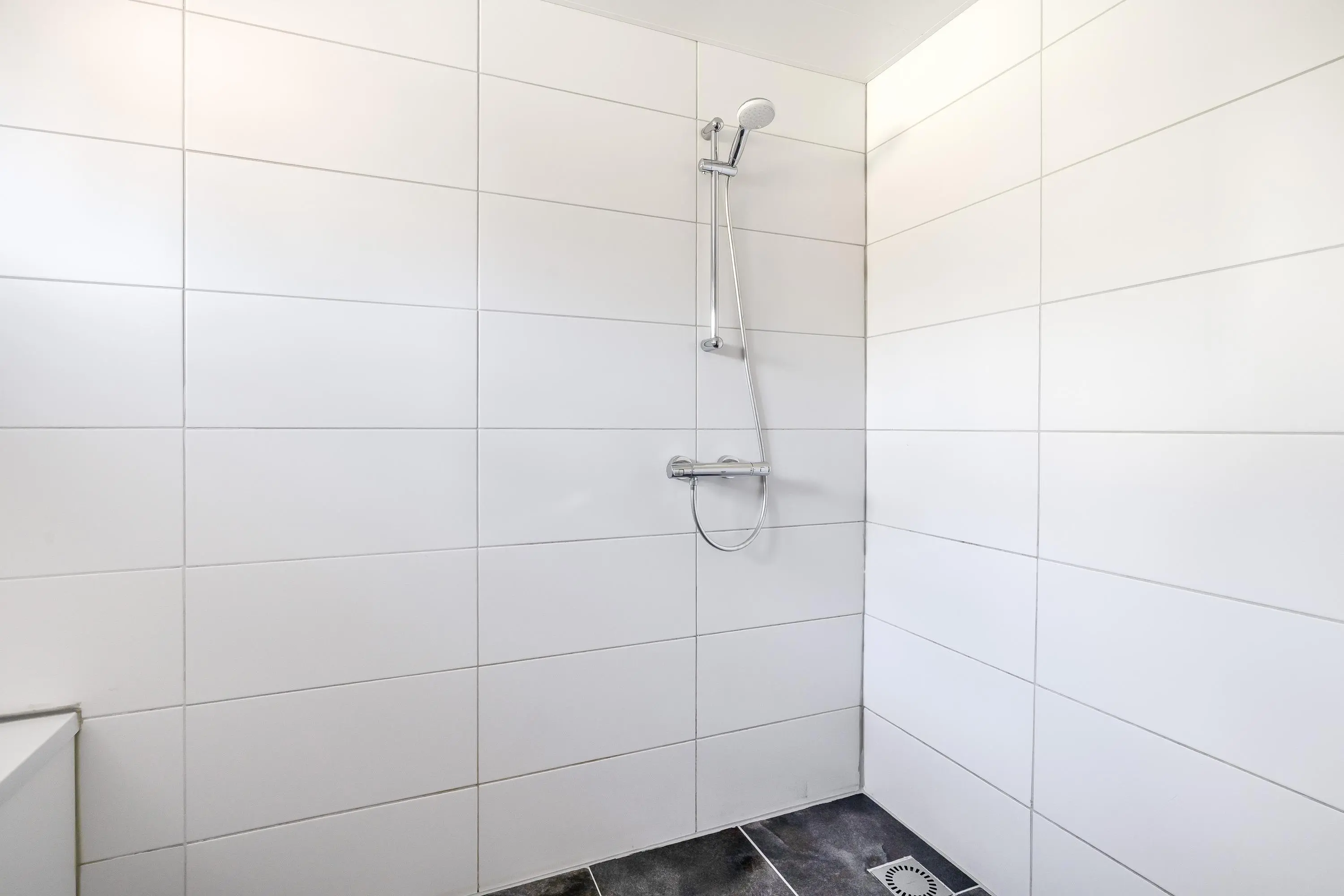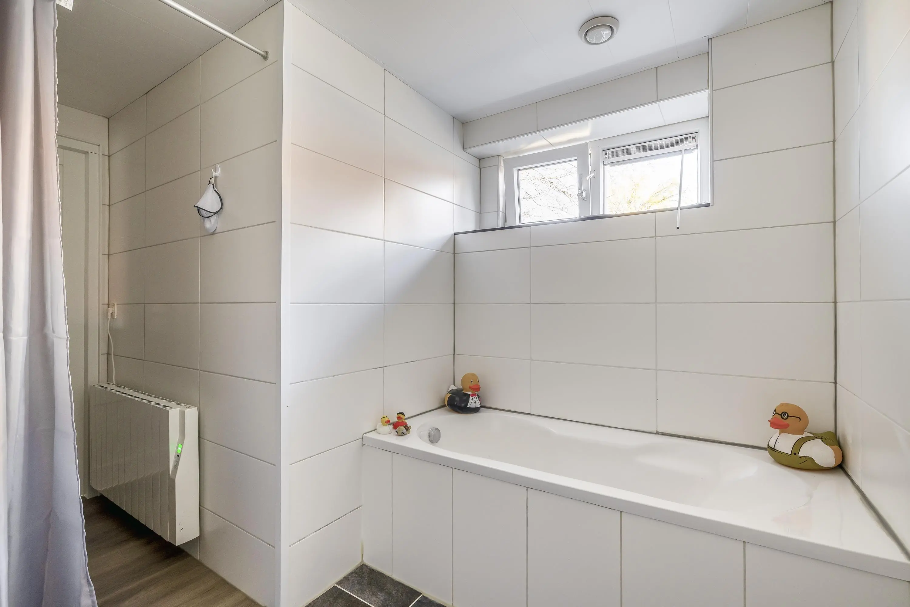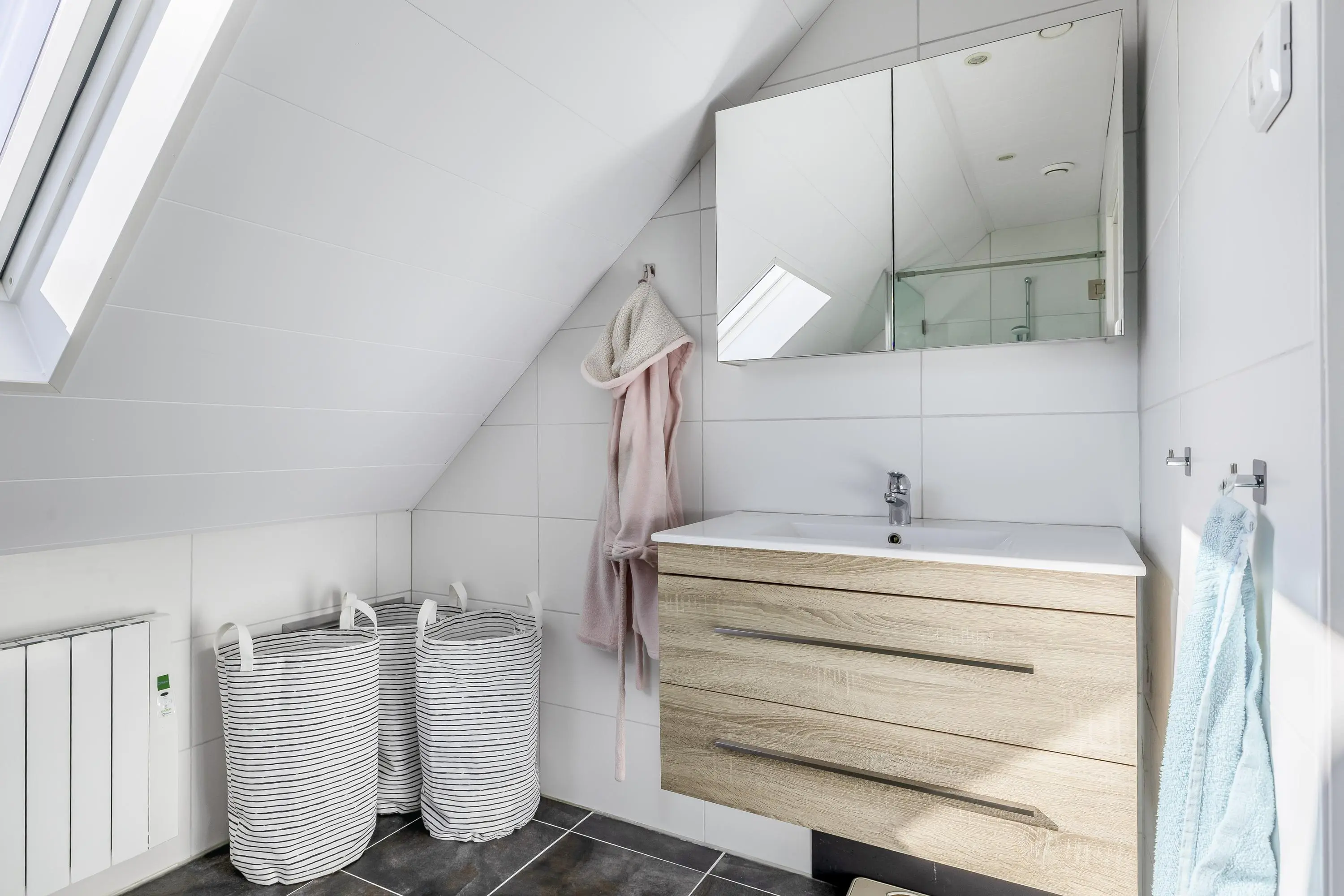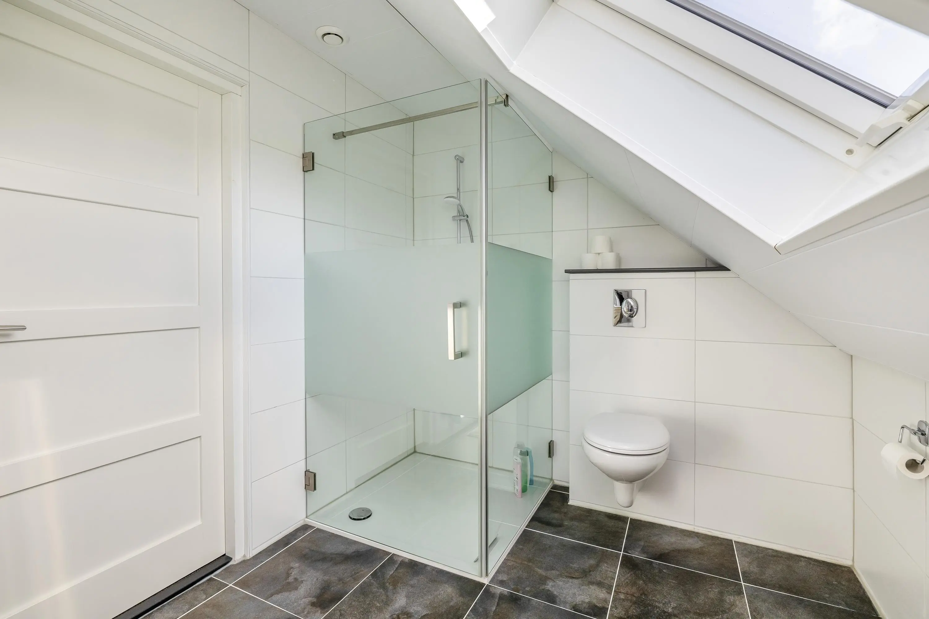 Centraal op de verdieping bevindt zich de tweede badkamer. Deze is verzorgd ingericht met een douche, een wastafelmeubel en een toilet. De ruimte beschikt over een dakraam voor natuurlijke ventilatie, naast de mechanische ventilatie.