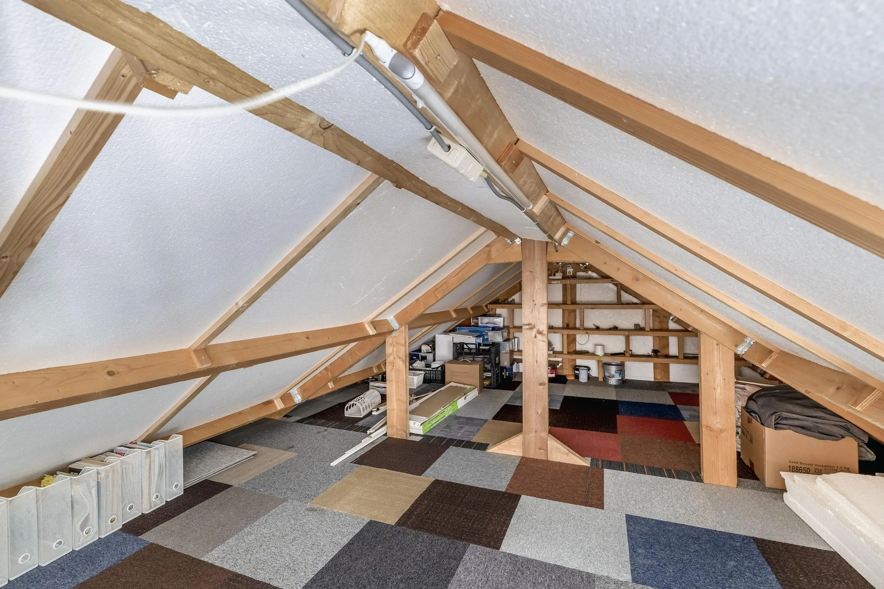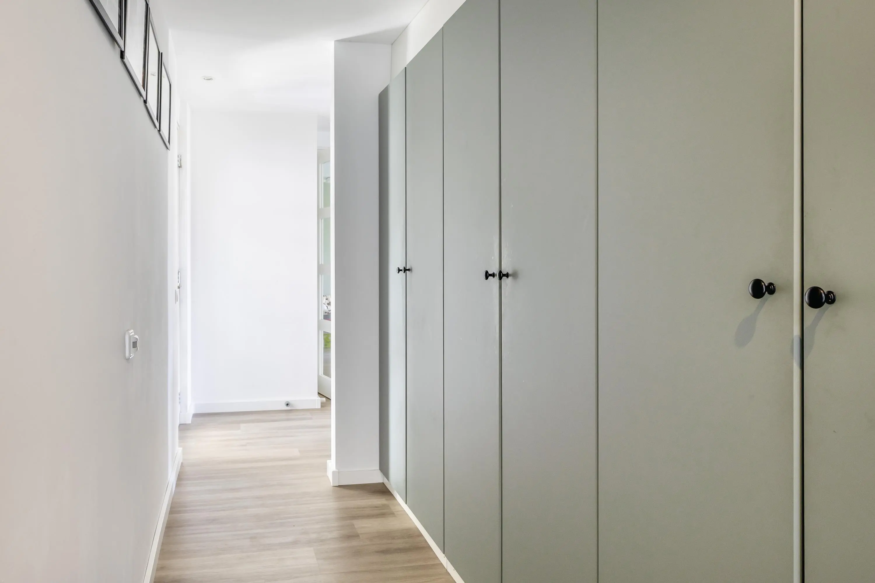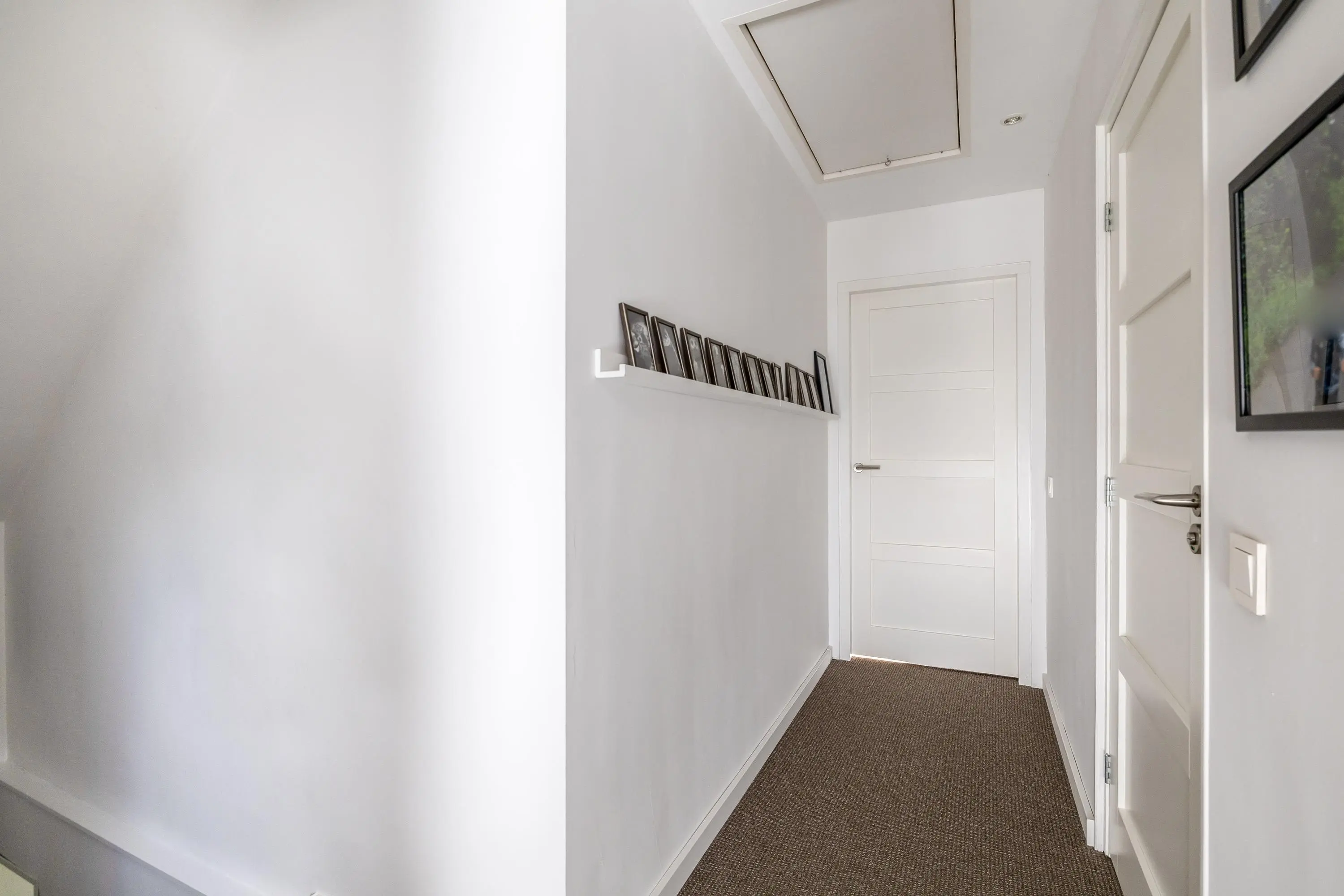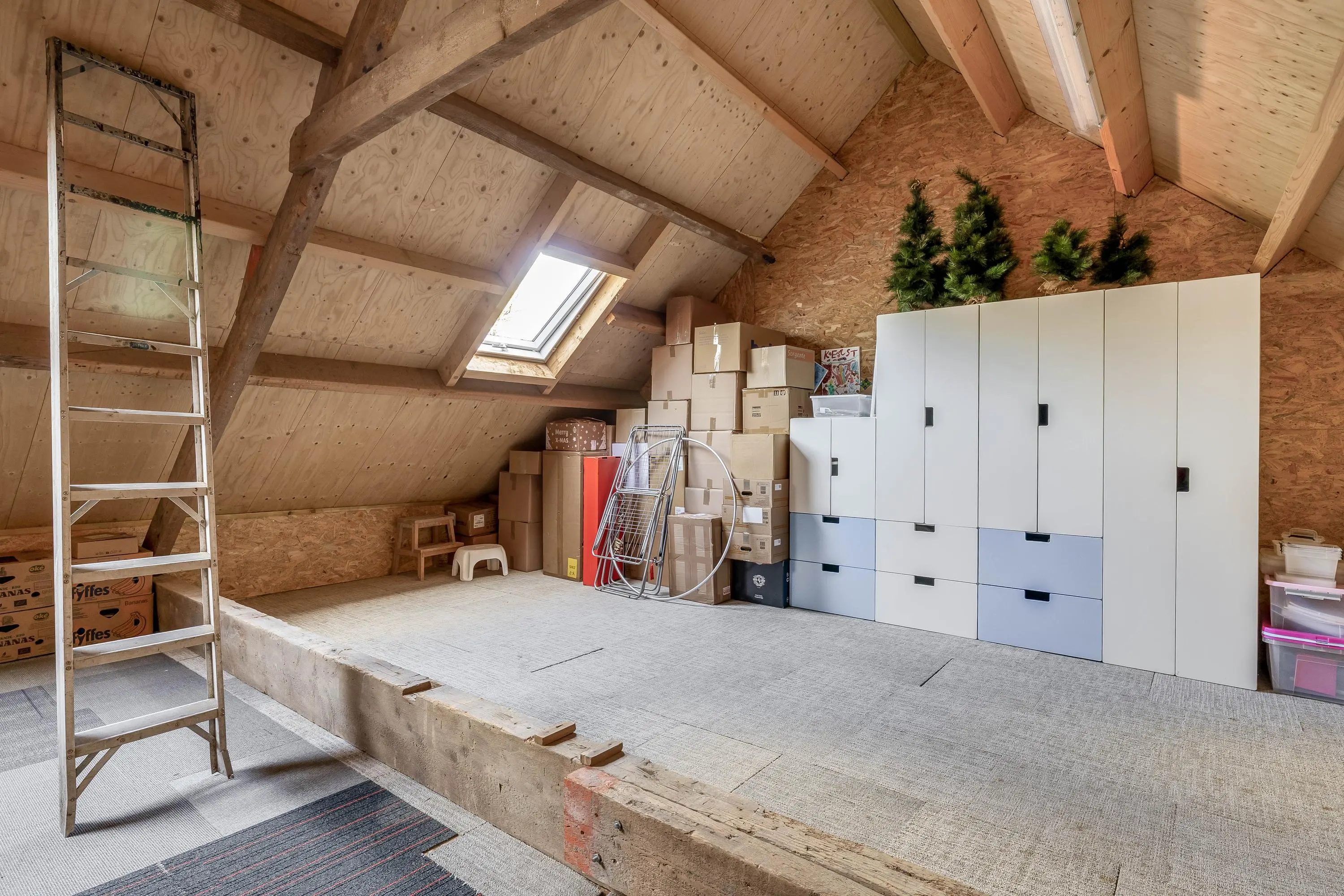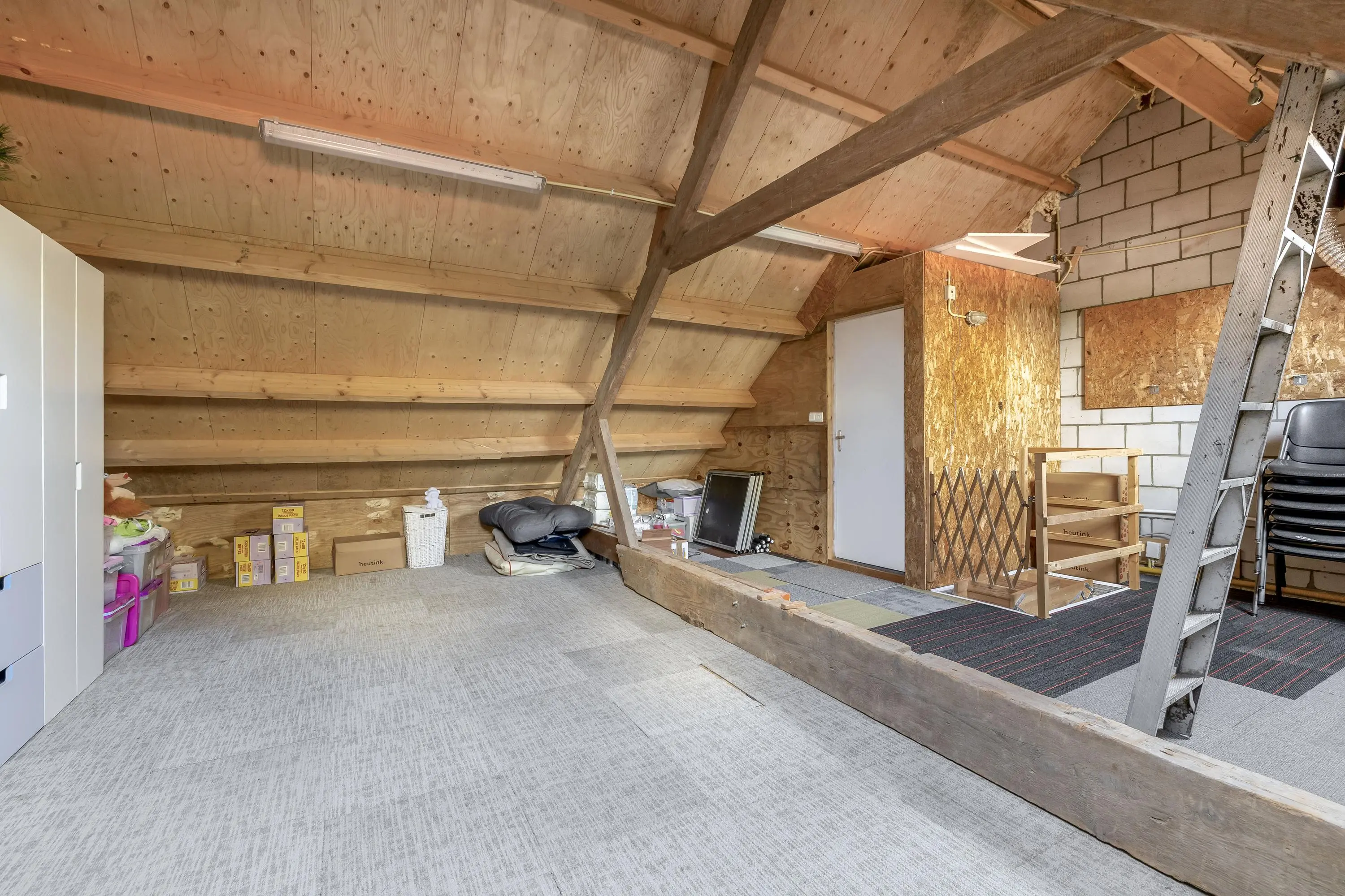 De overloop biedt toegang tot de verschillende vertrekken, waaronder een praktische doorloopkamer die is voorzien van een royale inbouwkast. Dit is een ideale ruimte voor een inloopkast of een rustige werkhoek. Ook op technisch vlak is deze verdieping goed gefaciliteerd met de aanwezigheid van twee mechanische ventilatieboxen, wat zorgt voor een goed binnenklimaat. Vanaf de overloop is er via de vlizotrap toegang tot de bergvliering.