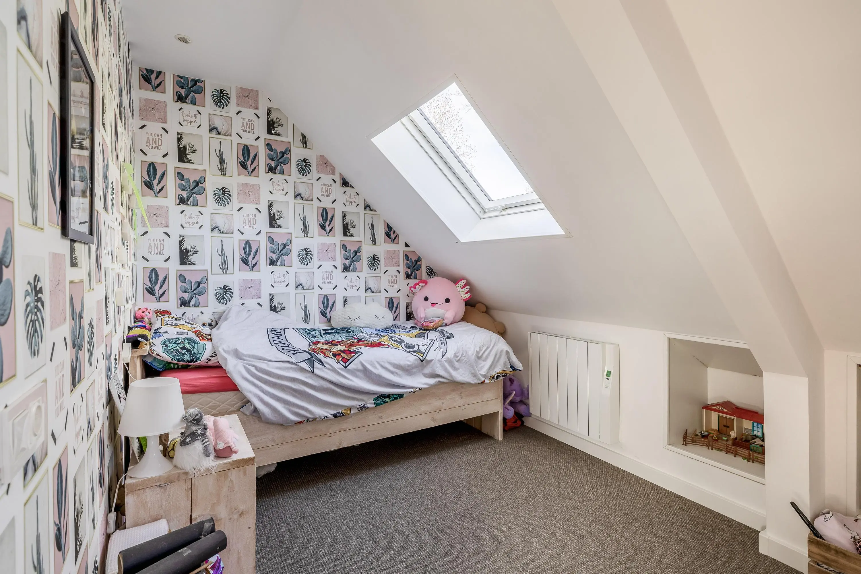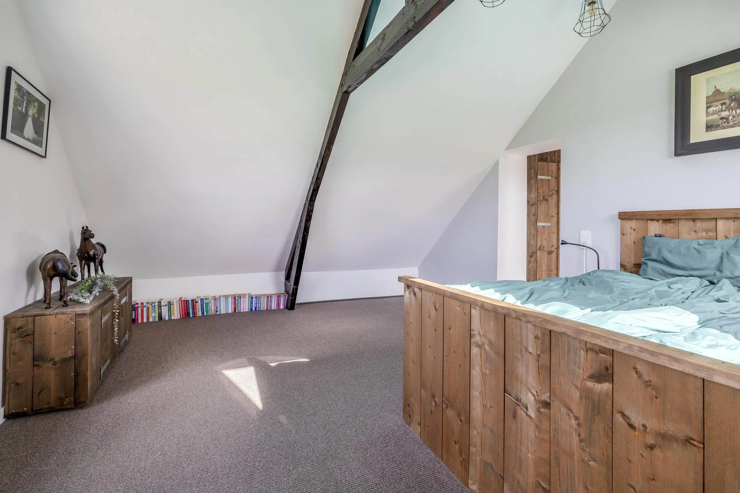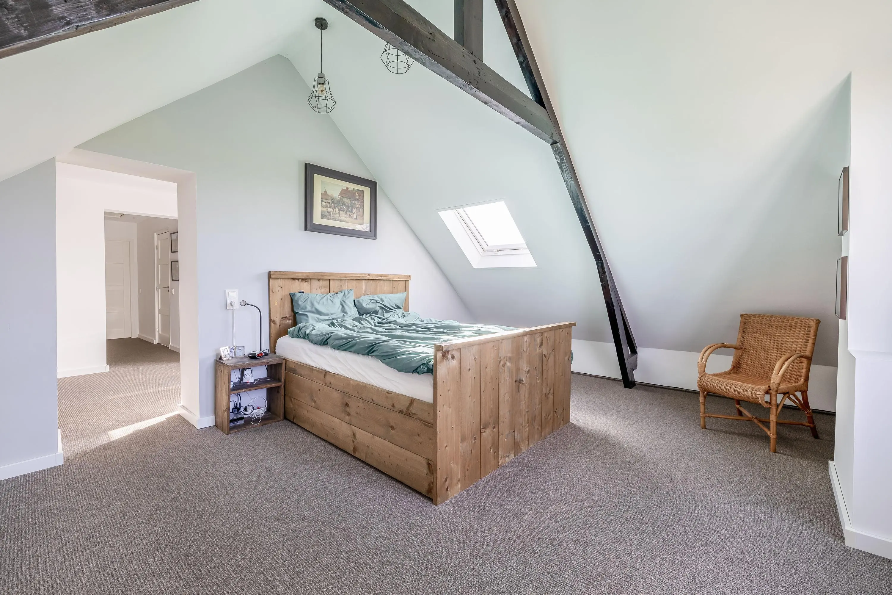 Aan de voorzijde van de woning bevindt zich de sfeervolle master bedroom. Deze kamer is een prachtig voorbeeld van hoe modern stucwerk en strakke plafonds perfect samengaan met de authentieke elementen van het huis, waarbij de houten spanten hier prachtig in het zicht zijn gelaten. De kamer heeft een oppervlakte van circa 26m² en beschikt over een dakraam dat zorgt voor extra daglicht. Een bijzonder en duurzaam detail is de verwarming, waarbij op slimme wijze gebruik wordt gemaakt van de restwarmte van de houtkachel beneden, wat zorgt voor een aangename en gelijkmatige temperatuur.