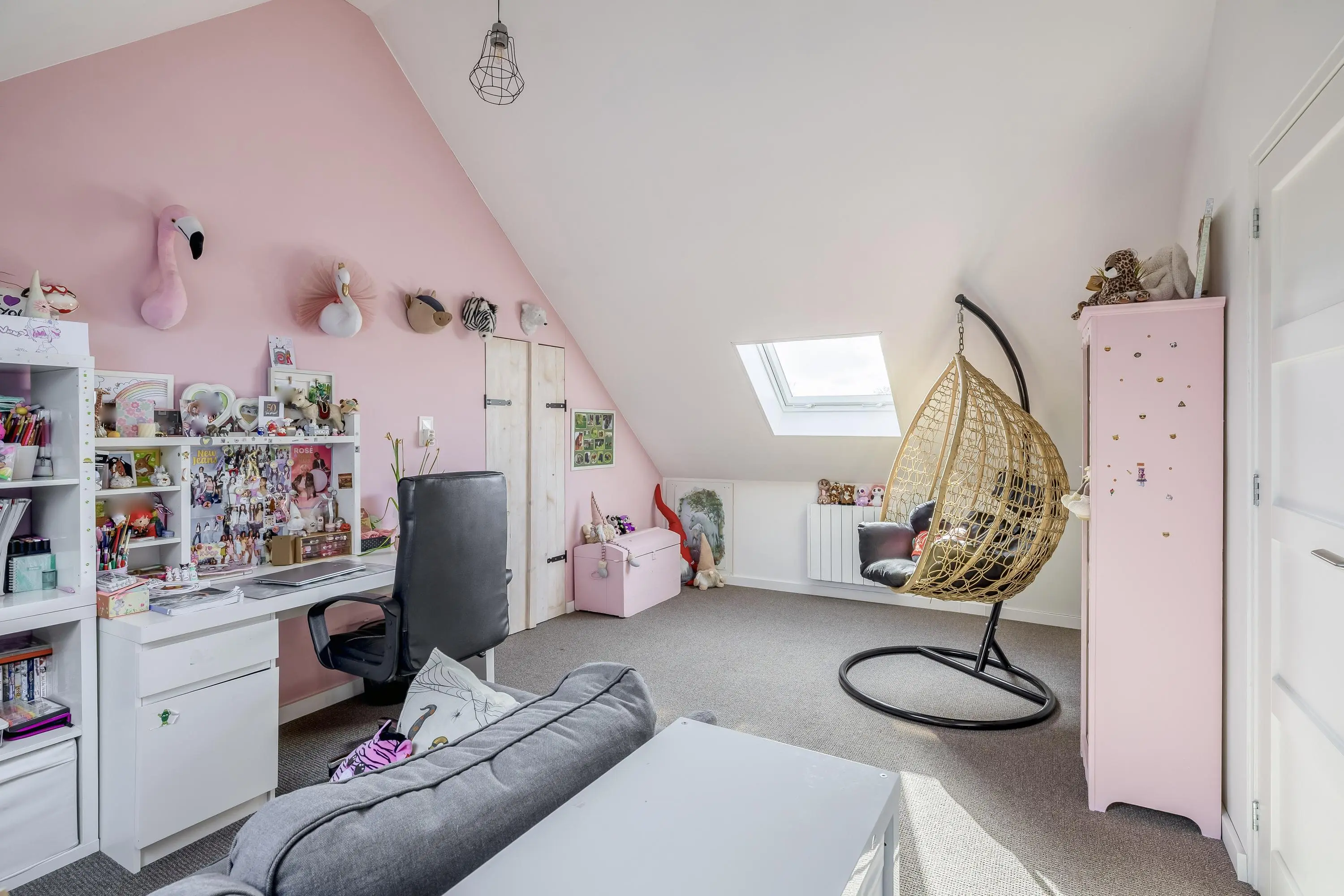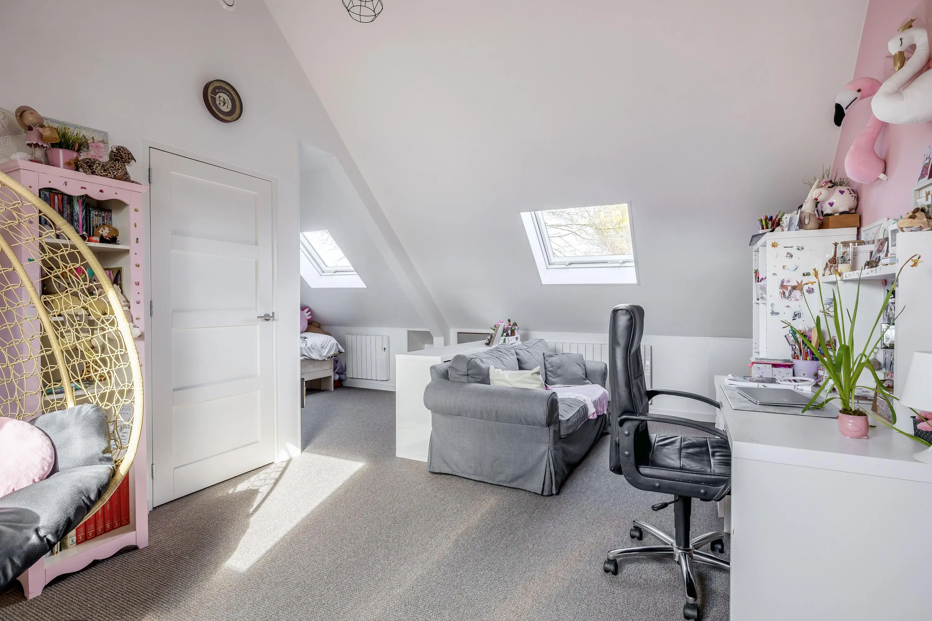 Aan de achterzijde van de woning bevinden zich nog twee opeenvolgende (slaap)kamers. De slaapkamer is heerlijk licht en ruimtelijk, en biedt via een tussendeur toegang tot de daarachter gelegen tweede kamer (indien gewenst is er hier de mogelijkheid om een extra slaapkamer of zelfs twee extra slaapkamers te creëren). Beide vertrekken zijn voorzien van grote dakramen die een prachtig uitzicht bieden op het omliggende groen en zorgen voor natuurlijk licht. Voor de verwarming is in de slaapkamer gekozen voor moderne elektrische radiatoren, waardoor de temperatuur per kamer afzonderlijk en efficiënt geregeld kan worden.