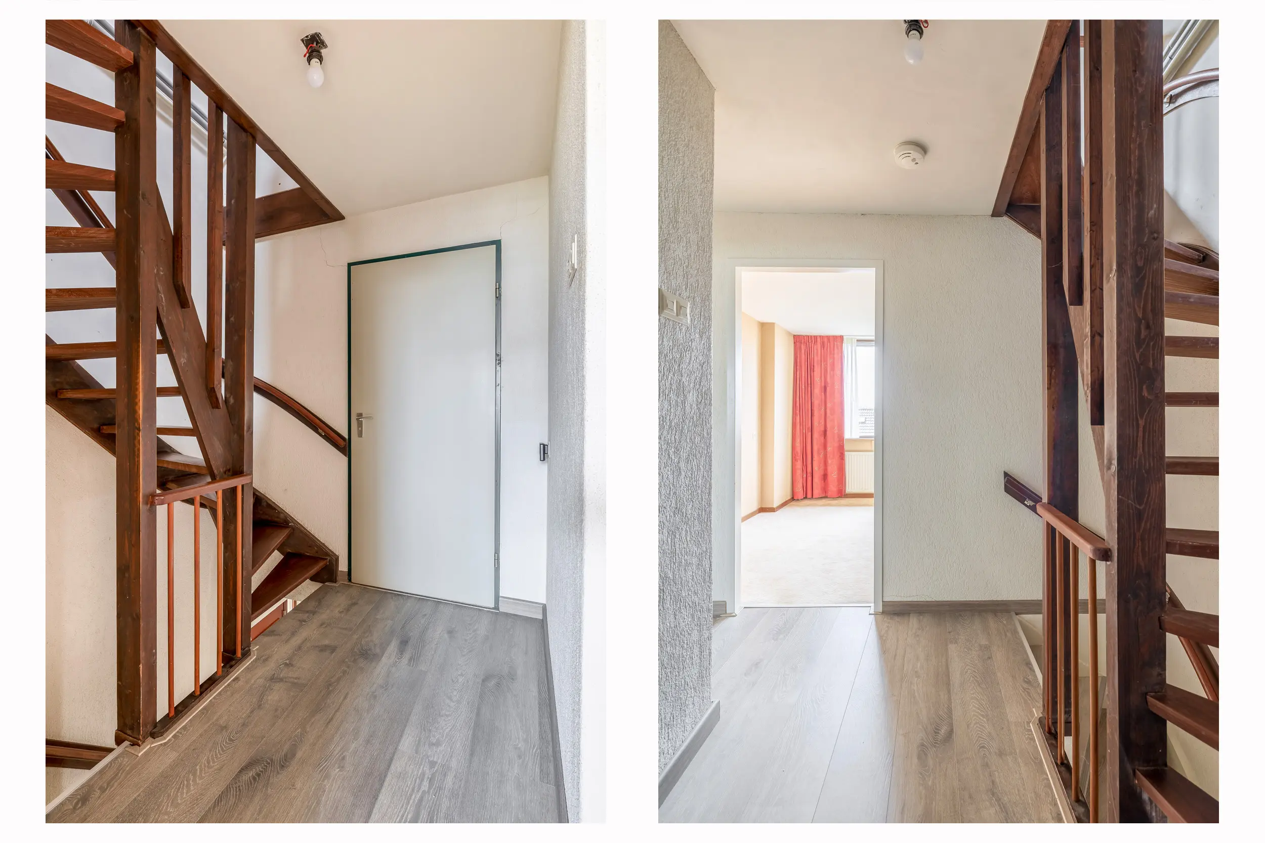 De overloop is afgewerkt met een nette laminaatvloer en biedt toegang tot drie slaapkamers, de badkamer en de trap naar de tweede verdieping.