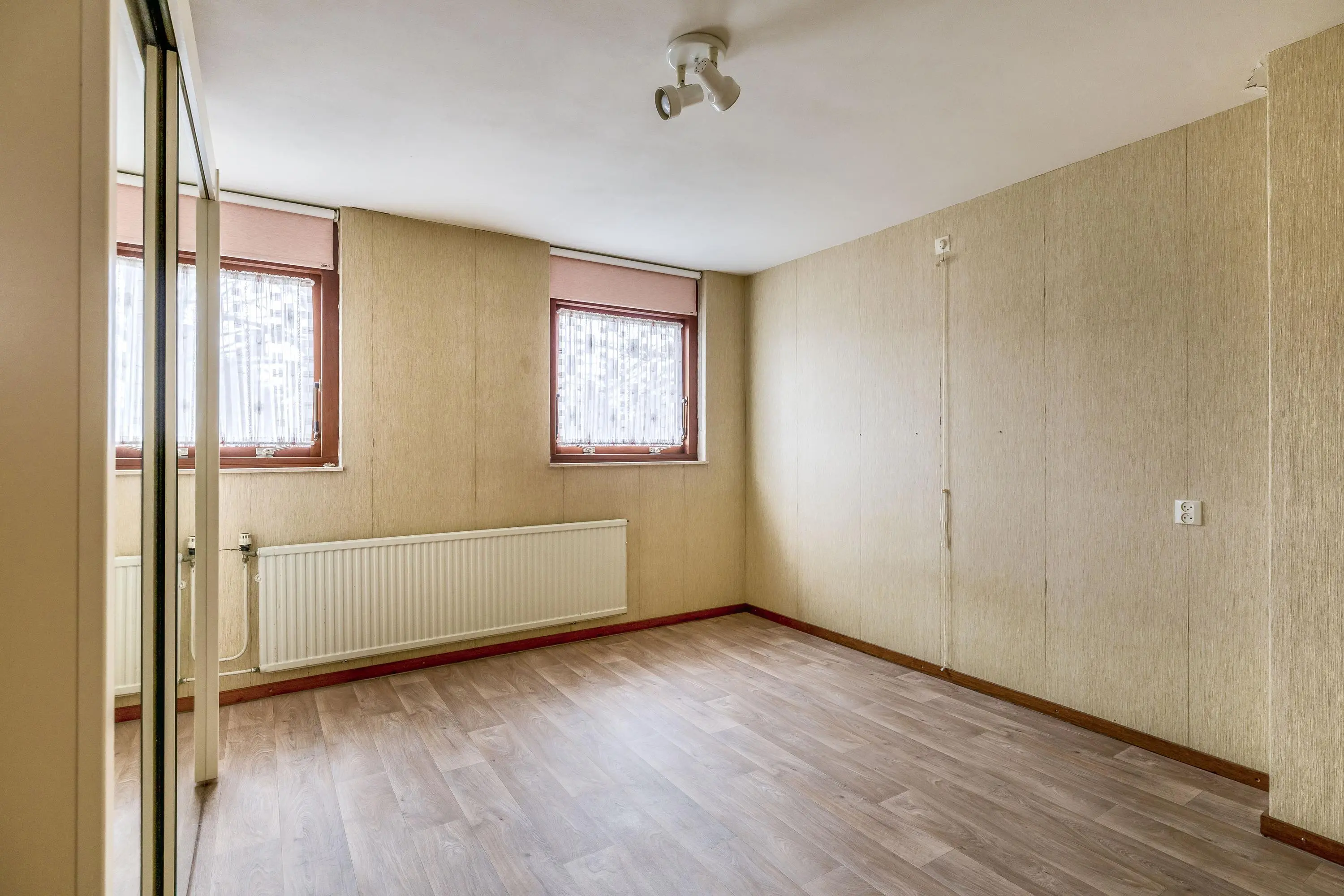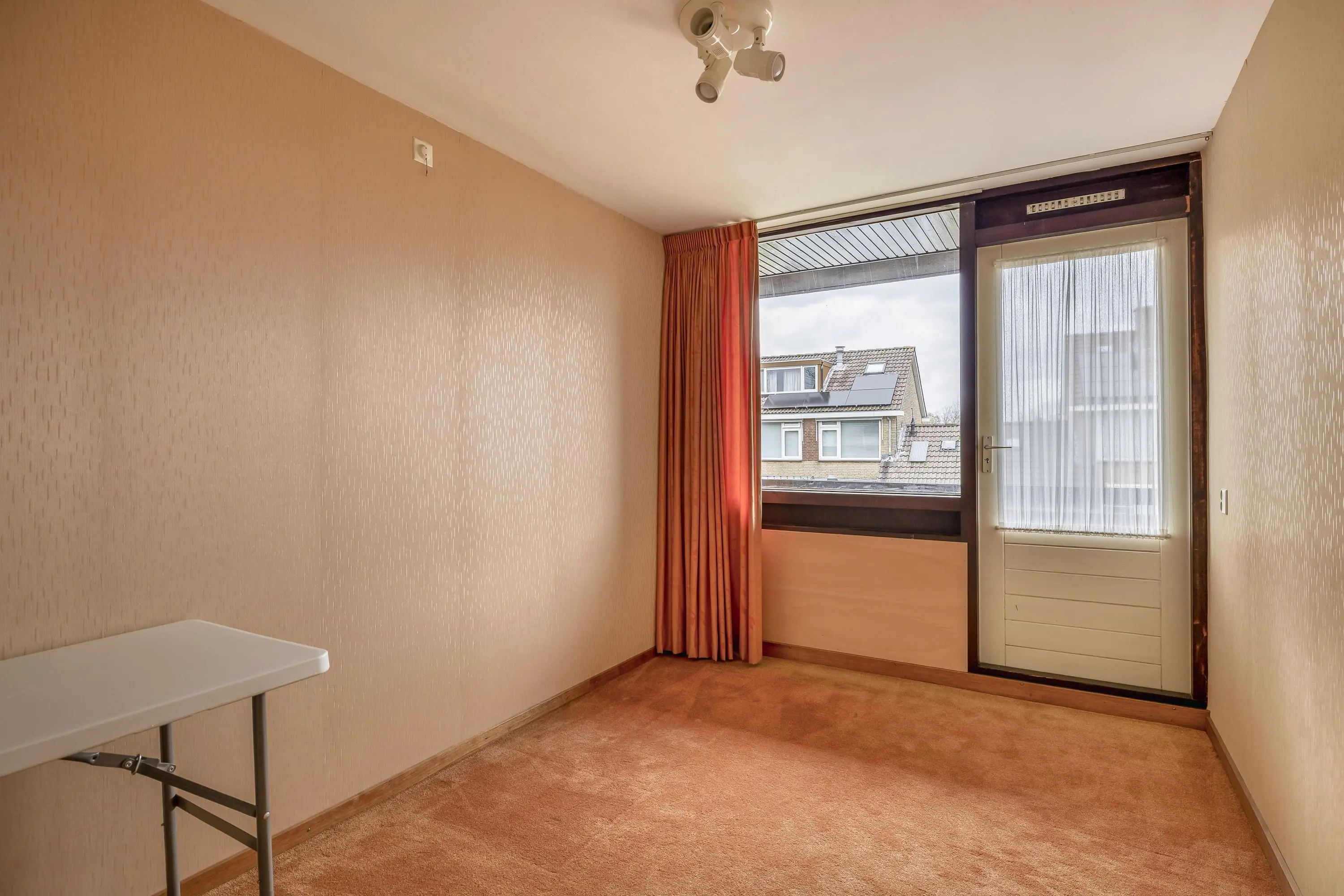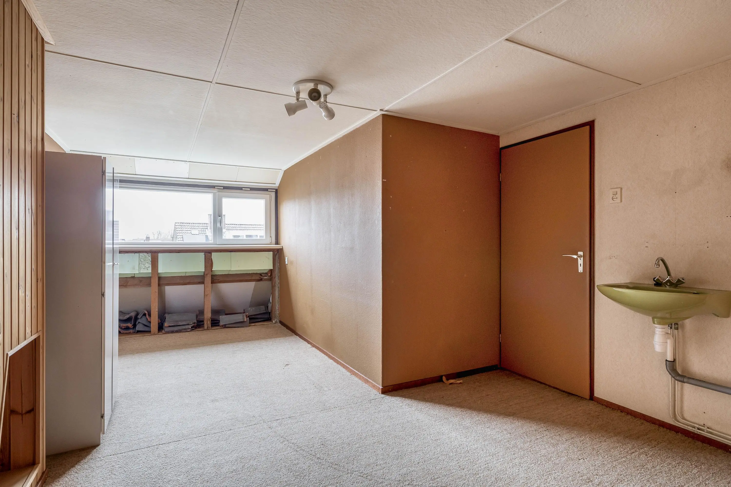 De vierde slaapkamer is royaal van formaat dankzij het uitgebouwde dakkapel en biedt volop flexibiliteit in de inrichting. De kamer geniet bovendien van veel natuurlijk licht en is uitgerust met een wastafel en een grote opbergruimte achter de deur.