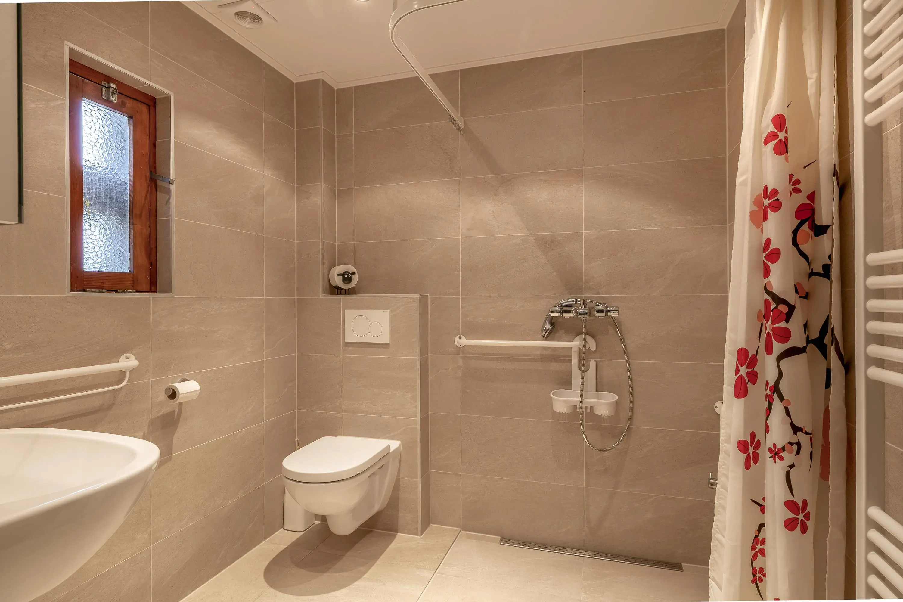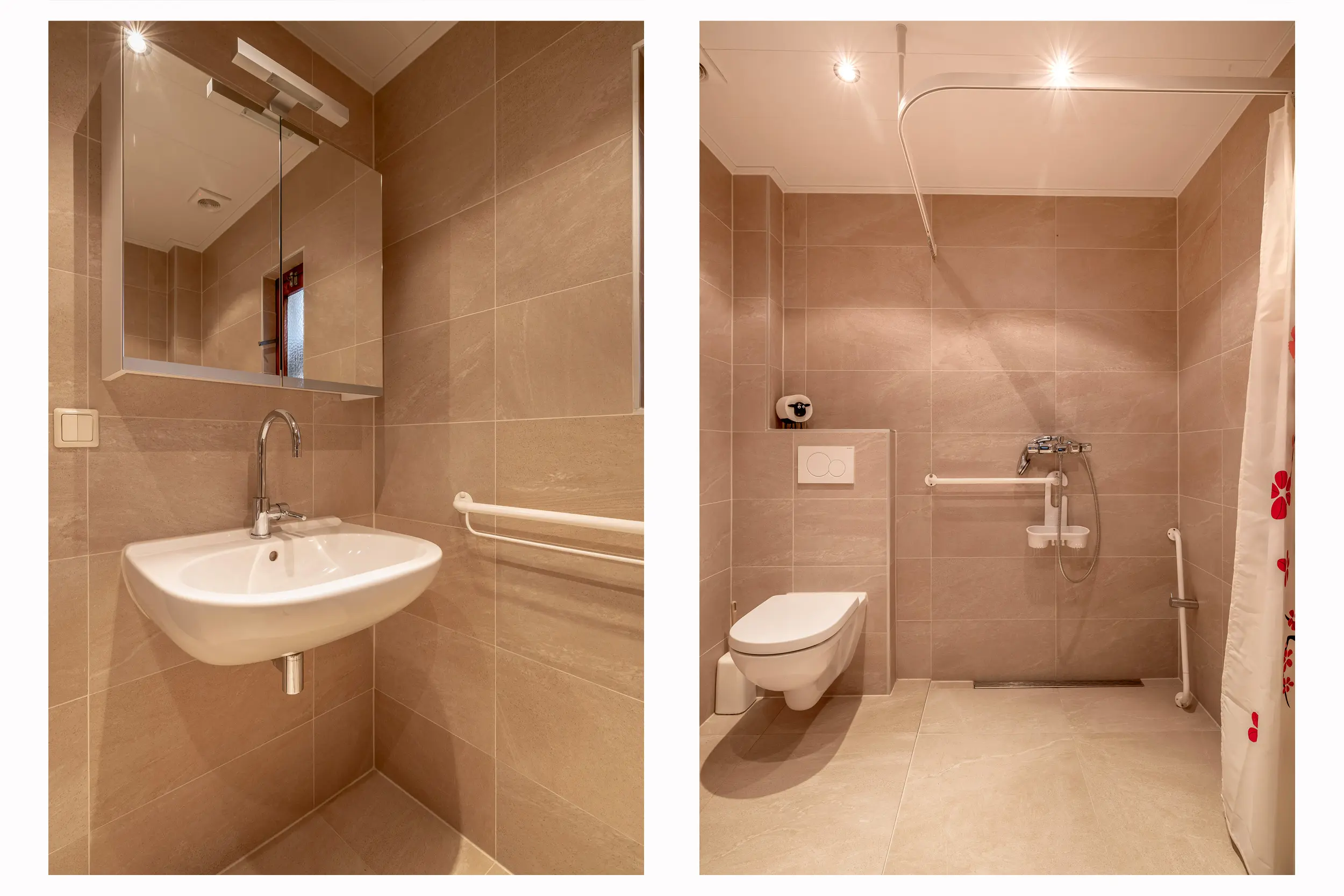 De badkamer is netjes afgewerkt en sluit qua stijl aan bij het toilet op de begane grond. De ruimte is voorzien van een inloopdouche, toilet en wastafel.