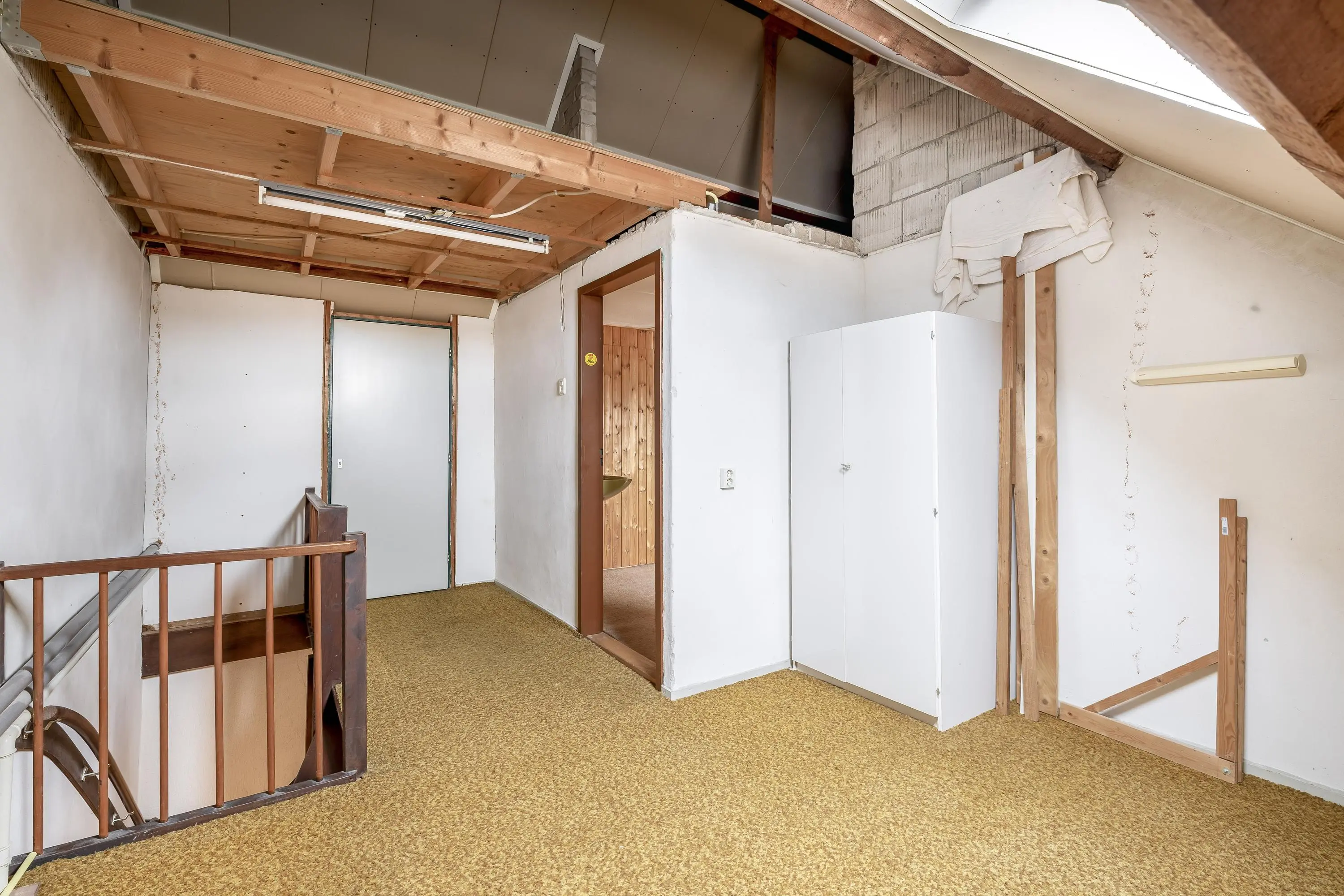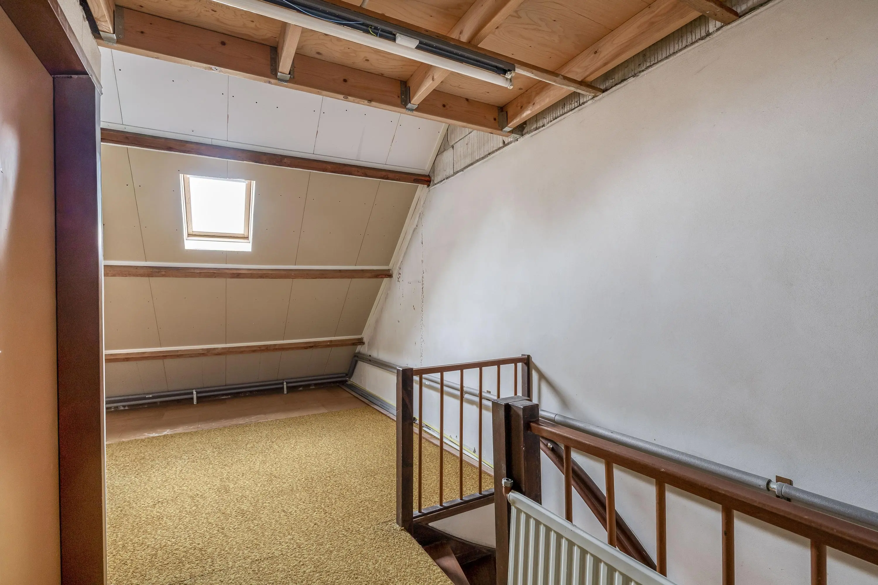 De overloop biedt toegang tot de vierde slaapkamer en tot de CV-opstelling, die netjes is weggewerkt in een inbouwkast in de muur. Daarnaast is er toegang tot de ruime, hoge vliering met veel opslagruimte.