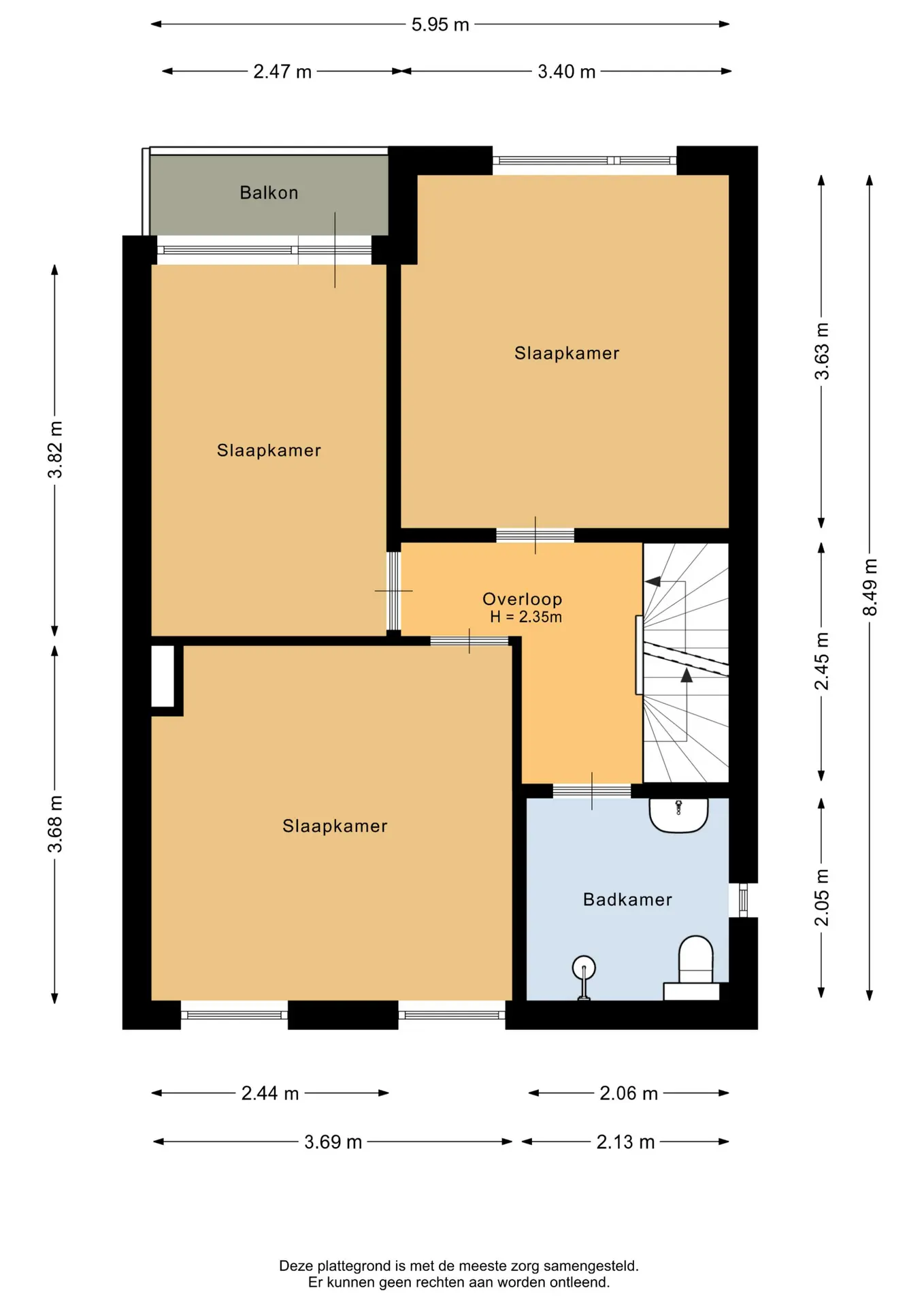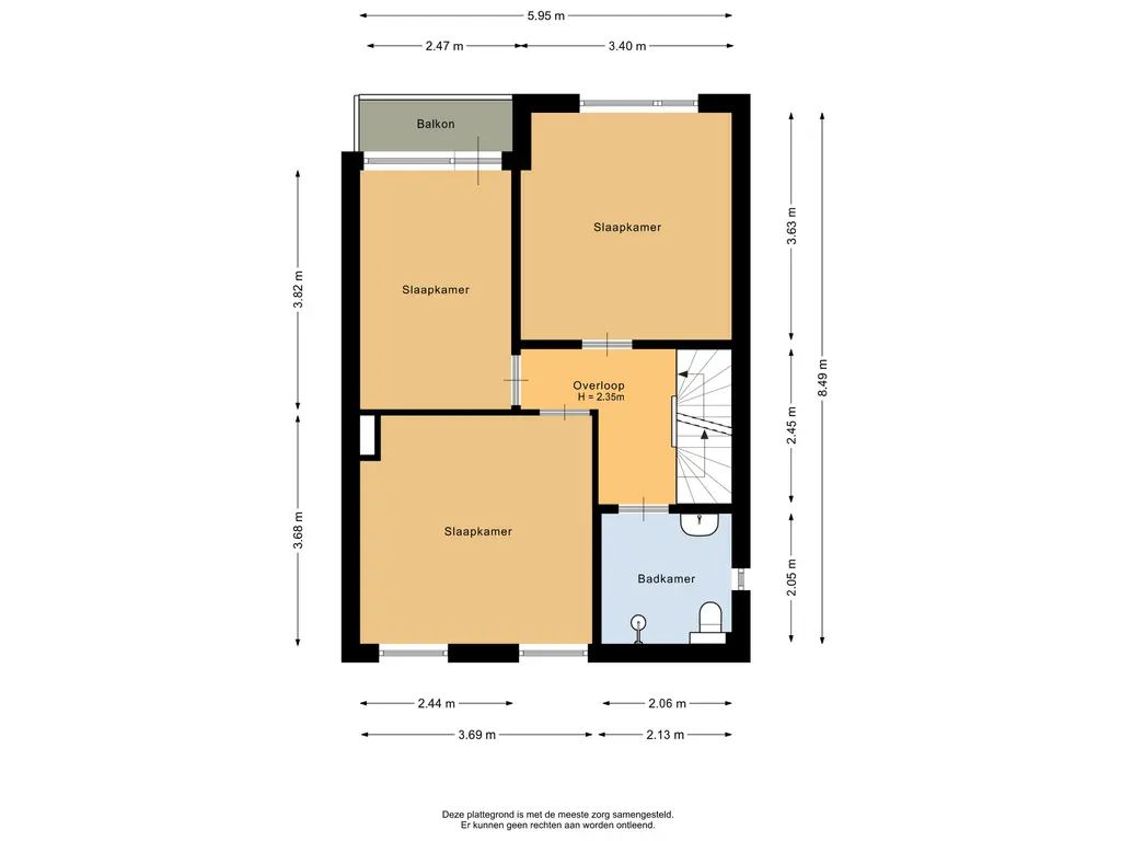 De hoofdslaapkamer bevindt zich aan de voorzijde en heeft een oppervlakte van circa 13,5m². Aan de achterzijde liggen de tweede slaapkamer van circa 12,5m² en de derde slaapkamer van ongeveer 9,5m². De derde slaapkamer beschikt bovendien over een balkon wat de ruimte extra openheid en licht geeft.