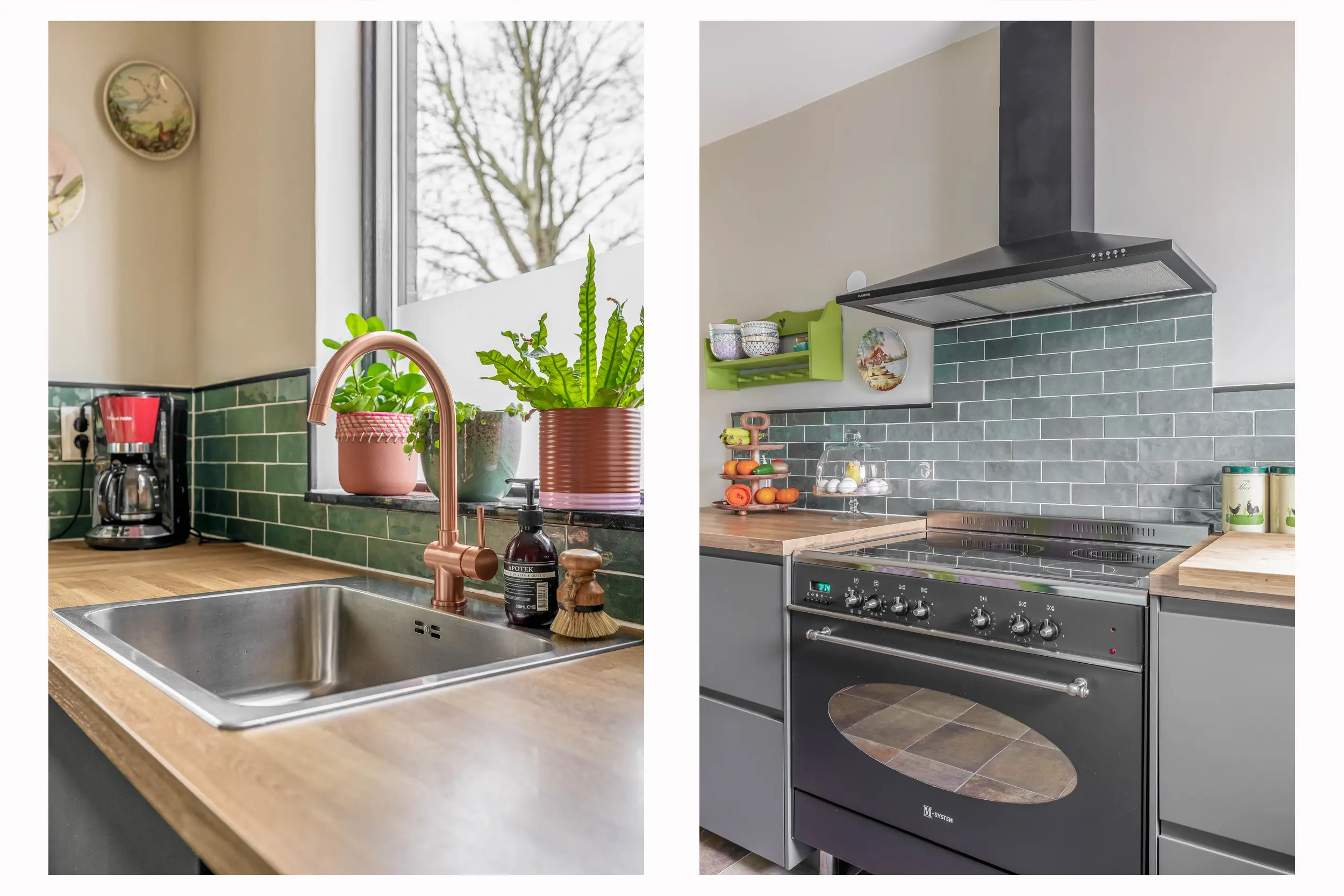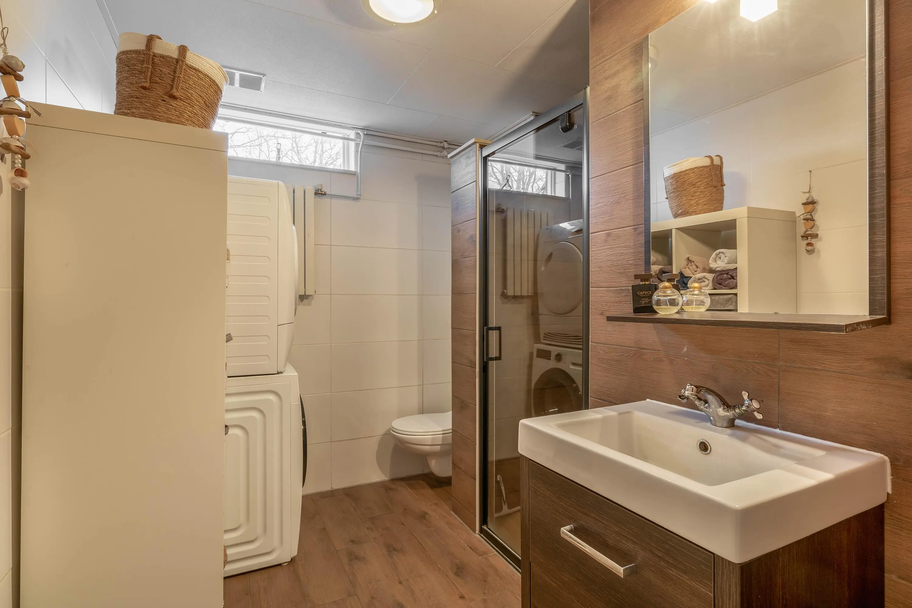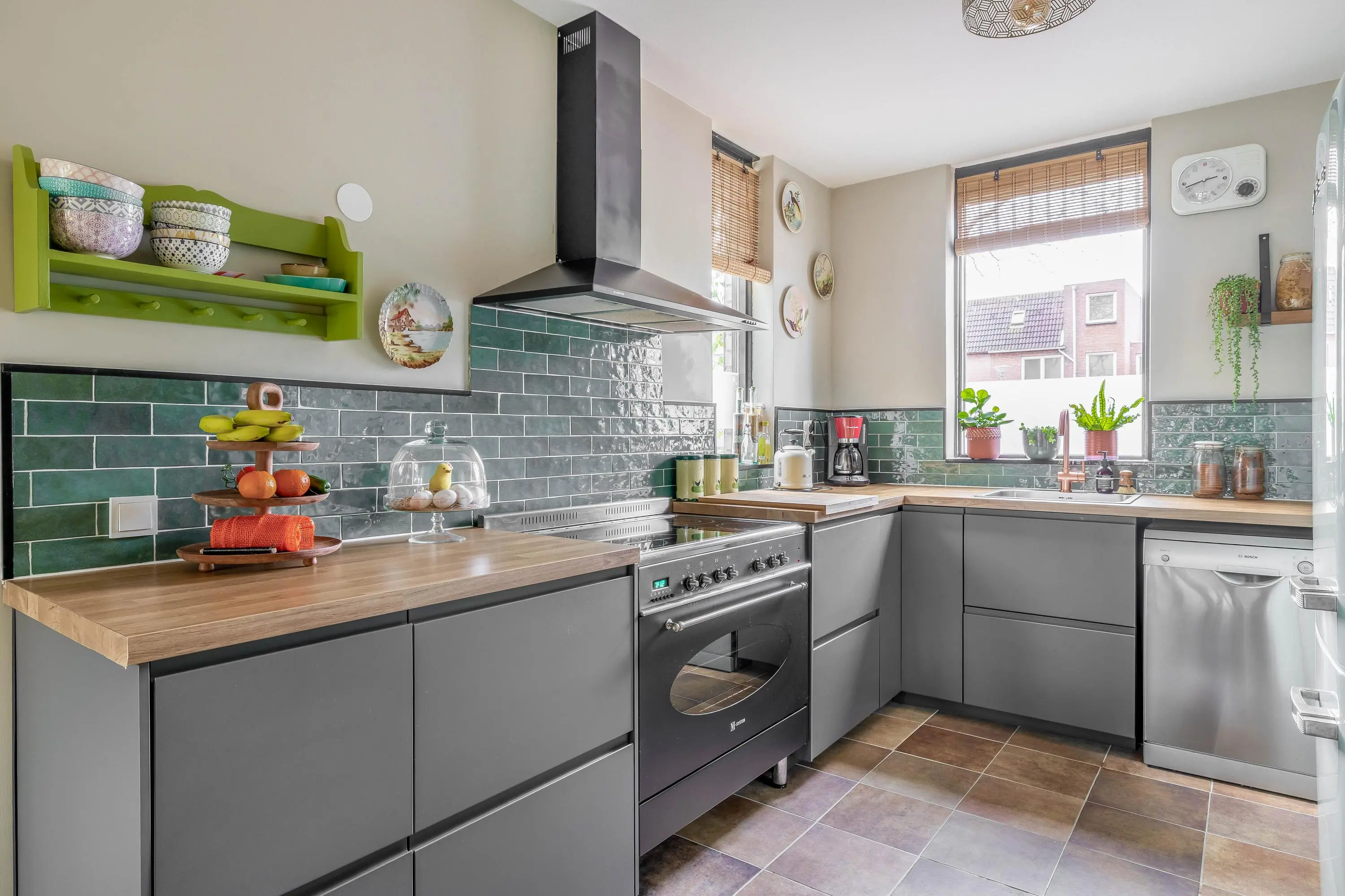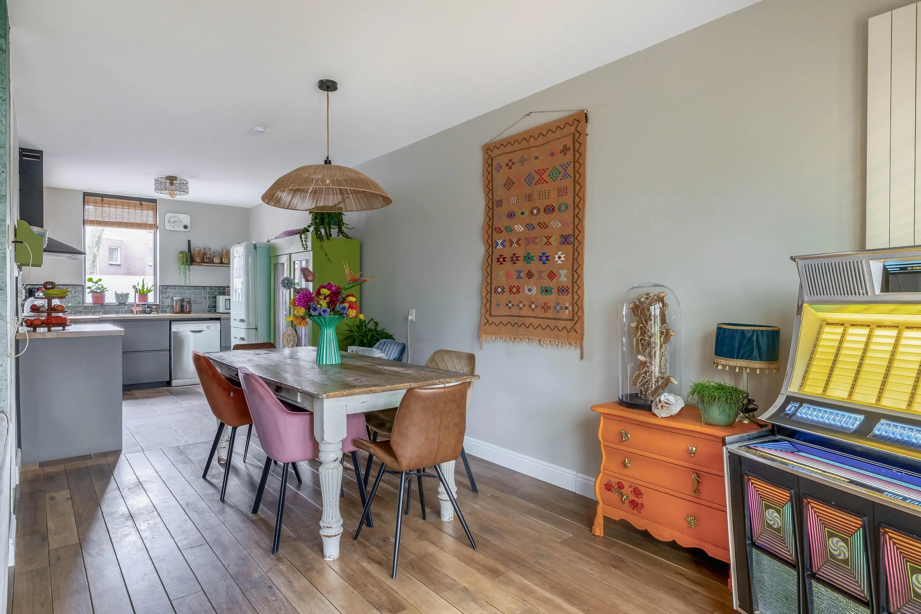 Via de betegelde voortuin is de entree van de woning en de meterkast bereikbaar. De entree is in de hal, hier is een losse toiletruimte te vinden met een wandcloset en fonteintje. Ook bevindt zich hier de trapopgang met daaronder de trapkast. Aan de voorzijde is de heerlijke woonkeuken te vinden. Deze heeft als apparatuur een mooi los kookstel (inductie) met een grote oven en afzuigkap. Ook is er een vaatwasser, spoelbak en losse koel-/vriescombinatie aanwezig. Uiteraard is er ook voldoende kastruimte. Dan volgt de eethoek met aansluitend de royale living aan de achterzijde. In deze living zijn openslaande deuren naar de serre en tuin en een zeer sfeervolle houtkachel aanwezig. Hierdoor krijgt deze ruimte een nog huiselijker gevoel. De achtertuin is deels overdekt met een fijne serre. De ultieme plek om ook met kouder weer te genieten van de fijne achtertuin.