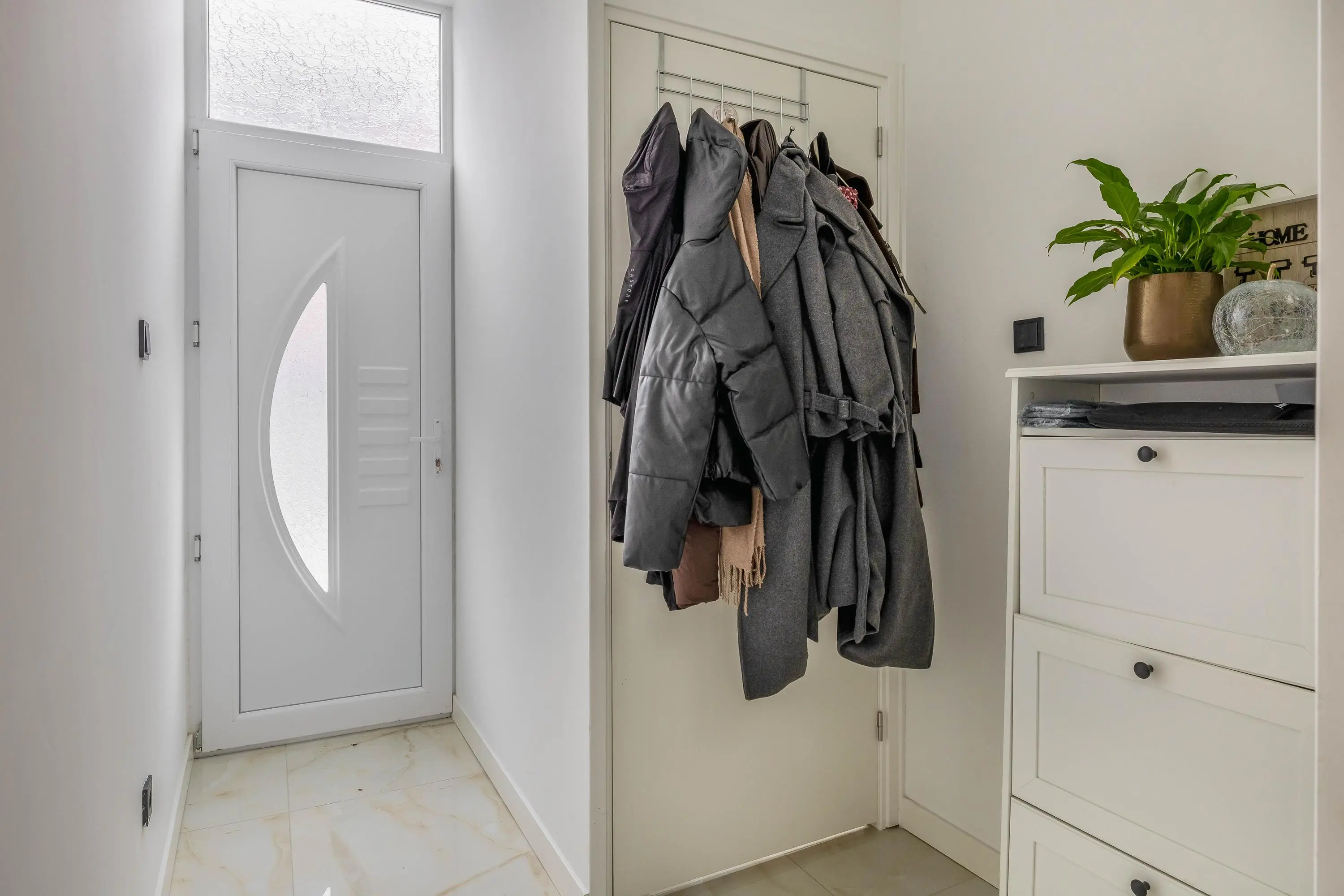 De overloop biedt toegang tot twee slaapkamers, de badkamer en de vliering. In de praktische kast bevinden zich de aansluitingen voor de wasmachine en droger.