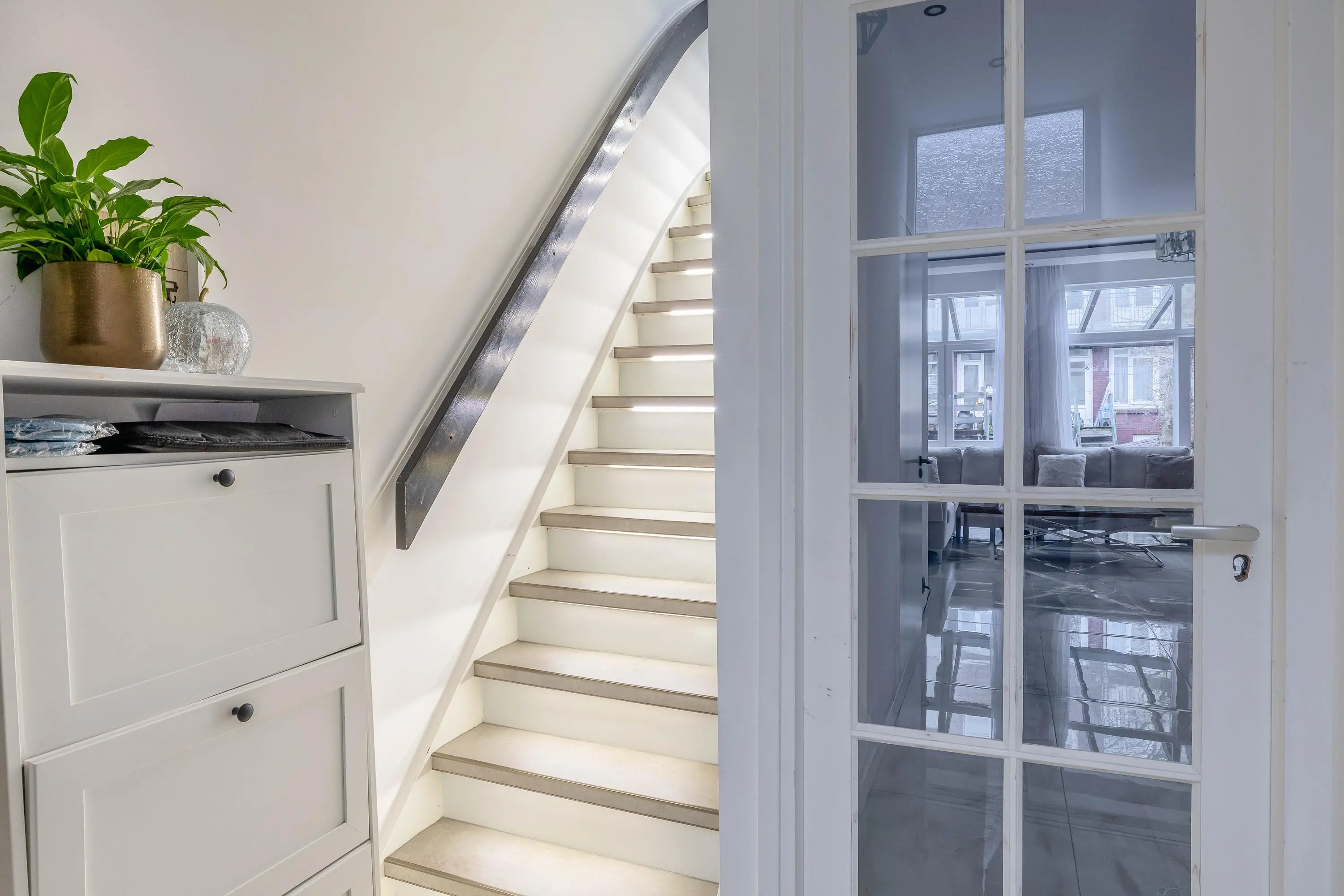 Entree/hal is voorzien van een stijlvolle plavuizen marmervloer die doorloopt over de gehele begane grond. De vloer is voerzien van vloerverwarming. In de hal bevinden zich het separate toilet met fonteintje en de trapopgang naar de eerste verdieping.