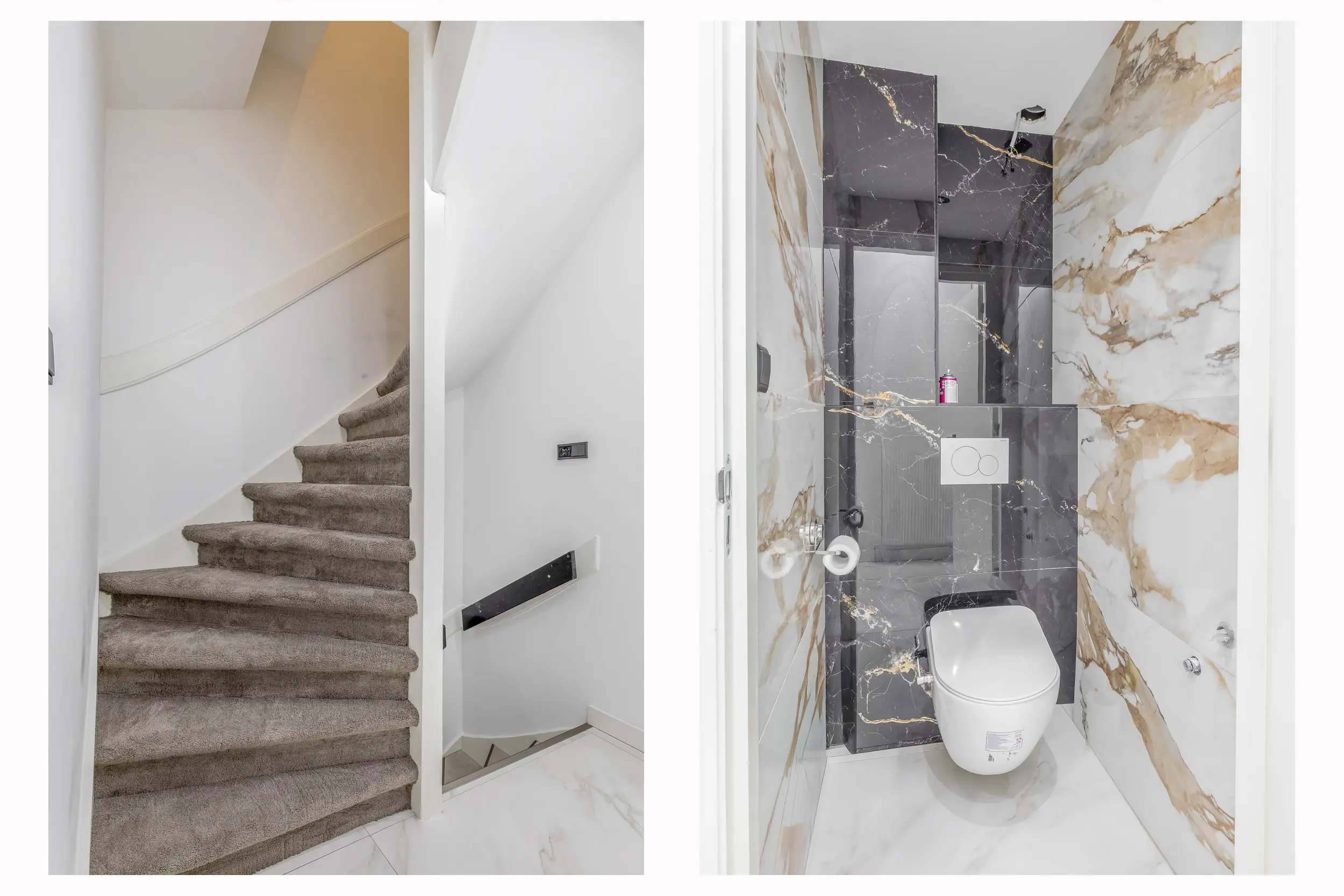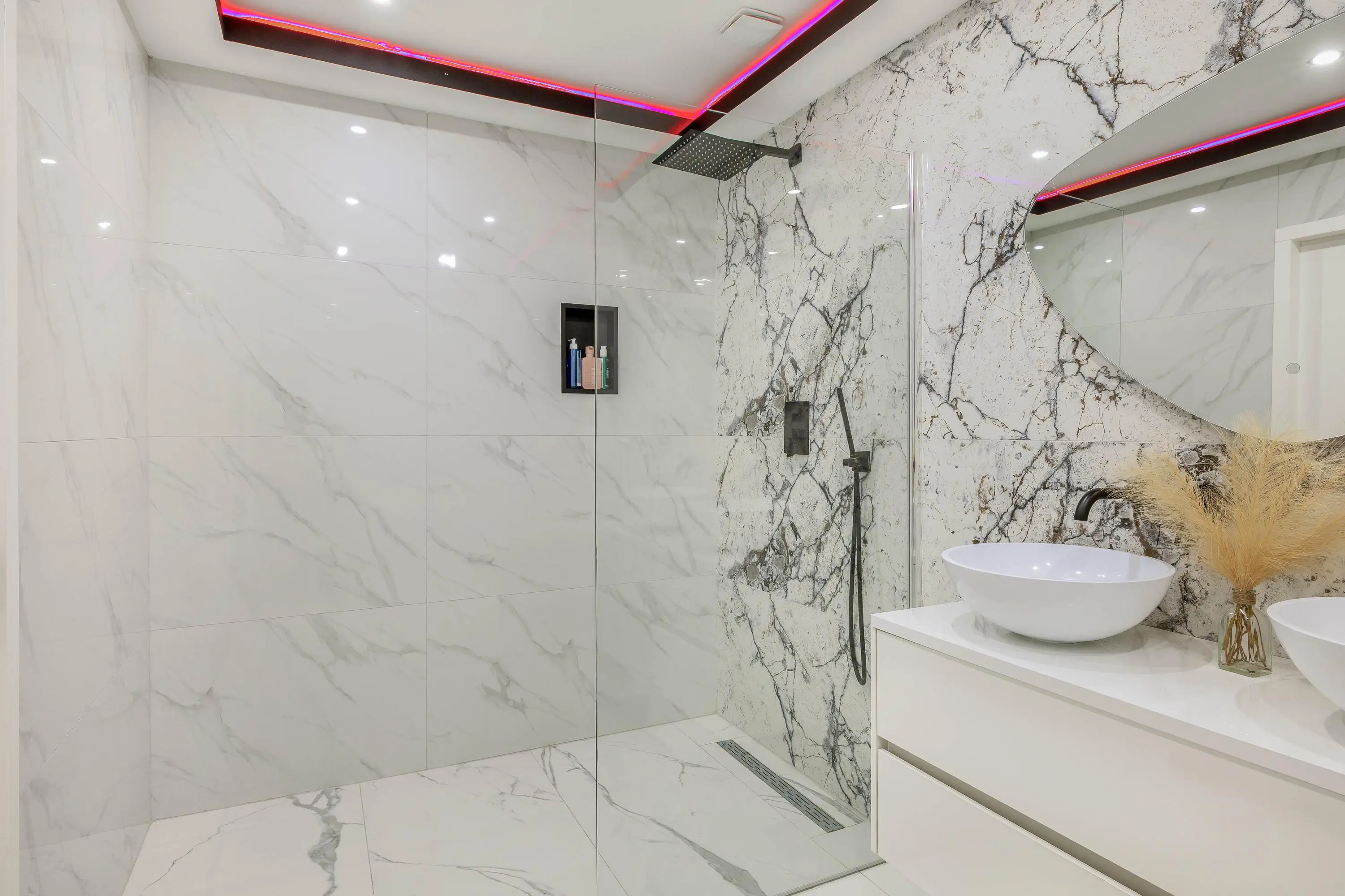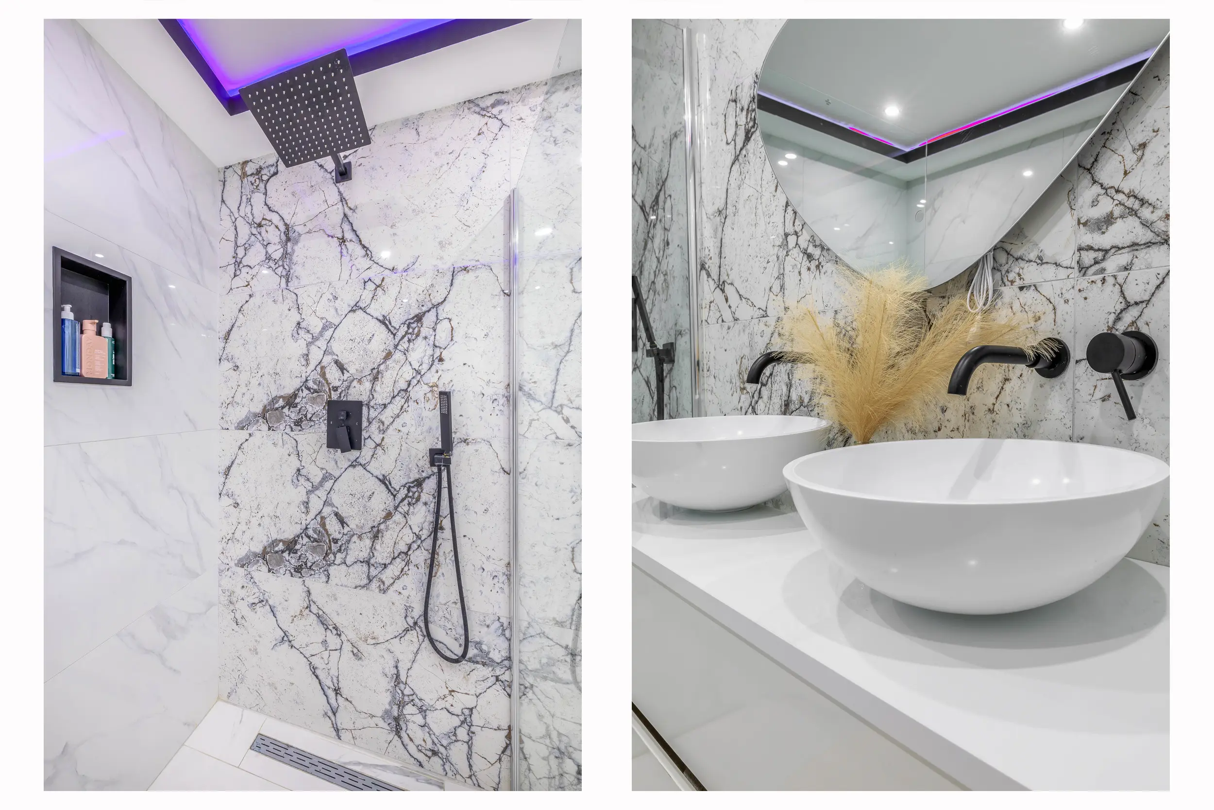 De badkamer is volledig betegeld in een marmerlook en voorzien van een plafond met geïntegreerde lichtstrip. Daarnaast beschikt de badkamer over een inloopdouche met een fijne regendouche en een modern wastafelmeubel met dubbele wastafel en bijpassende wandkast.