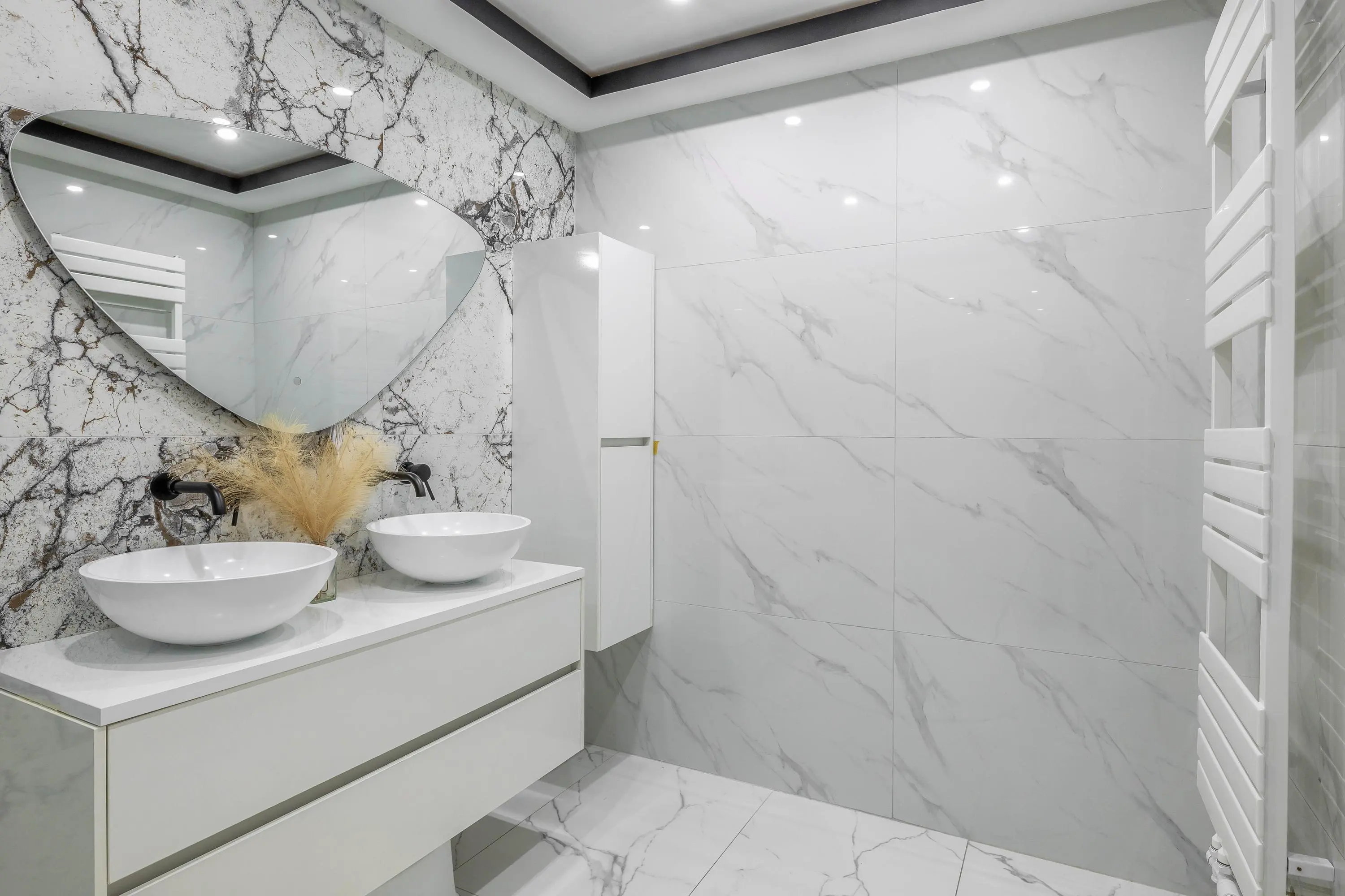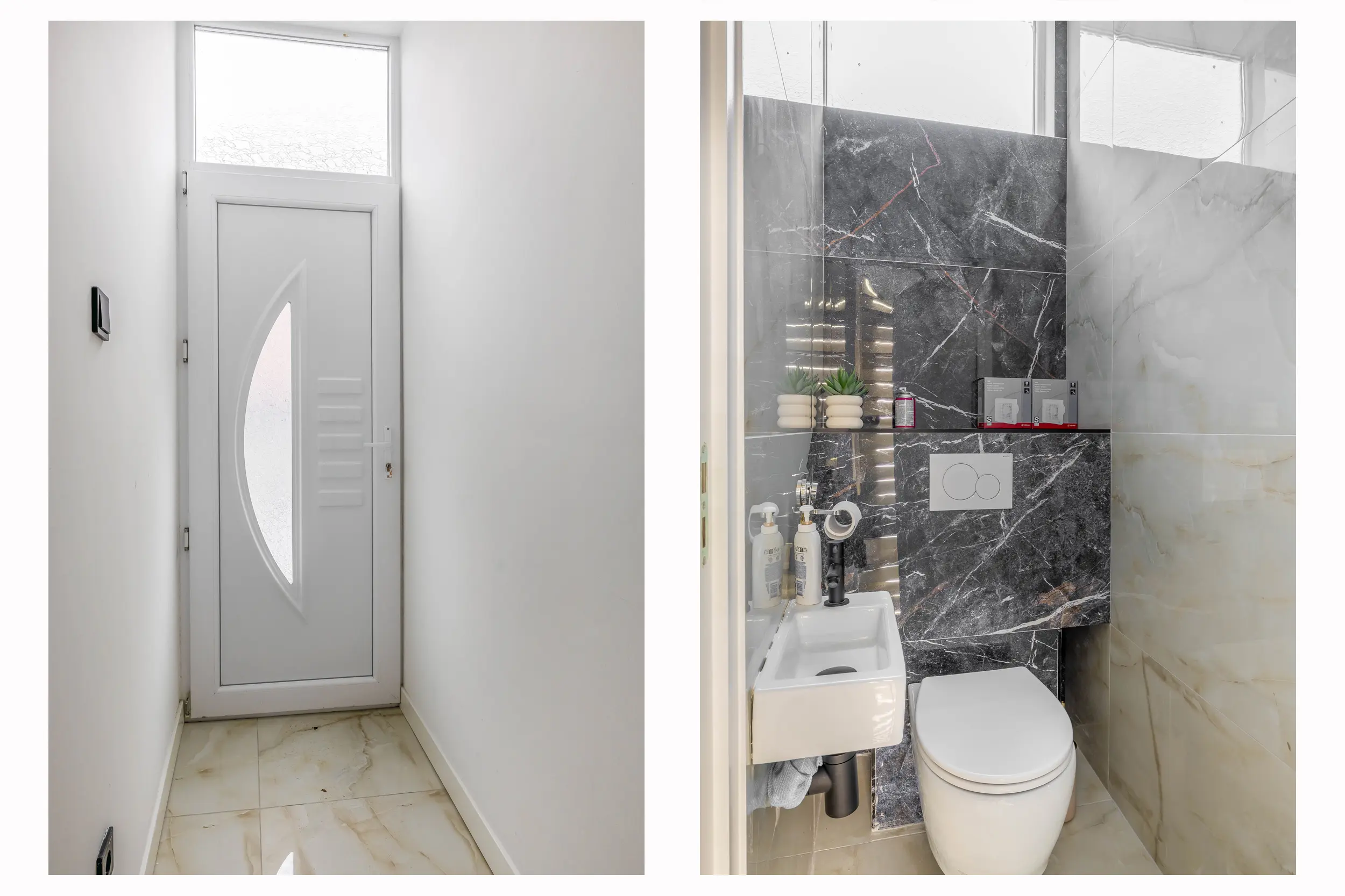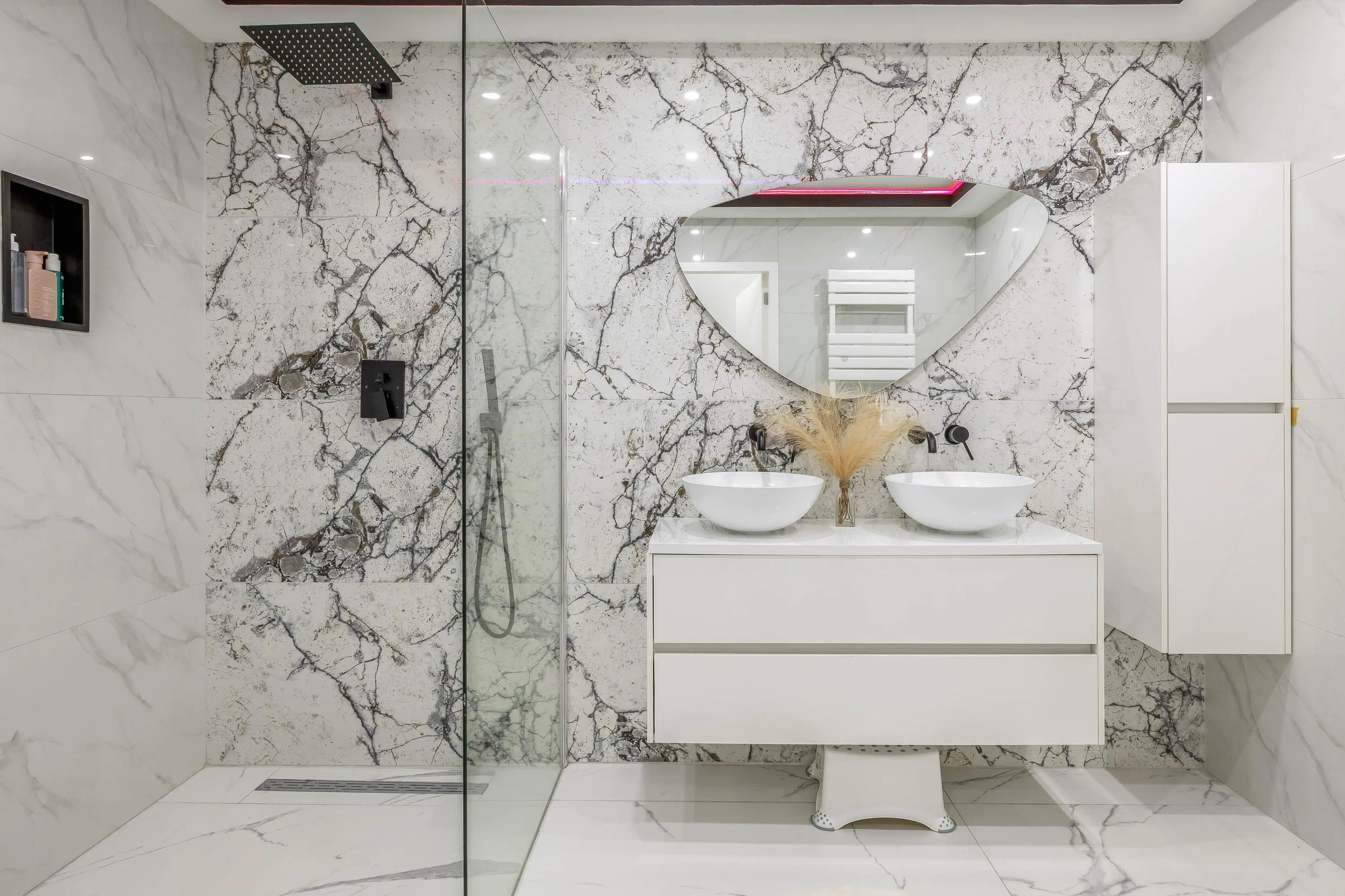 De badkamer is volledig betegeld in een marmerlook en voorzien van een plafond met geïntegreerde lichtstrip. Daarnaast beschikt de badkamer over een inloopdouche met een fijne regendouche en een modern wastafelmeubel met dubbele wastafel en bijpassende wandkast.
