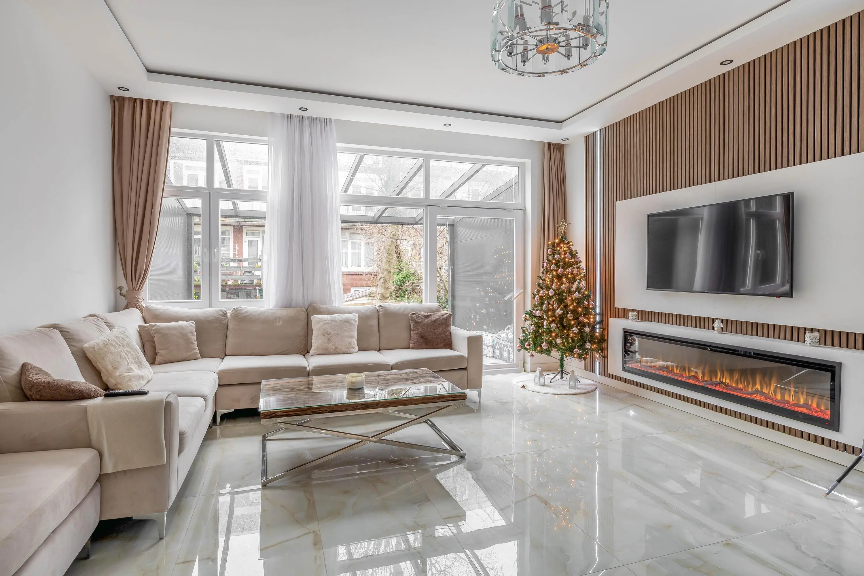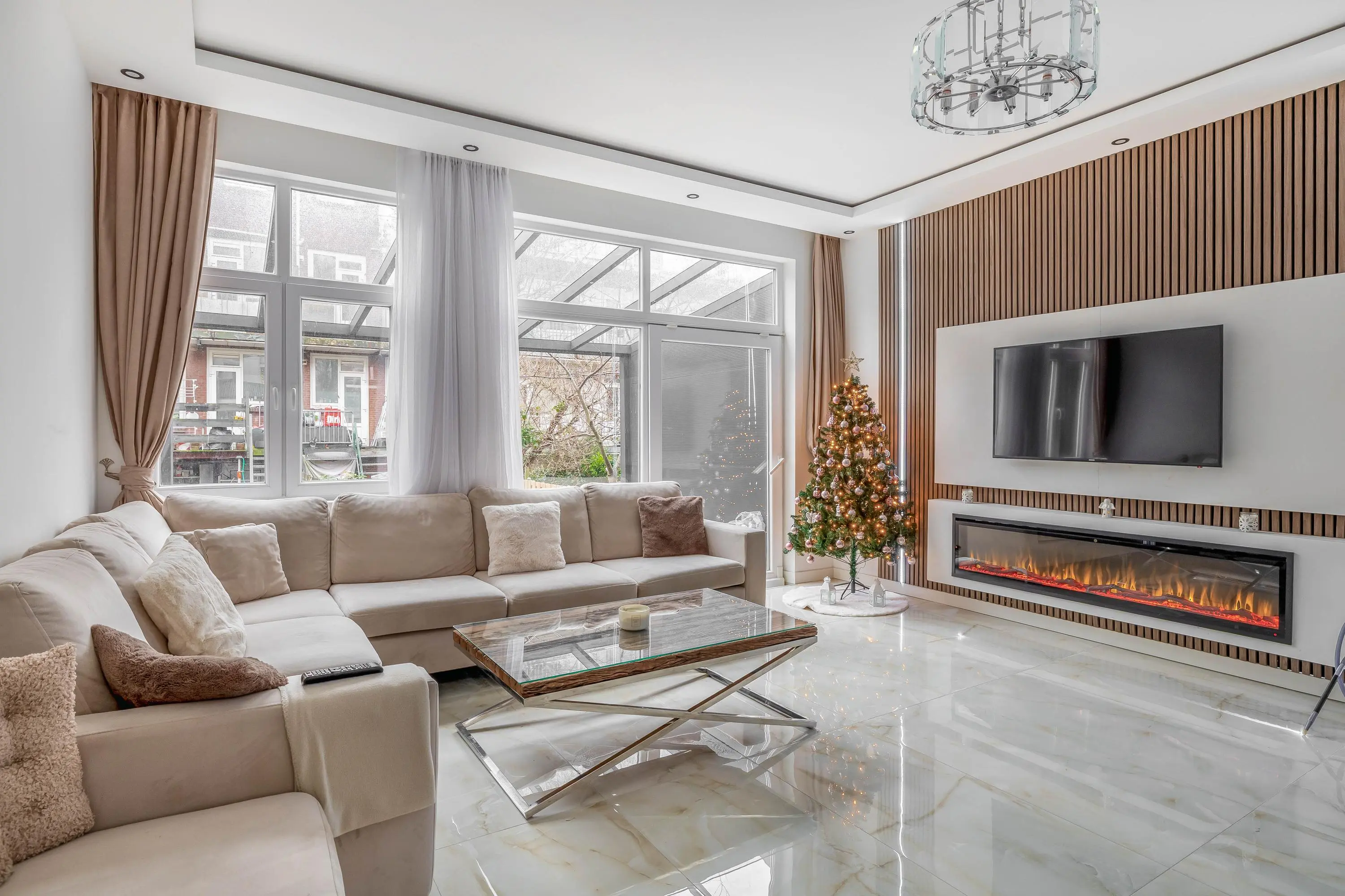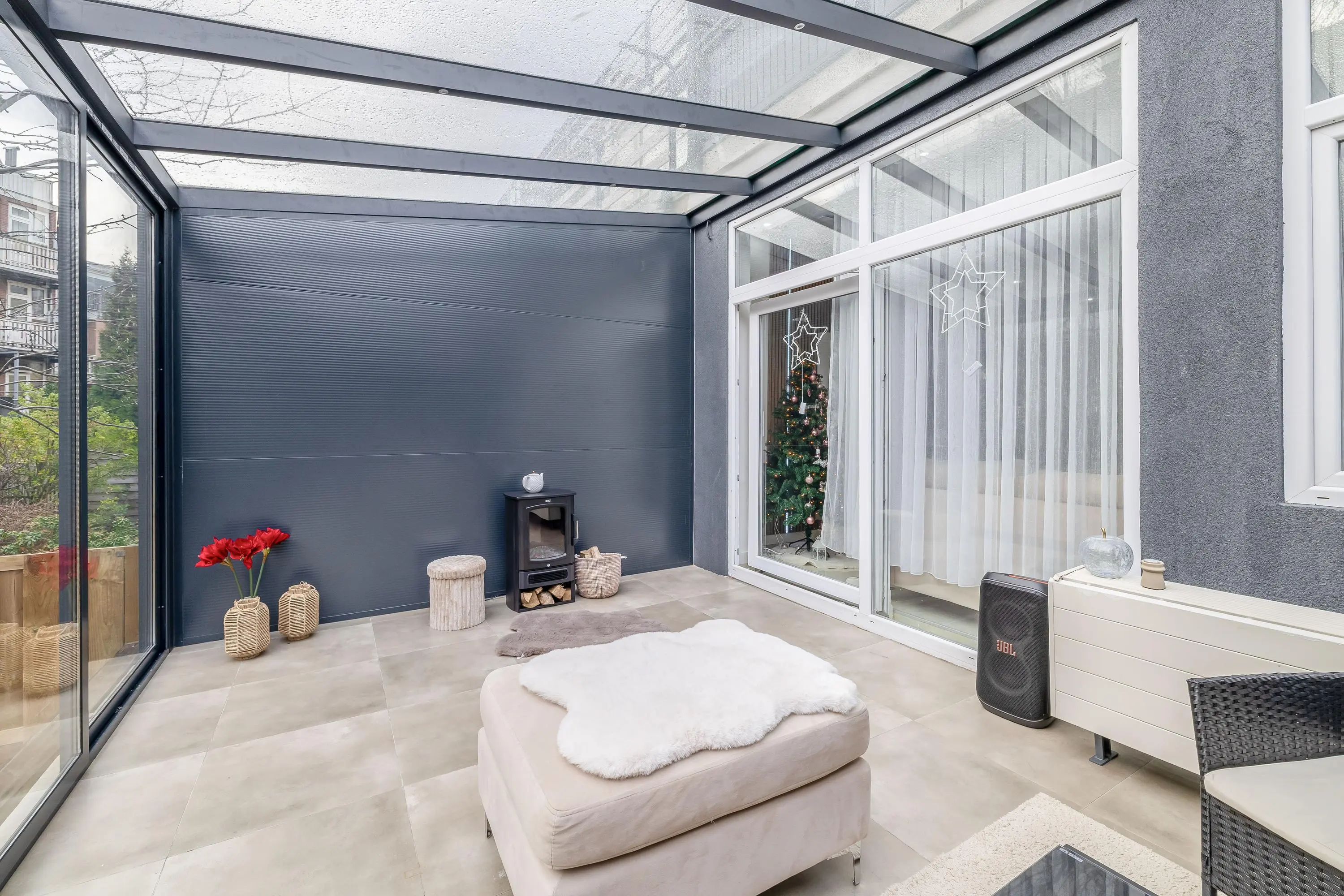 De royale leefruimte profiteert van veel natuurlijk licht dankzij de grote raampartijen en de schuifpui aan de achterzijde. Het woongedeelte is uitgerust met een moderne Cinewall met sfeerkachel en in het plafond zijn subtiele inbouwspots verwerkt. Er is volop ruimte voor een comfortabele zithoek en een eethoek. Via de schuifpui is er directe toegang tot de geïsoleerde en verwarmde serre. Vanuit de serre is er toegang tot de achtertuin.