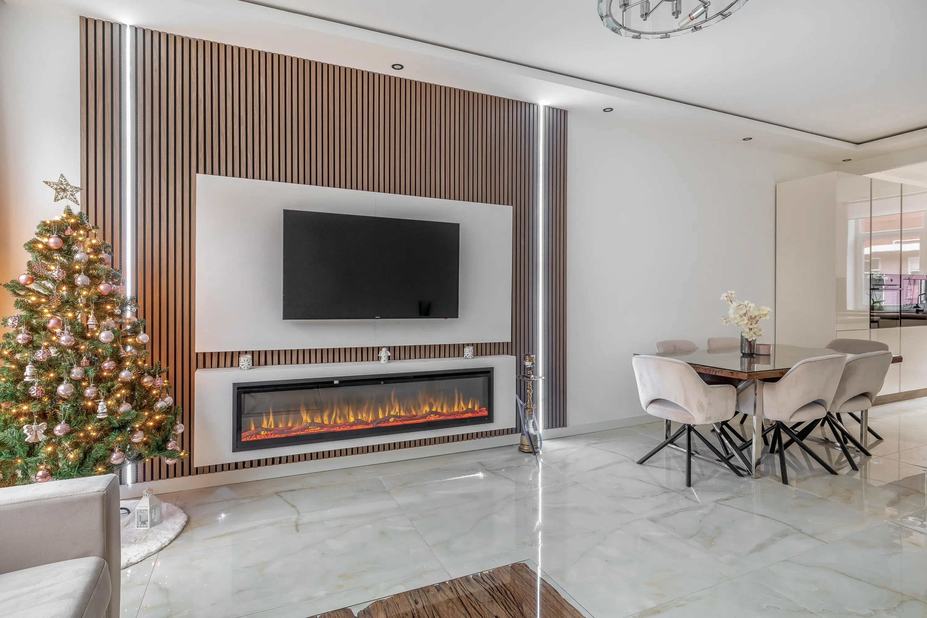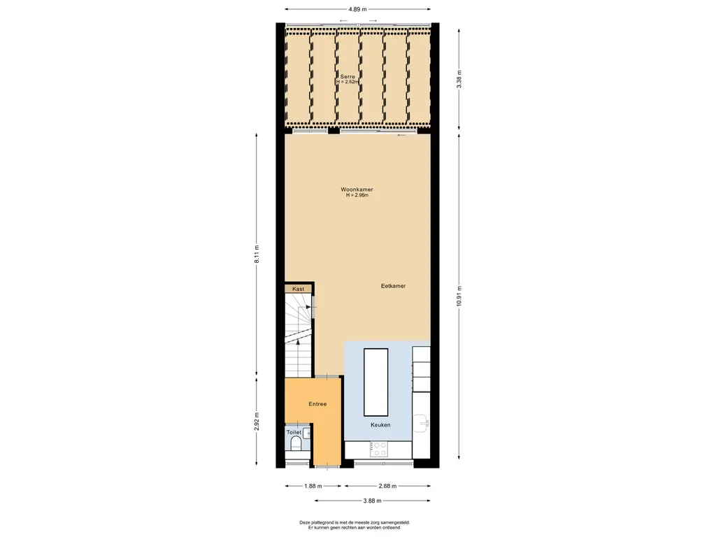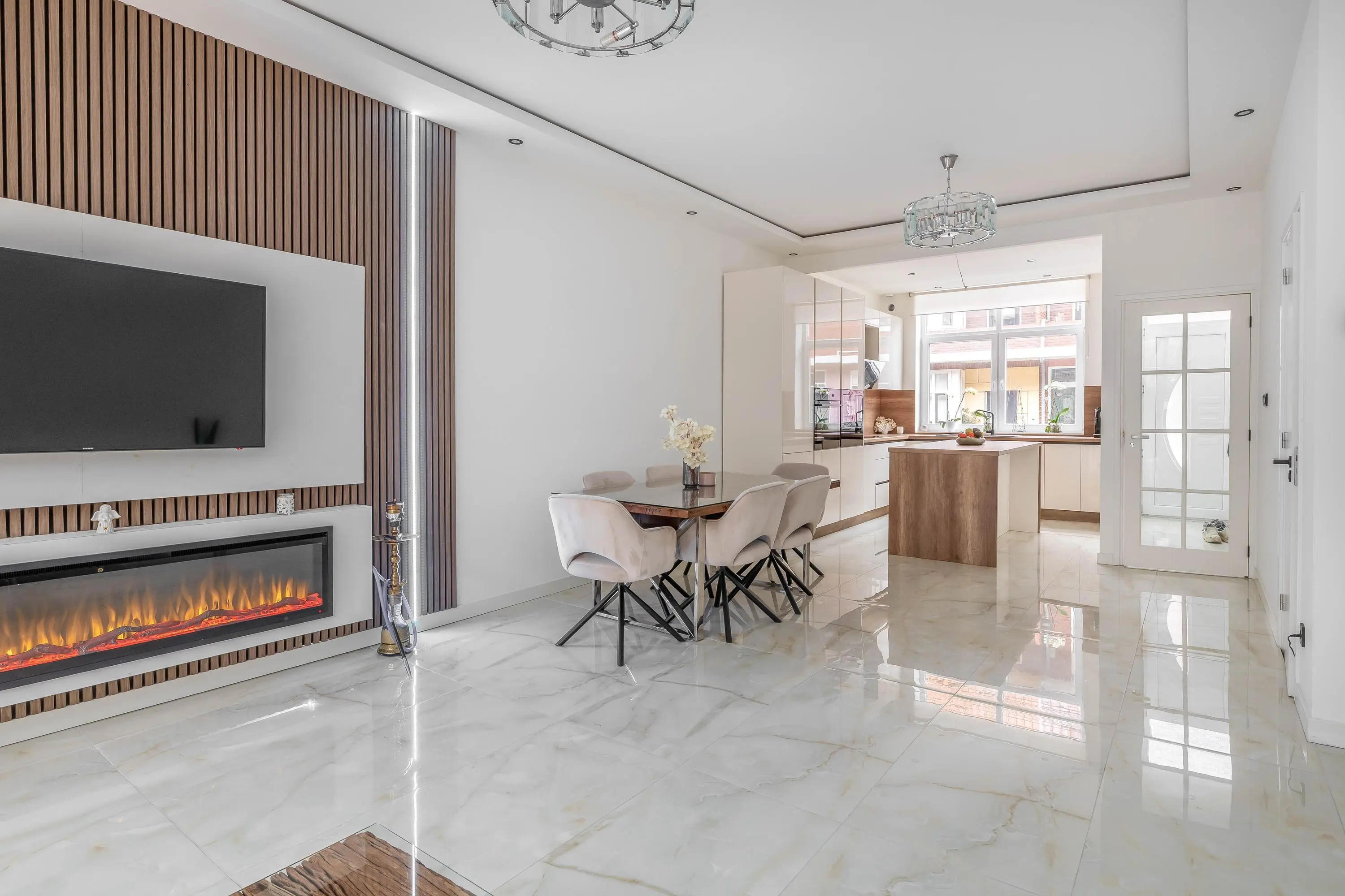 De royale leefruimte profiteert van veel natuurlijk licht dankzij de grote raampartijen en de schuifpui aan de achterzijde. Het woongedeelte is uitgerust met een moderne Cinewall met sfeerkachel en in het plafond zijn subtiele inbouwspots verwerkt. Er is volop ruimte voor een comfortabele zithoek en een eethoek. Via de schuifpui is er directe toegang tot de geïsoleerde en verwarmde serre. Vanuit de serre is er toegang tot de achtertuin.