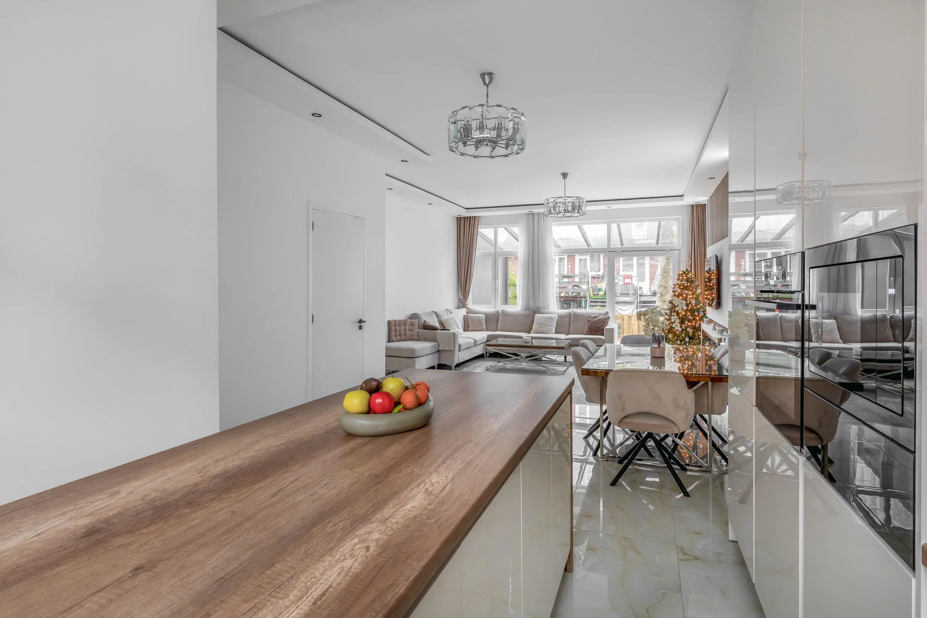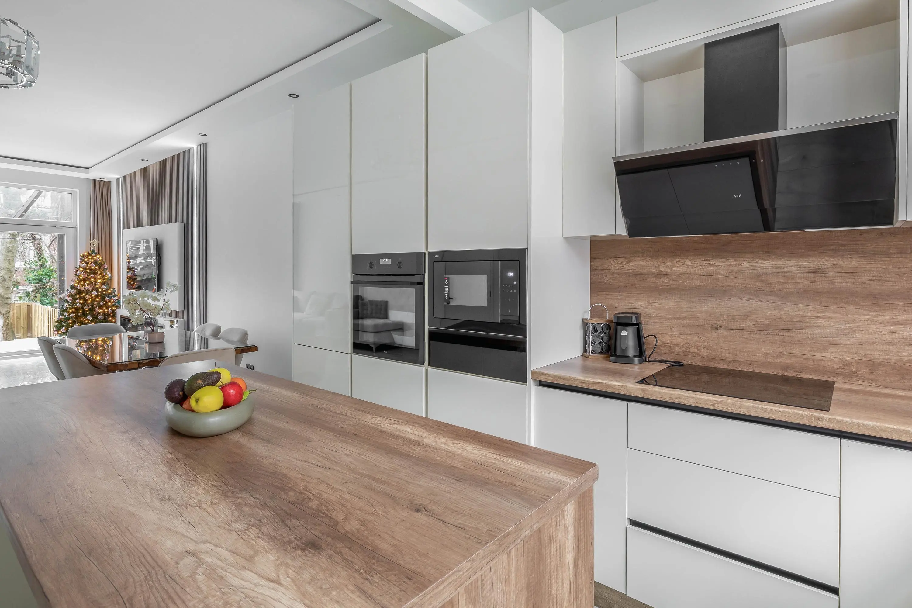 De moderne keuken is uitgevoerd in een witte kleuruitvoering met een houten werkblad. Deze is compleet uitgerust met diverse inbouwapparatuur, waaronder een inductiekookplaat, afzuigkap, oven, magnetron, vaatwasser en een koel-/vriescombinatie.