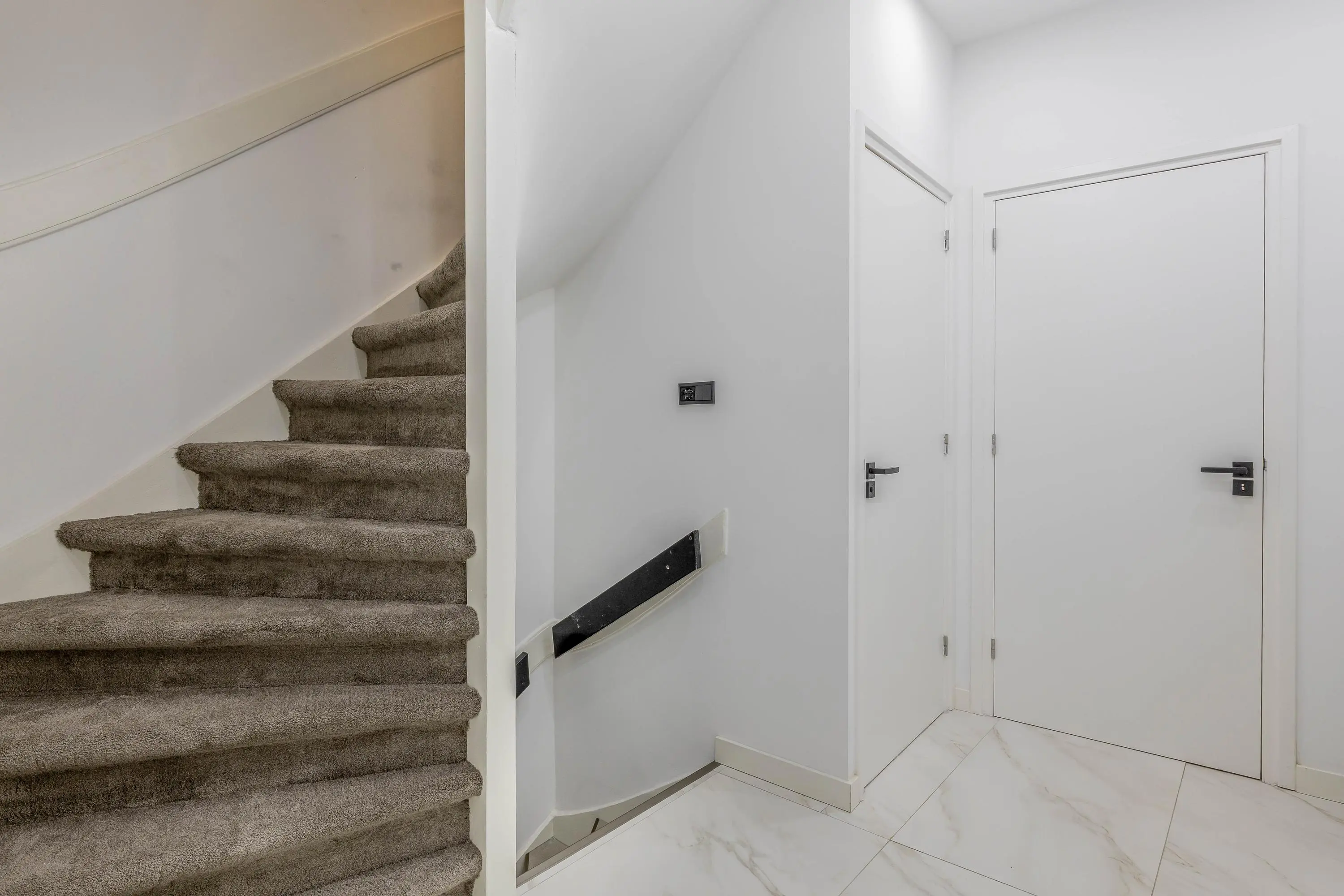 De overloop is afgewerkt met dezelfde plavuizen marmervloer en biedt toegang tot het separate toilet, twee slaapkamers en de badkamer.