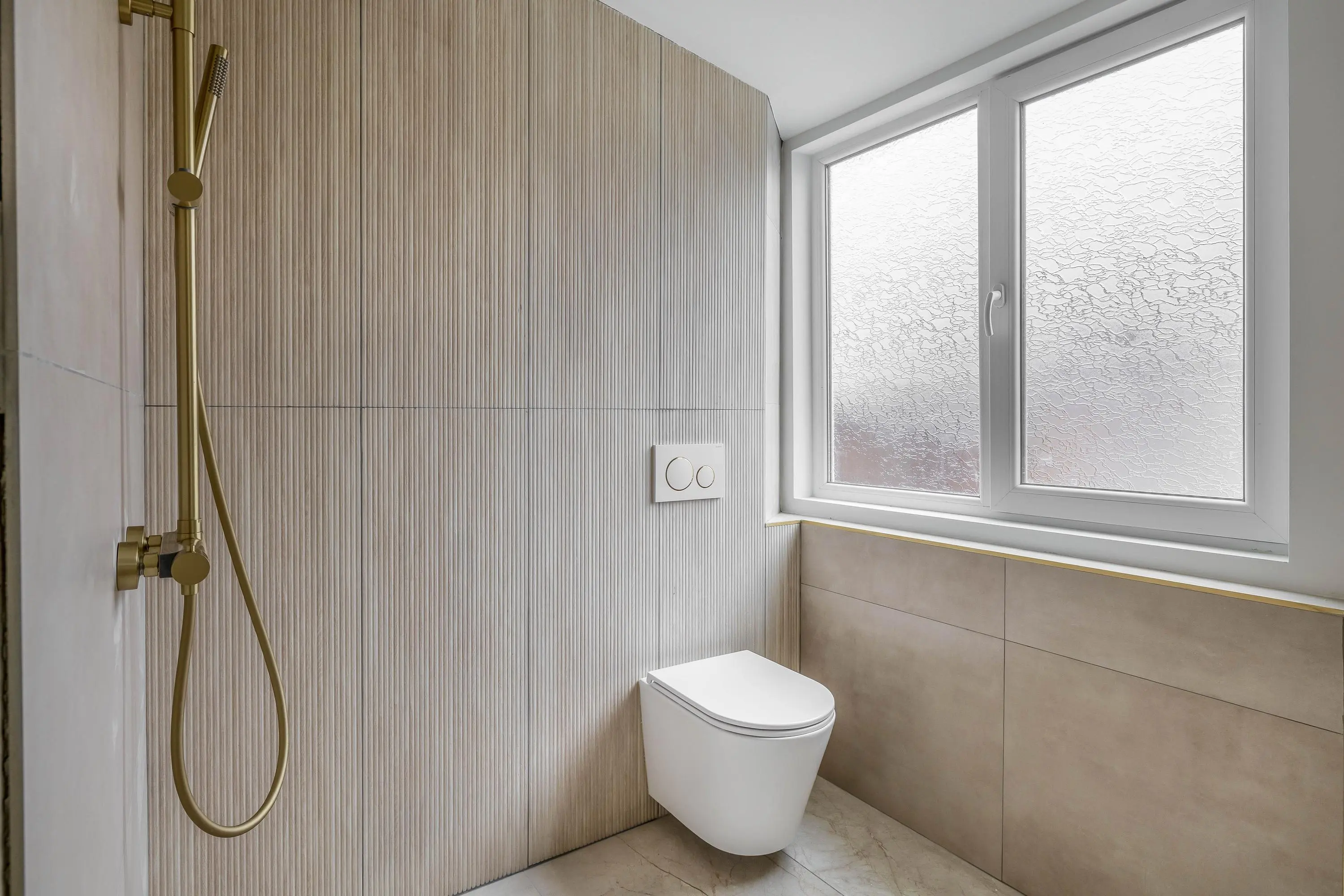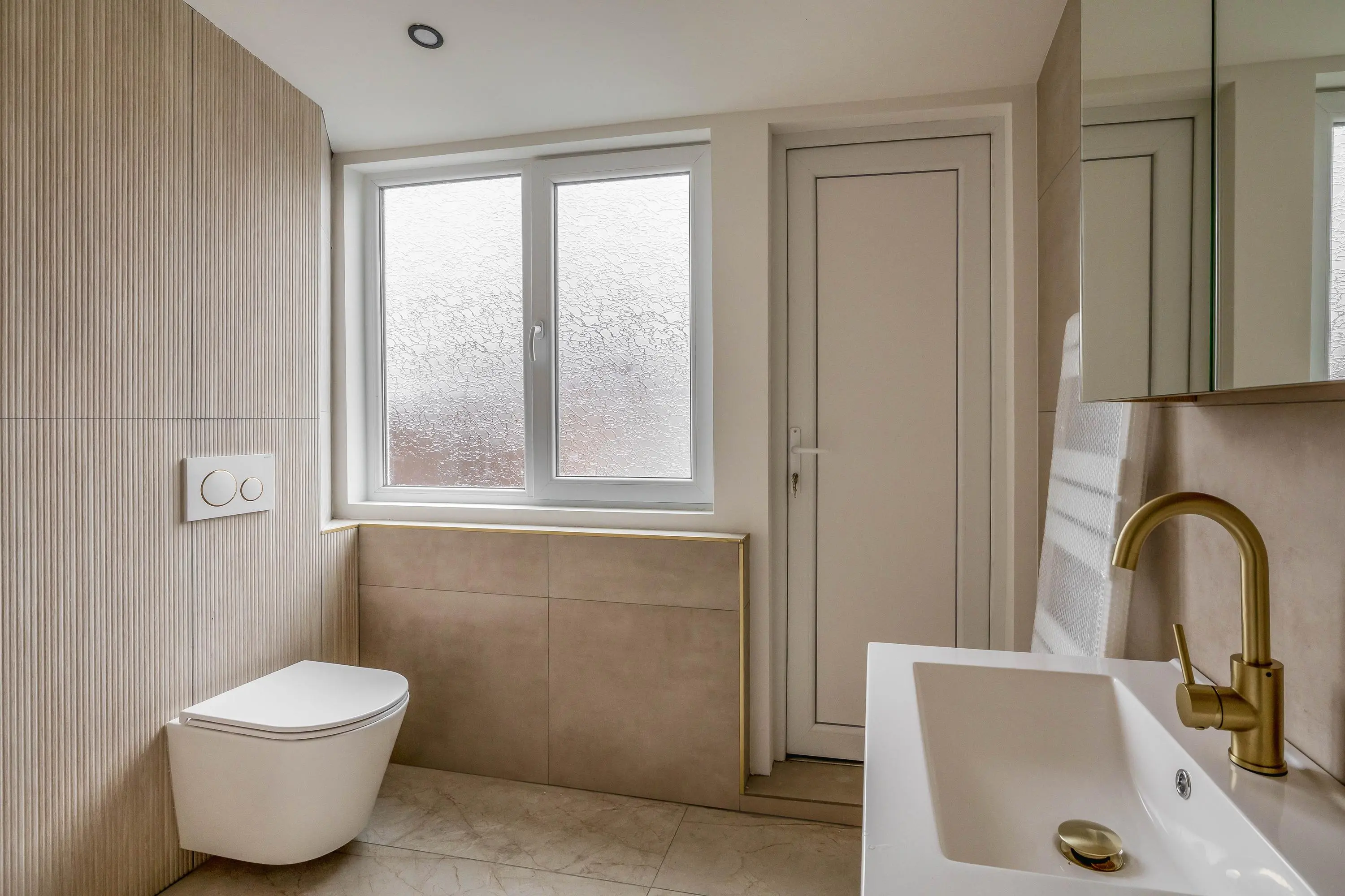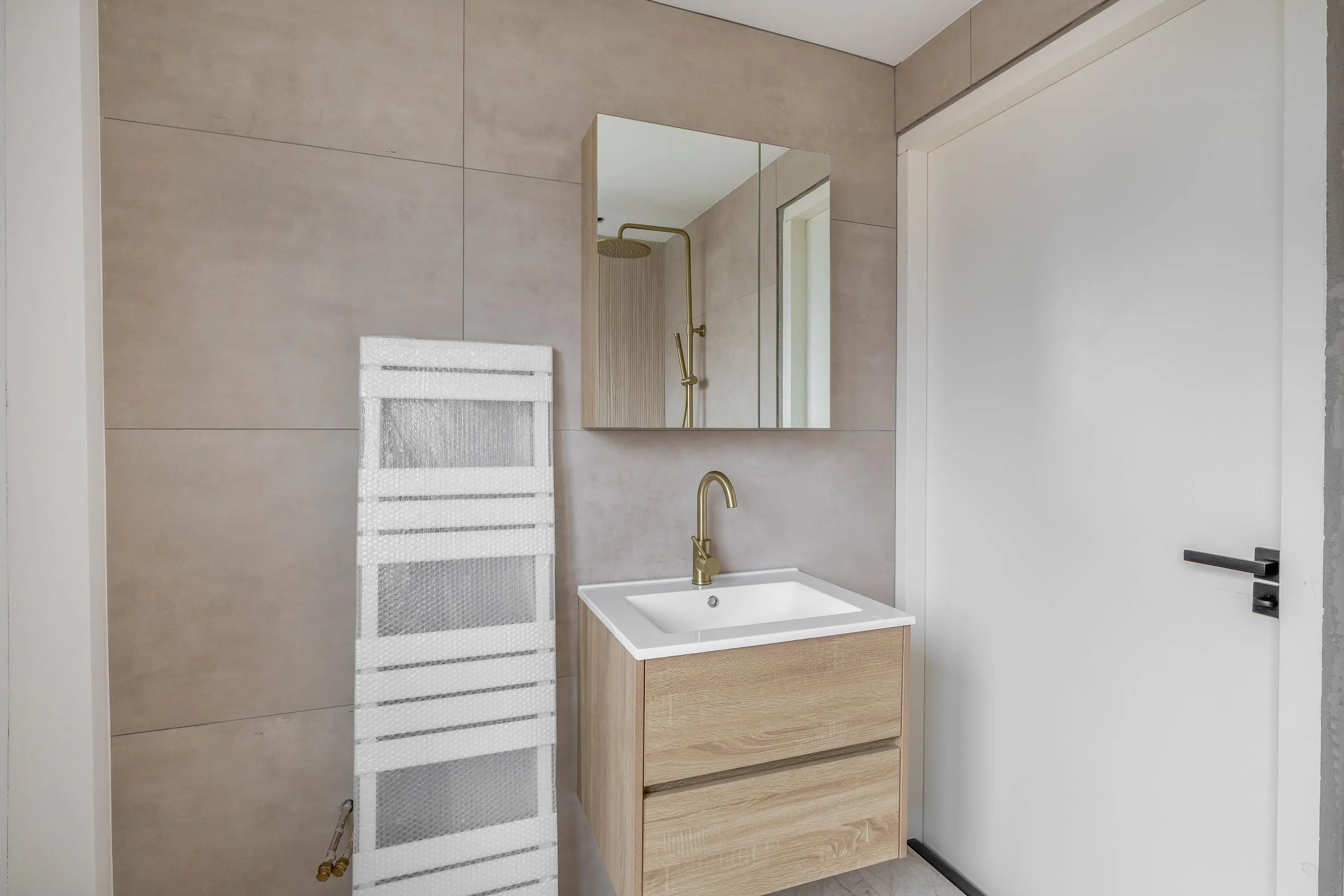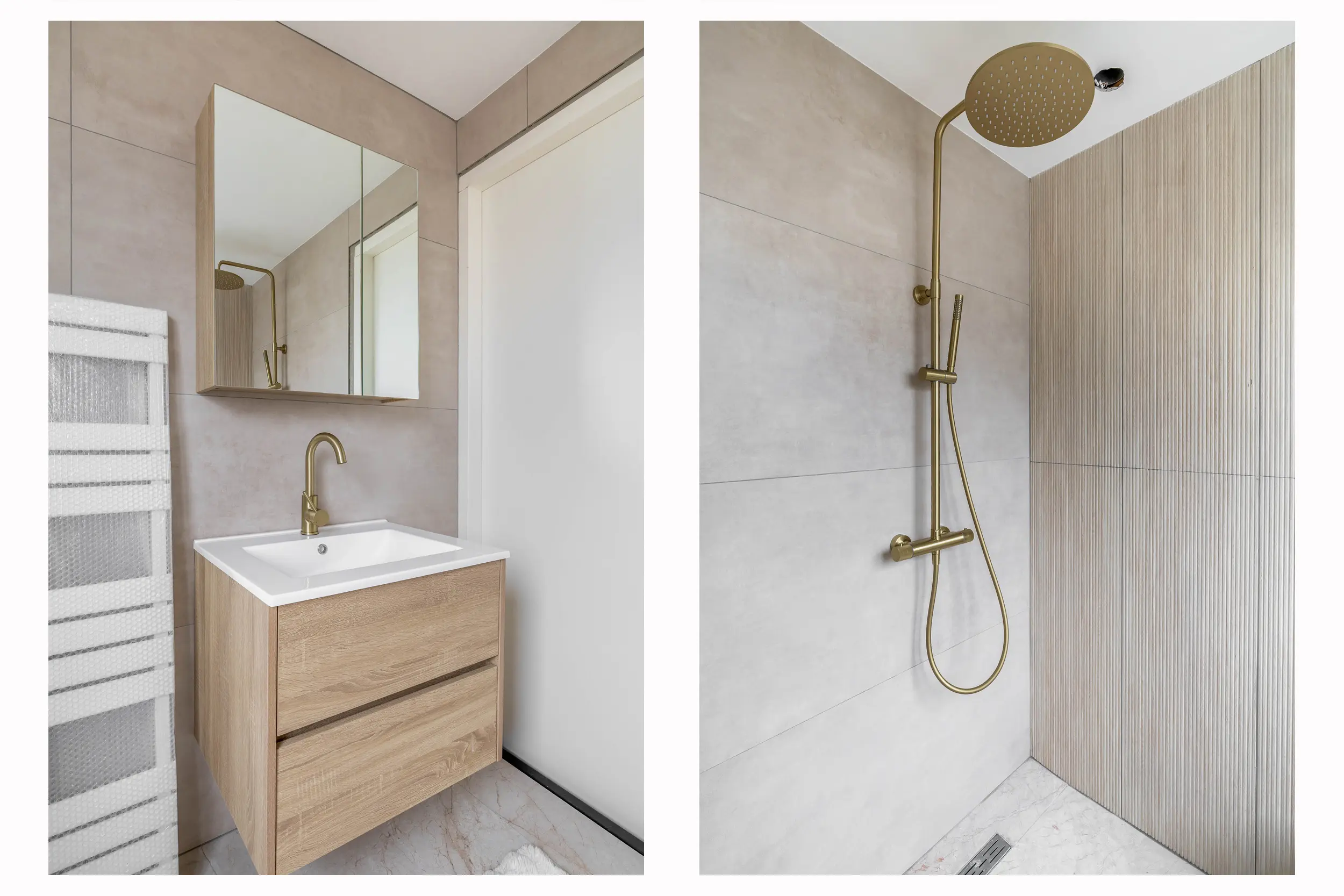 De moderne badkamer is uitgevoerd in een combinatie van hout, beige en marmerlook. Ze is voorzien van een inloopdouche, toilet en wastafelmeubel. Vanuit de badkamer is er via een enkele deur toegang tot het balkon.