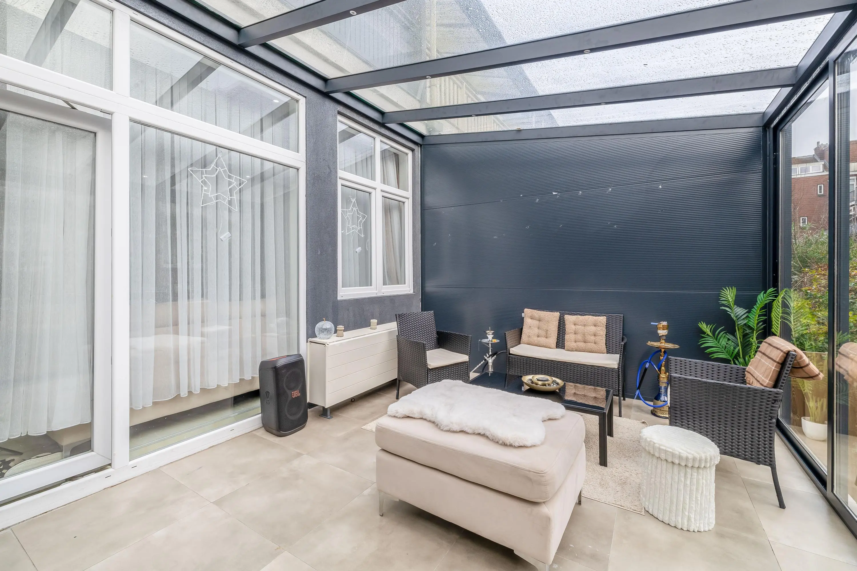 De achtertuin ligt op het zuidwesten en geniet van volop zon. Aan de woning is een sfeervolle serre geplaatst, op hetzelfde niveau als de woonkamer, waar u eenvoudig een gezellige loungehoek kunt creëren. Ook is deze ruimte goed te gebruiken als verlengstuk van de woonkamer. Via een trap komt u in de volledig betegelde tuin met ligging op het zonnige zuiden.