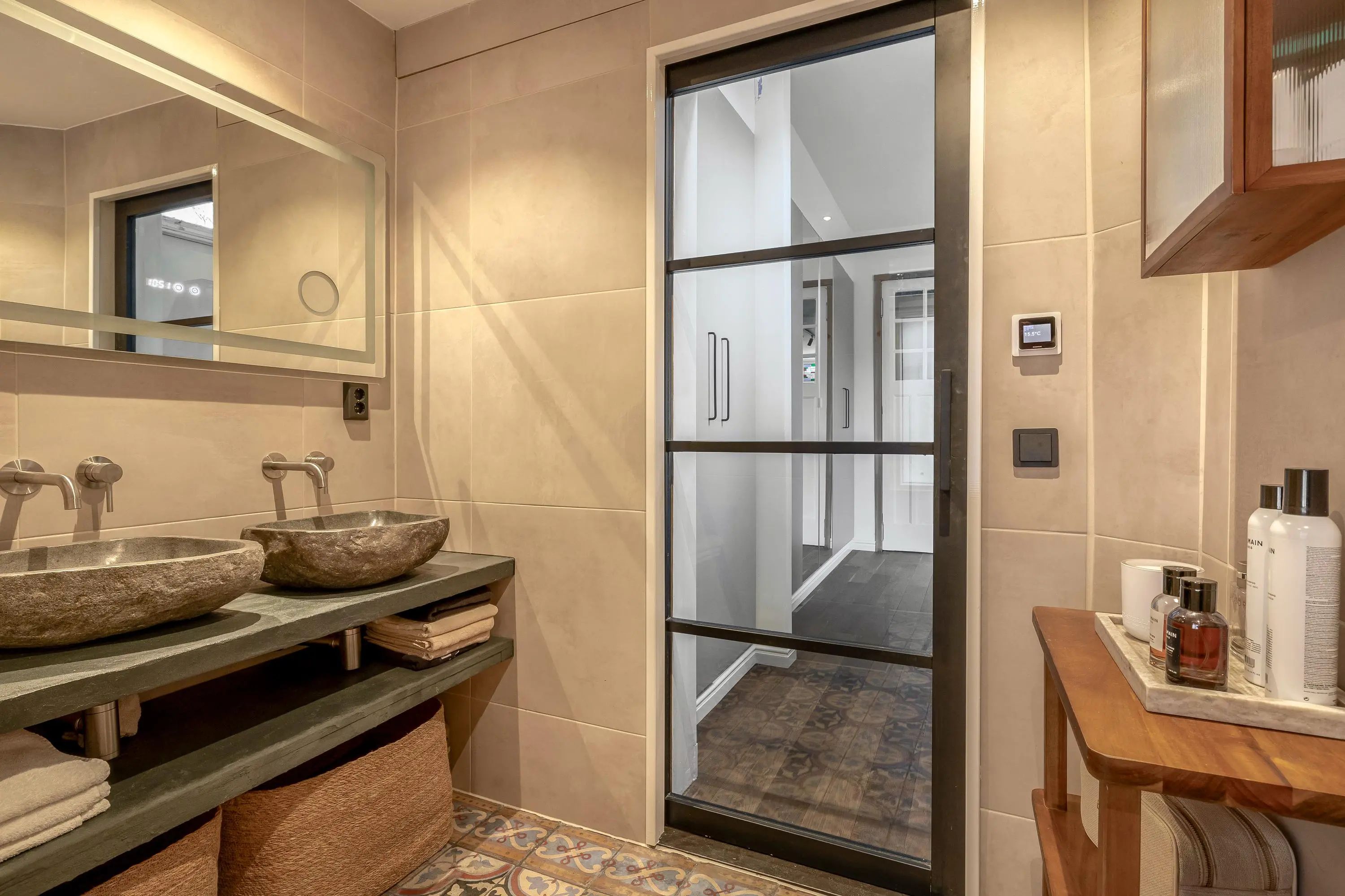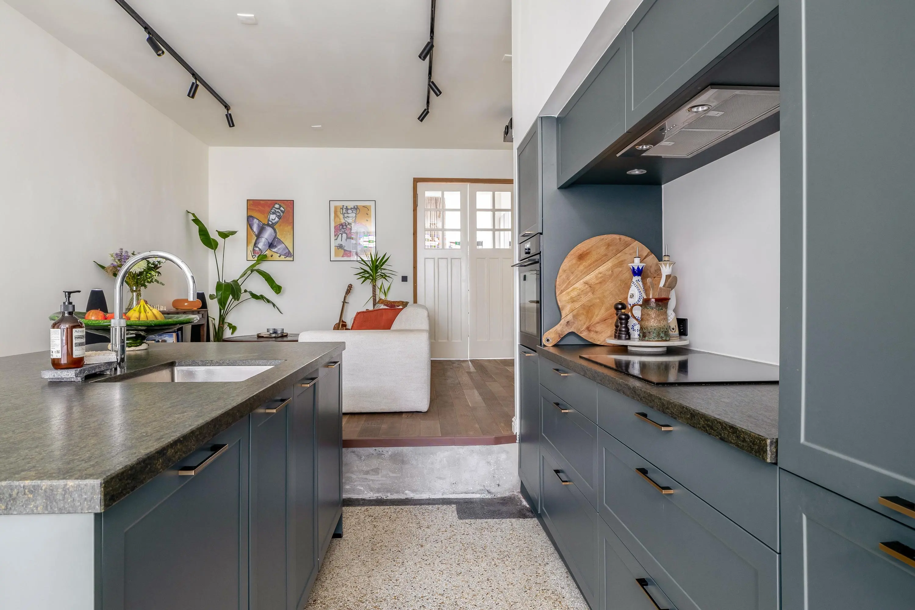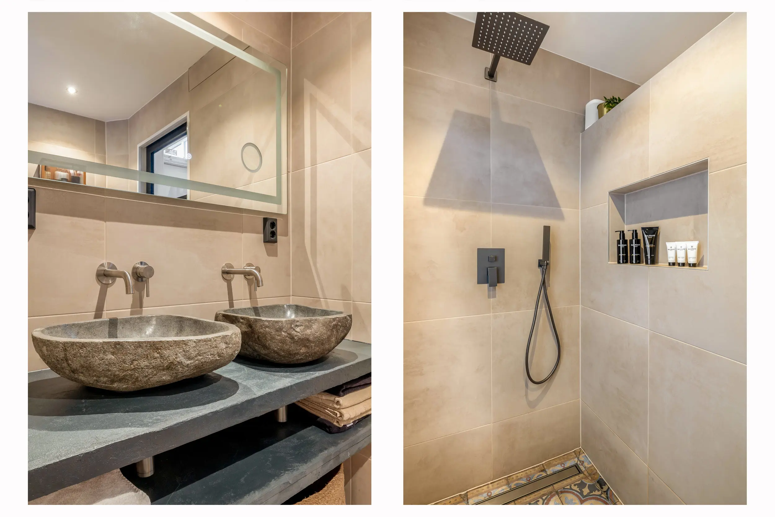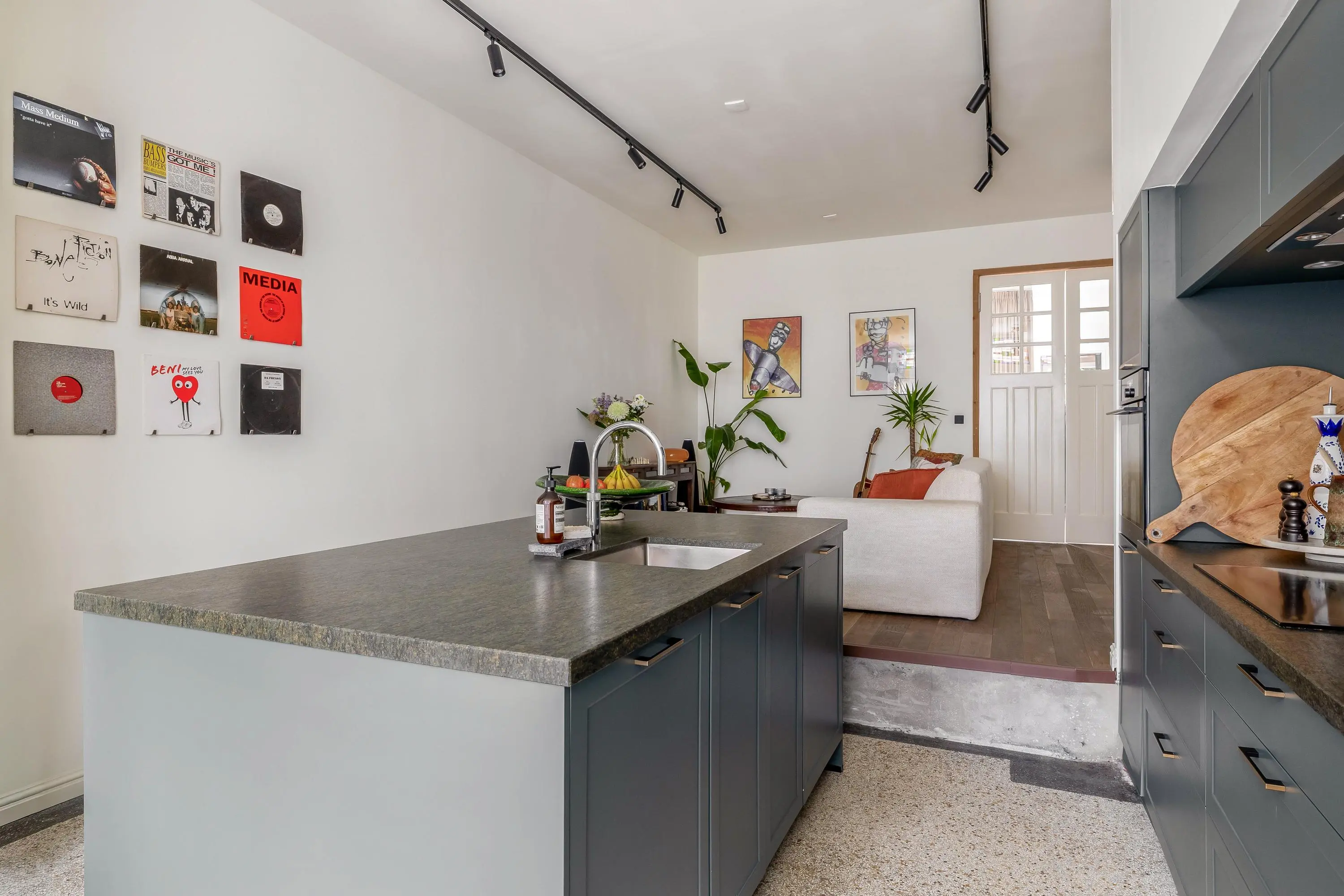 De entree in de woning is in de fantastische woonkeuken. Er is een losse meterkast aanwezig. De woonkeuken bestaat uit een prachtig eiland met daarin een wijnklimaatkast, Quooker, vaatwasser en een granieten aanrechtblad. Daarbij is er natuurlijk ook een rechte wandopstelling aanwezig met daarin de oven, ruime koel-/vriescombinatie, inductie kookplaat met daarboven een ingebouwde afzuiging naar buiten toe en opnieuw een granieten blad. Dit gedeelte van de woning is voorzien van een originele Granitovloer. Daarna is er het verhoogde zitgedeelte, welke voorzien is van een eikenhouten parket vloer. Tevens is er een ruime inbouwkast, een luxe toiletruimte met wandcloset en een trap naar de kelder aanwezig. Vanuit de woonkamer heb je toegang tot de slaapkamer aan de achterzijde d.m.v. twee mooie openslaande deuren. Ook deze kamer is voorzien van de mooie eikenhouten parket vloer. Ook is er in deze kamer een luxe kastenwand van circa 3 meter aanwezig. De heerlijke achtertuin is bereikbaar door de openslaande deuren in deze kamer. Verder is er een praktische kast met daarin de aansluitingen voor de wasmachine en droger en de CV-opstelling. Als laatste is er uiteraard de hoogwaardige badkamer met alle benodigde sanitaire voorzieningen. Denk hierbij aan ingebouwde kranen, twee design hardstenen waskommen, een designradiator, elektrische vloerverwarming en een ruime inloopdouche met regendouche en handdouche. Kortom: een parel op Zuid!