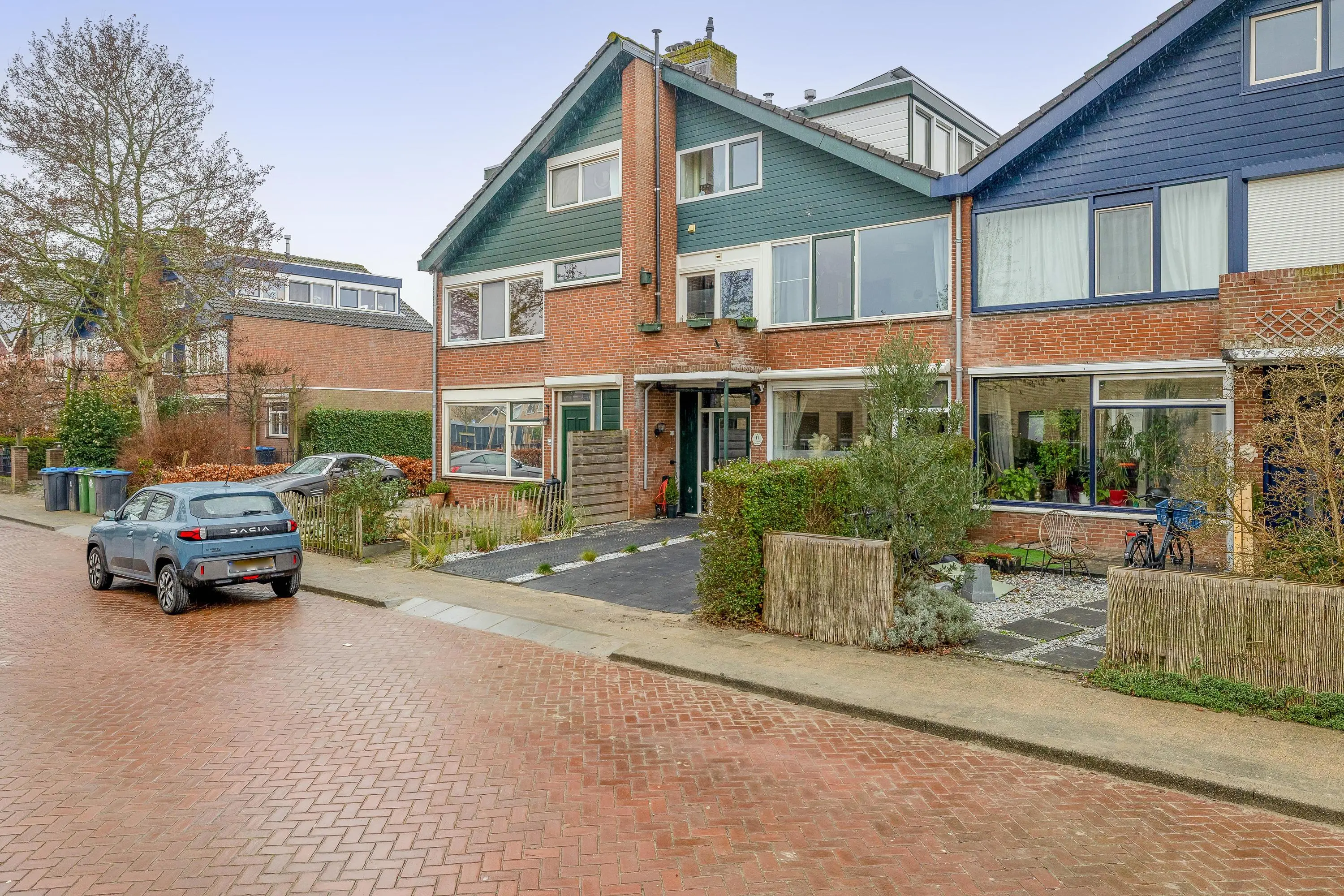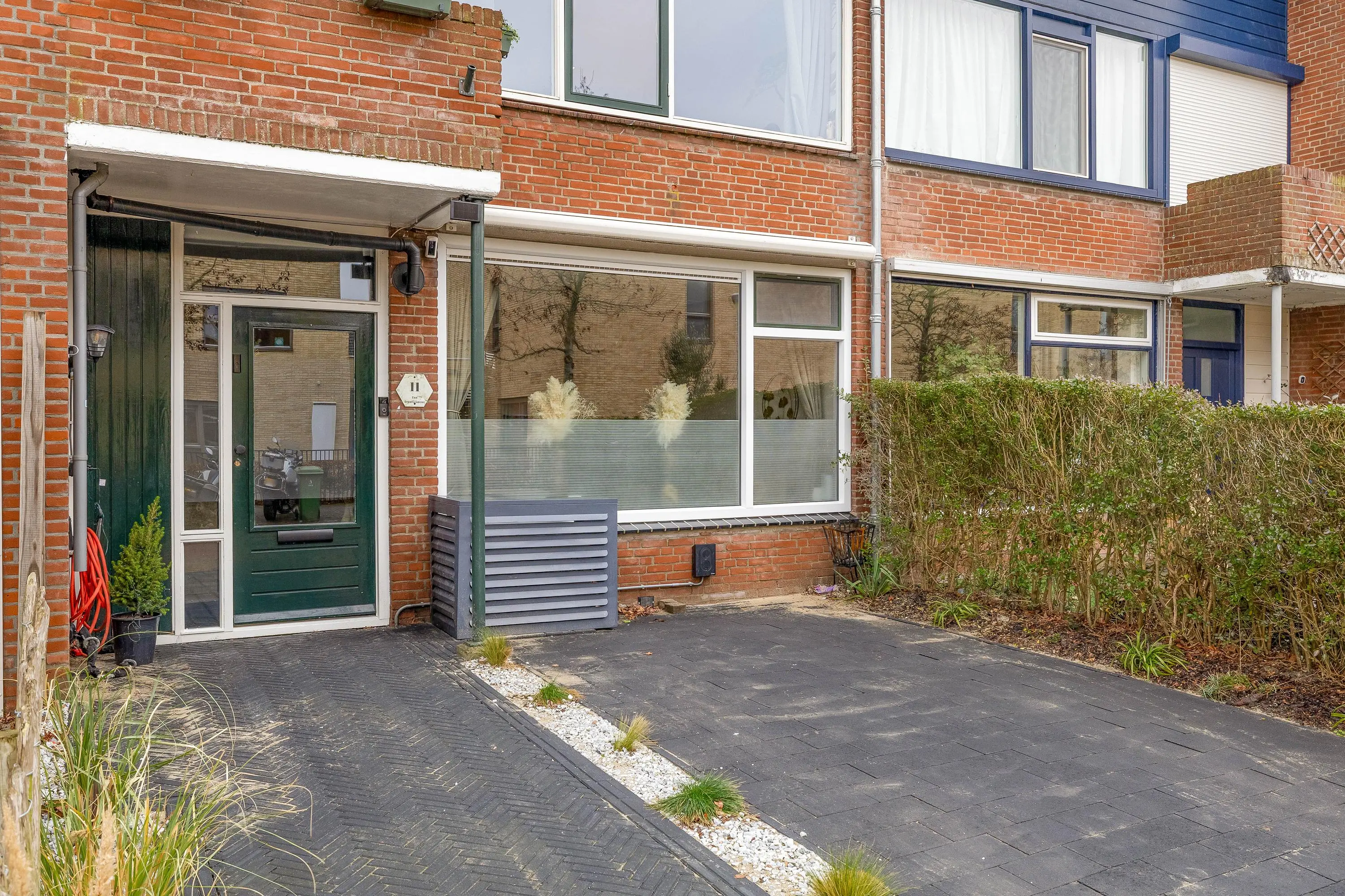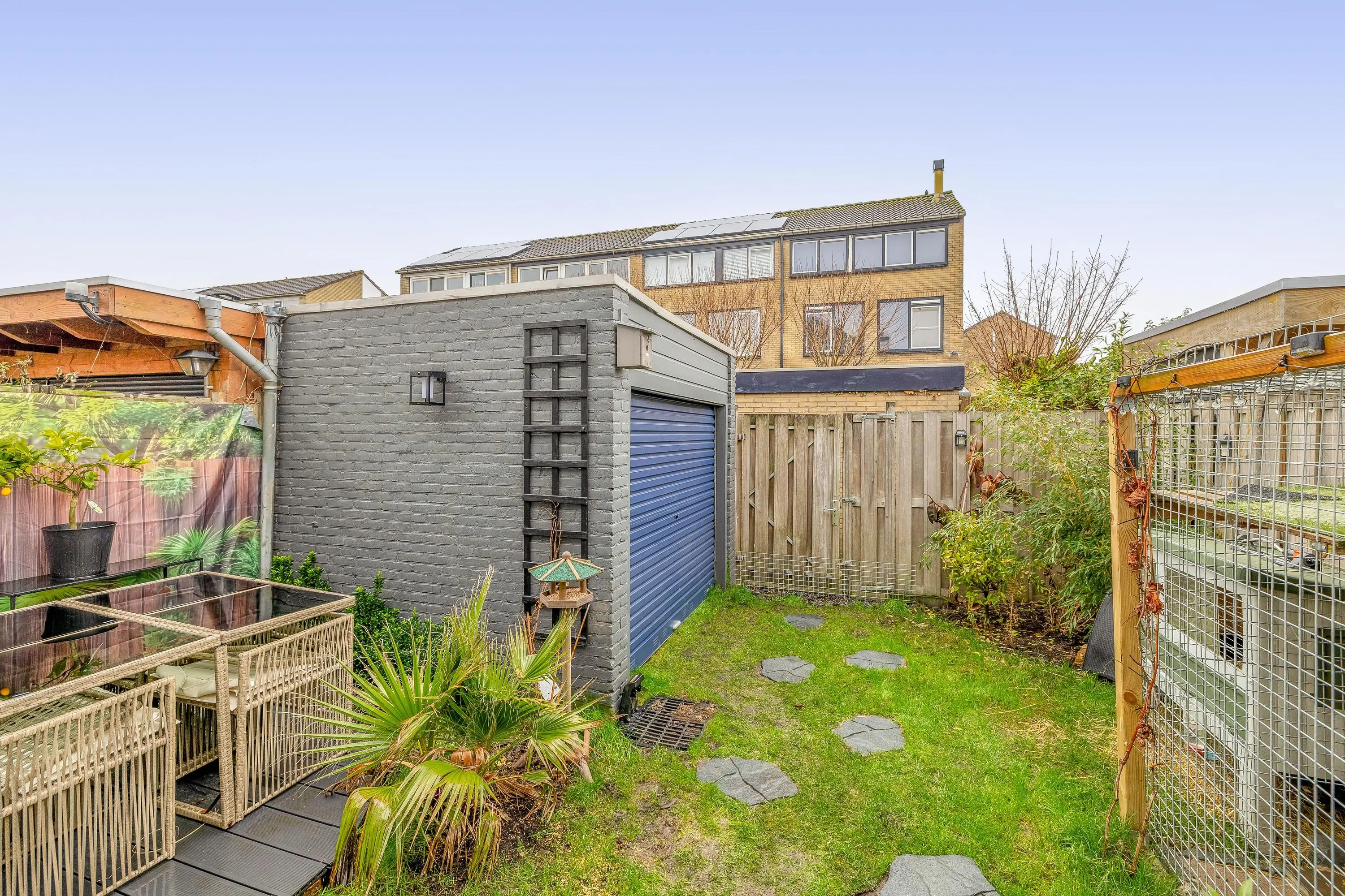 De voortuin is volledig bestraat en biedt de mogelijkheid om op eigen terrein te parkeren, inclusief een laadpunt voor een elektrische auto. Tussen het pad naar de voordeur en de parkeerplaats ligt een strook met kiezelsteentjes als subtiele scheiding. De achtertuin is een sfeervolle mix van groen, bestrating en vlonderplanken, waar eenvoudig een gezellige zithoek gerealiseerd kan worden. Daarnaast is er een stenen berging van circa 6m² aanwezig en is de tuin bereikbaar via een achterom.
