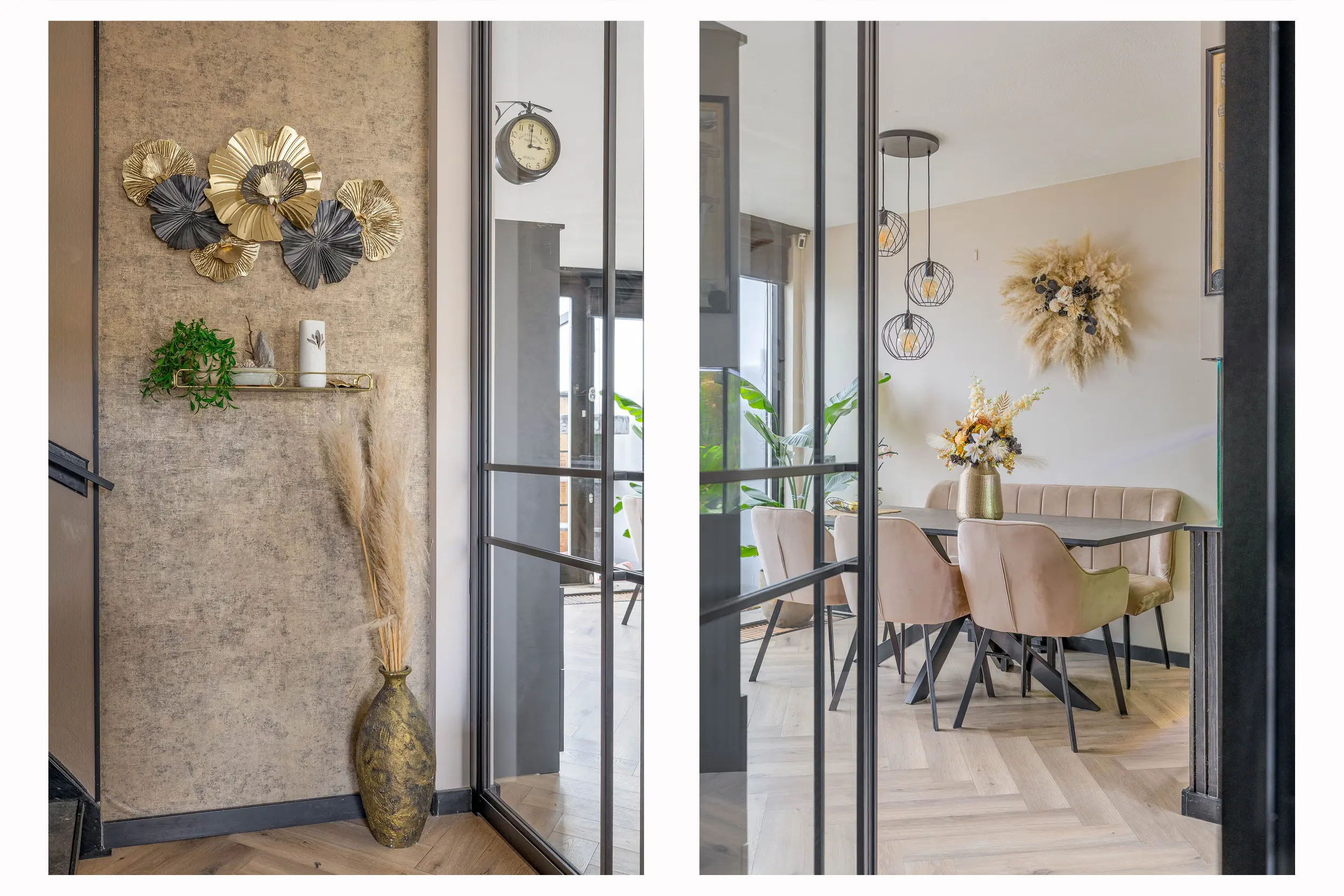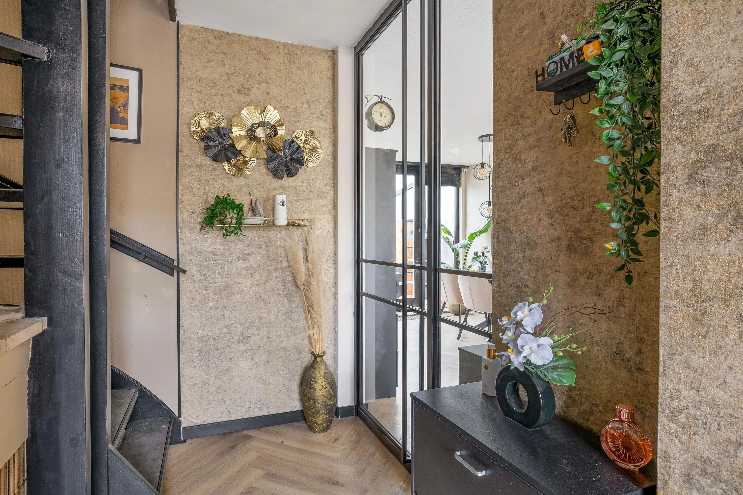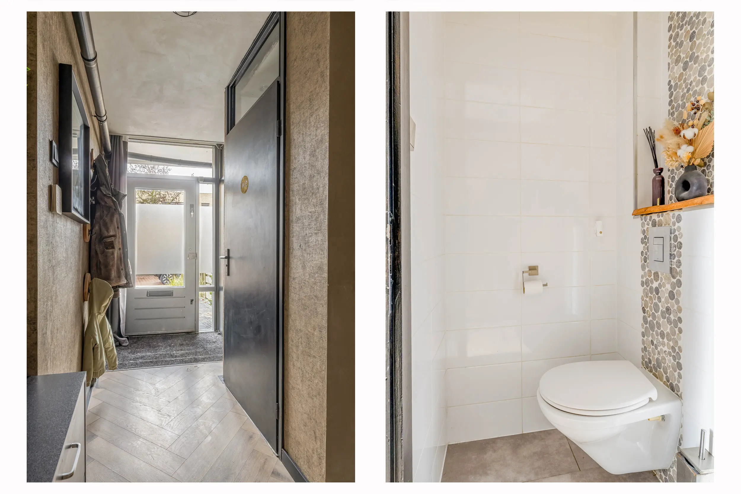 De entree/hal is voorzien van een stijlvolle laminaatvloer in visgraatmotief, die elegant doorloopt over de gehele begane grond. Hier vindt u de meterkast met een praktische inbouwkast ernaast, het separate toilet en de trapopgang naar de eerste verdieping, inclusief een handige trapkast.
