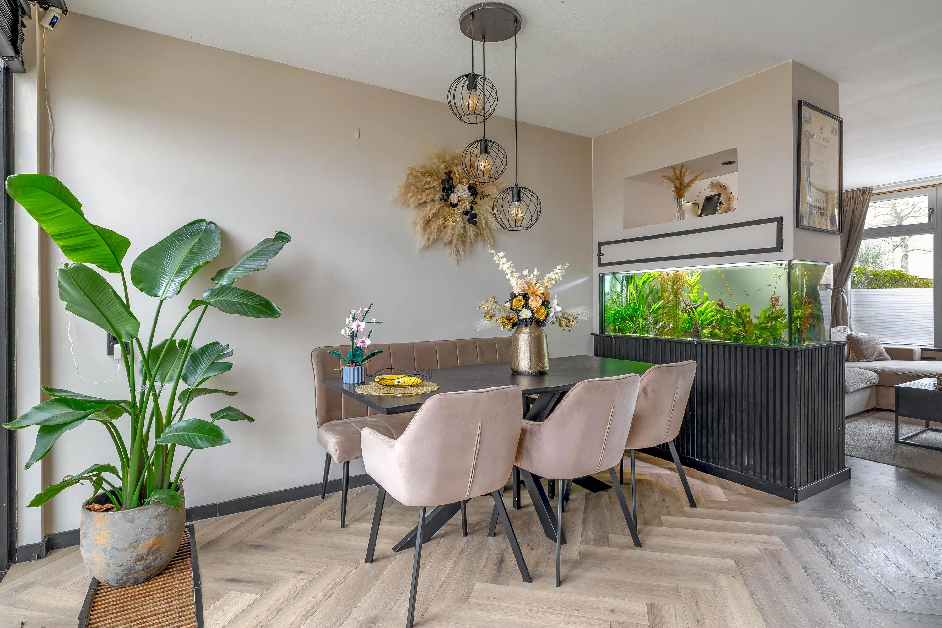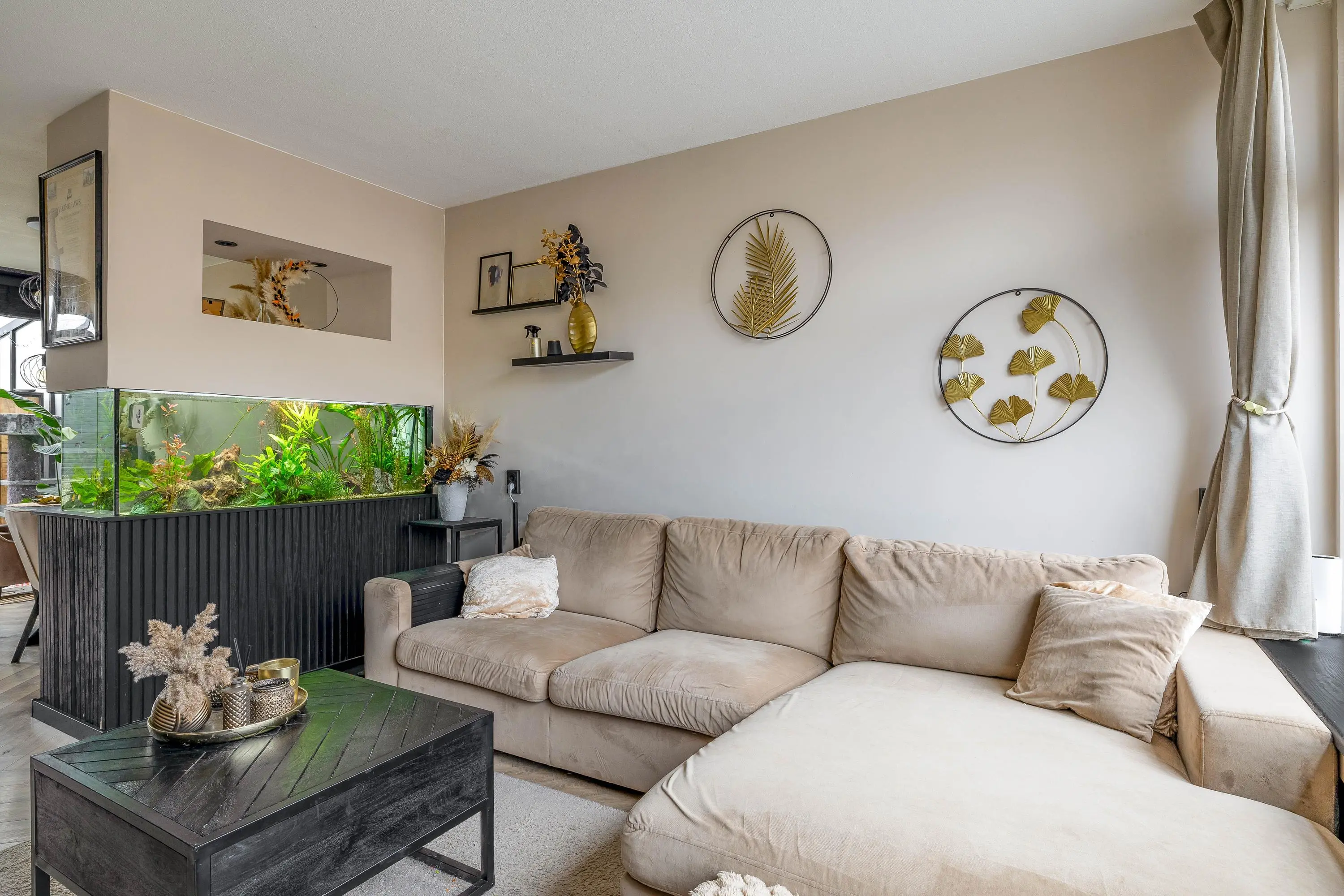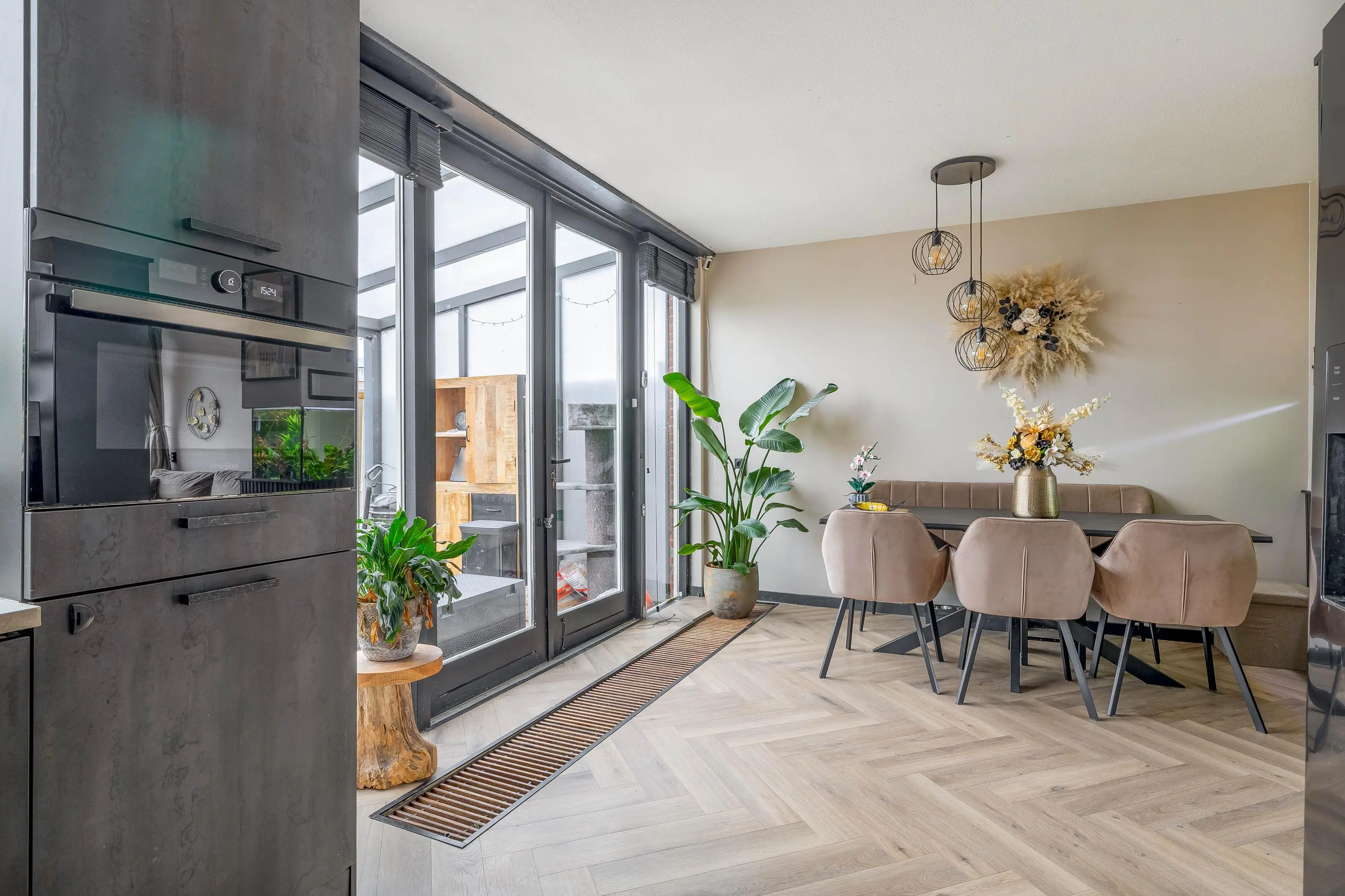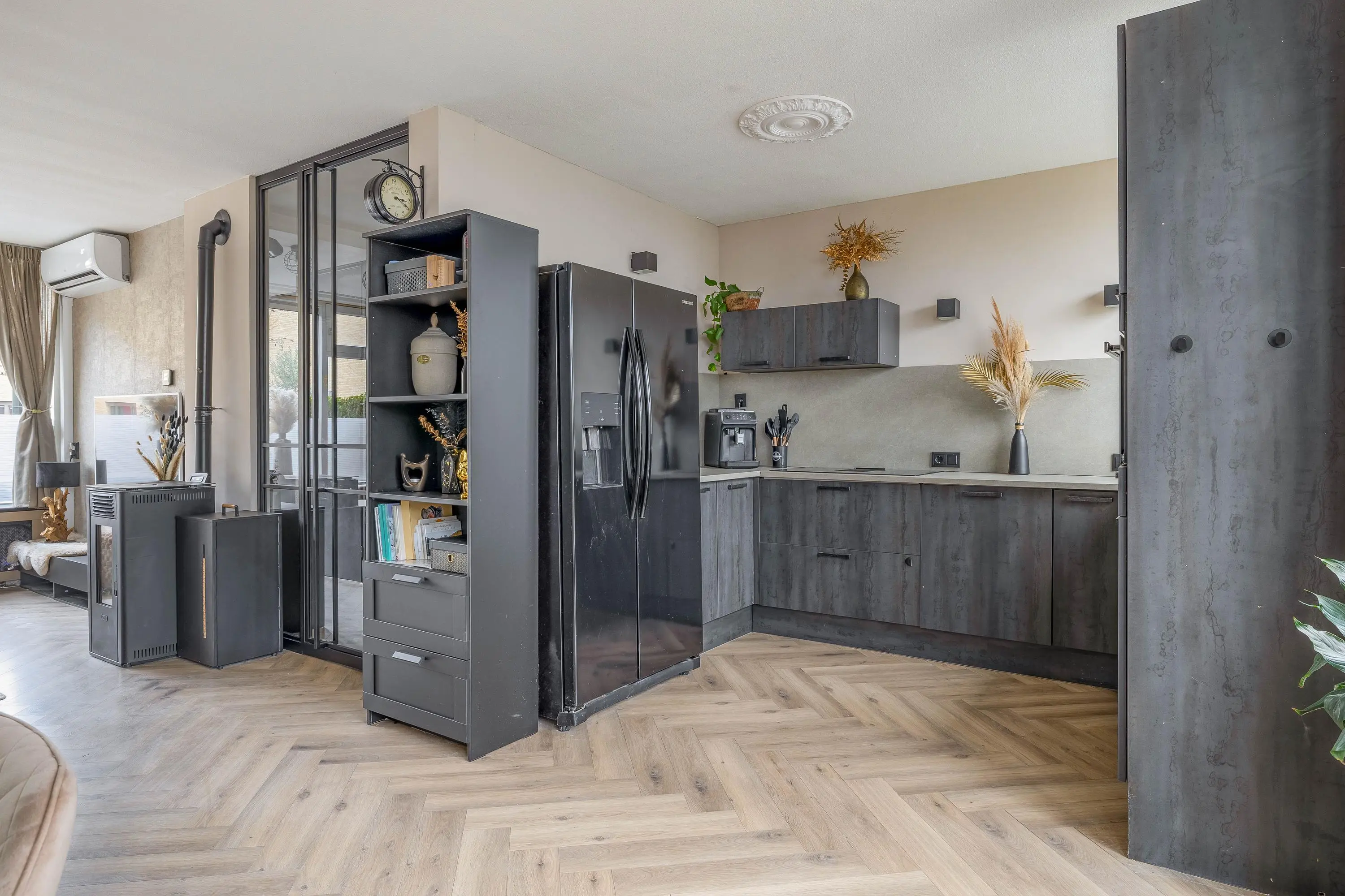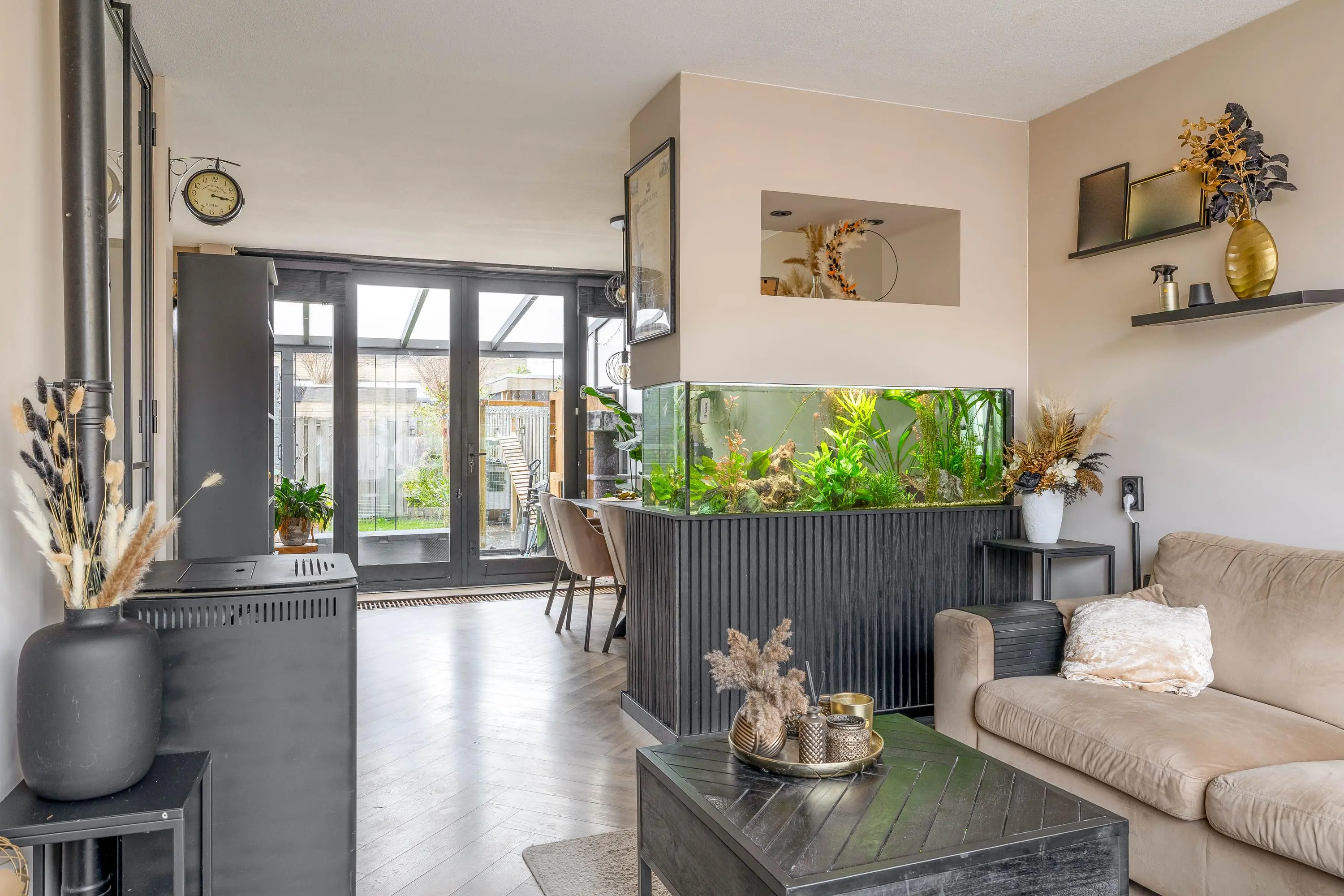 Via een moderne stalen glazen deur betreedt u de ruime en sfeervolle leefruimte. Dankzij het grote raam aan de voorzijde en de openslaande deuren aan de achterzijde geniet de woonkamer van veel natuurlijk daglicht. Het raam aan de voorzijde is bovendien voorzien van een zonnescherm. De royale opzet biedt volop mogelijkheden voor het creëren van een comfortabele zithoek en een aparte eethoek. Voor een aangenaam binnenklimaat is de ruimte uitgerust met zowel airconditioning als een palletkachel, waardoor het hier in elk seizoen prettig verblijven is. Centraal in de woonkamer bevindt zich een stijlvolle tussenwand met een ingebouwd aquarium, wat zorgt voor een uniek en sfeervol element.
