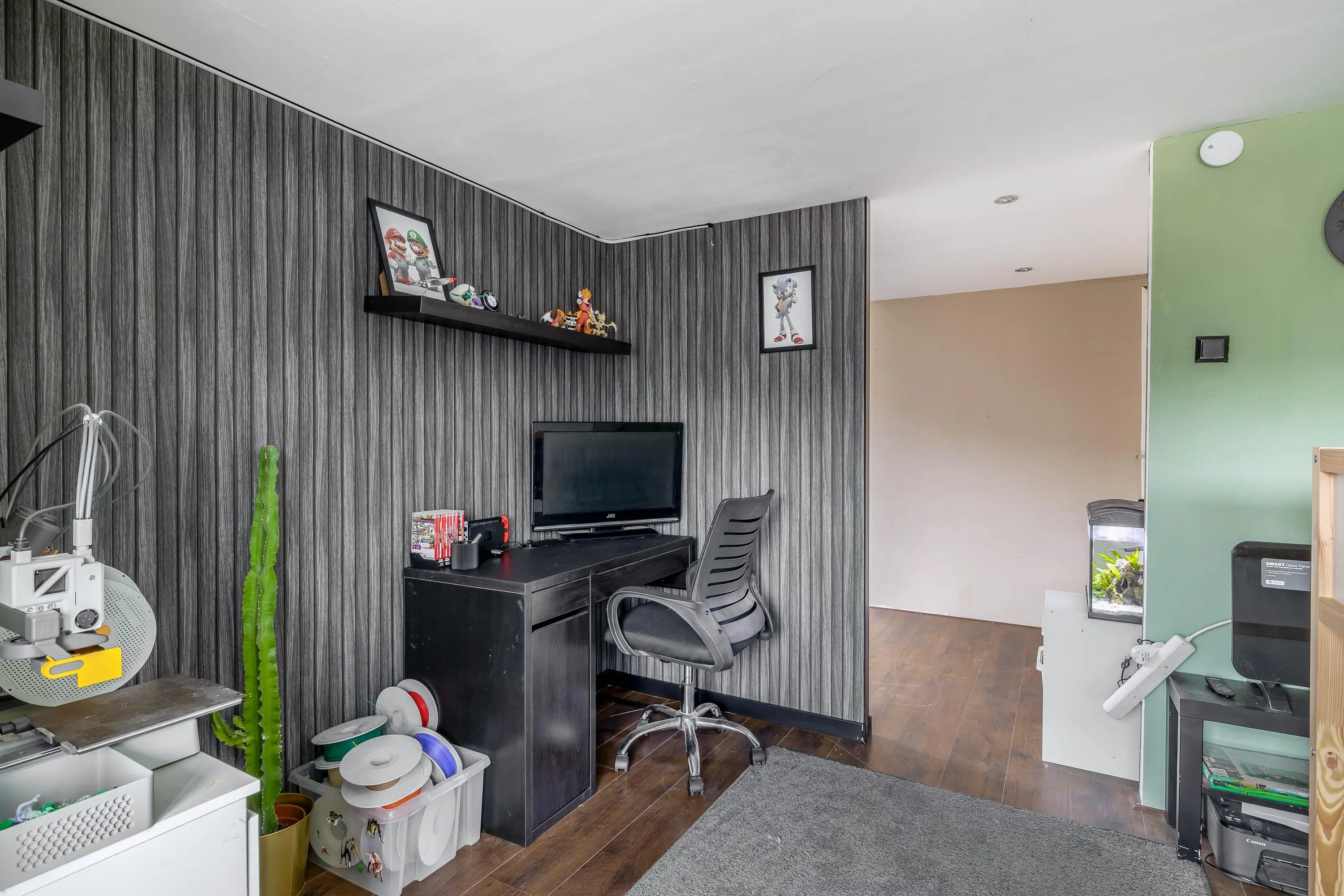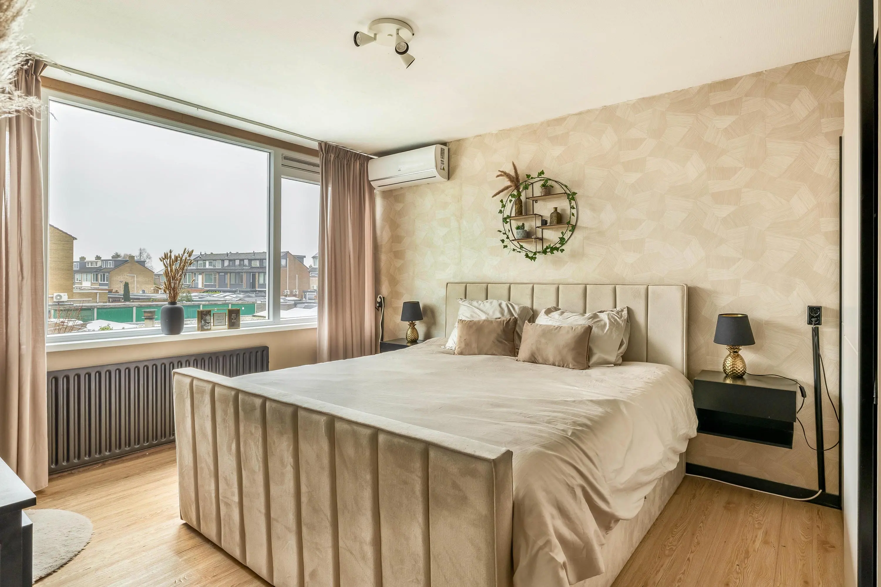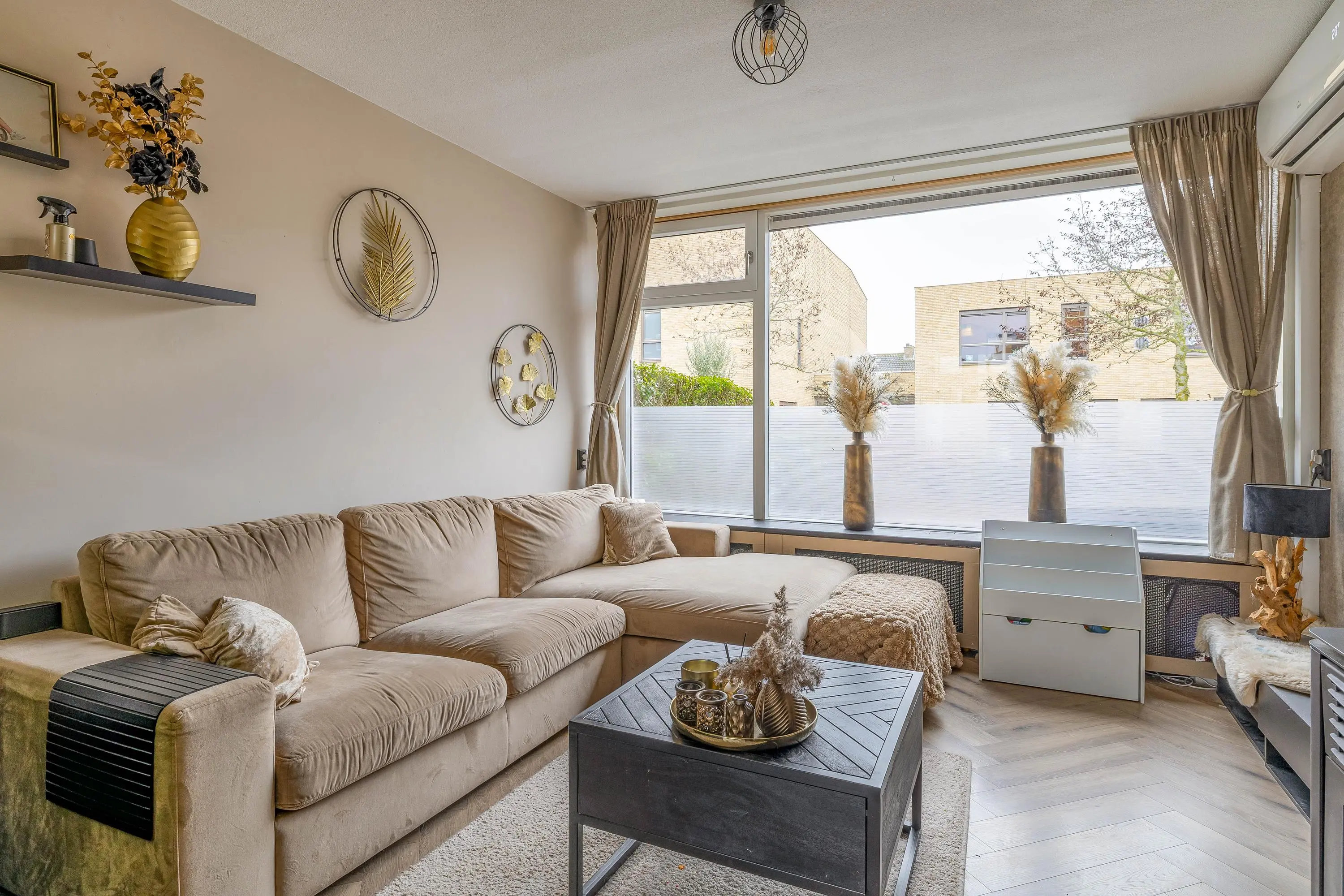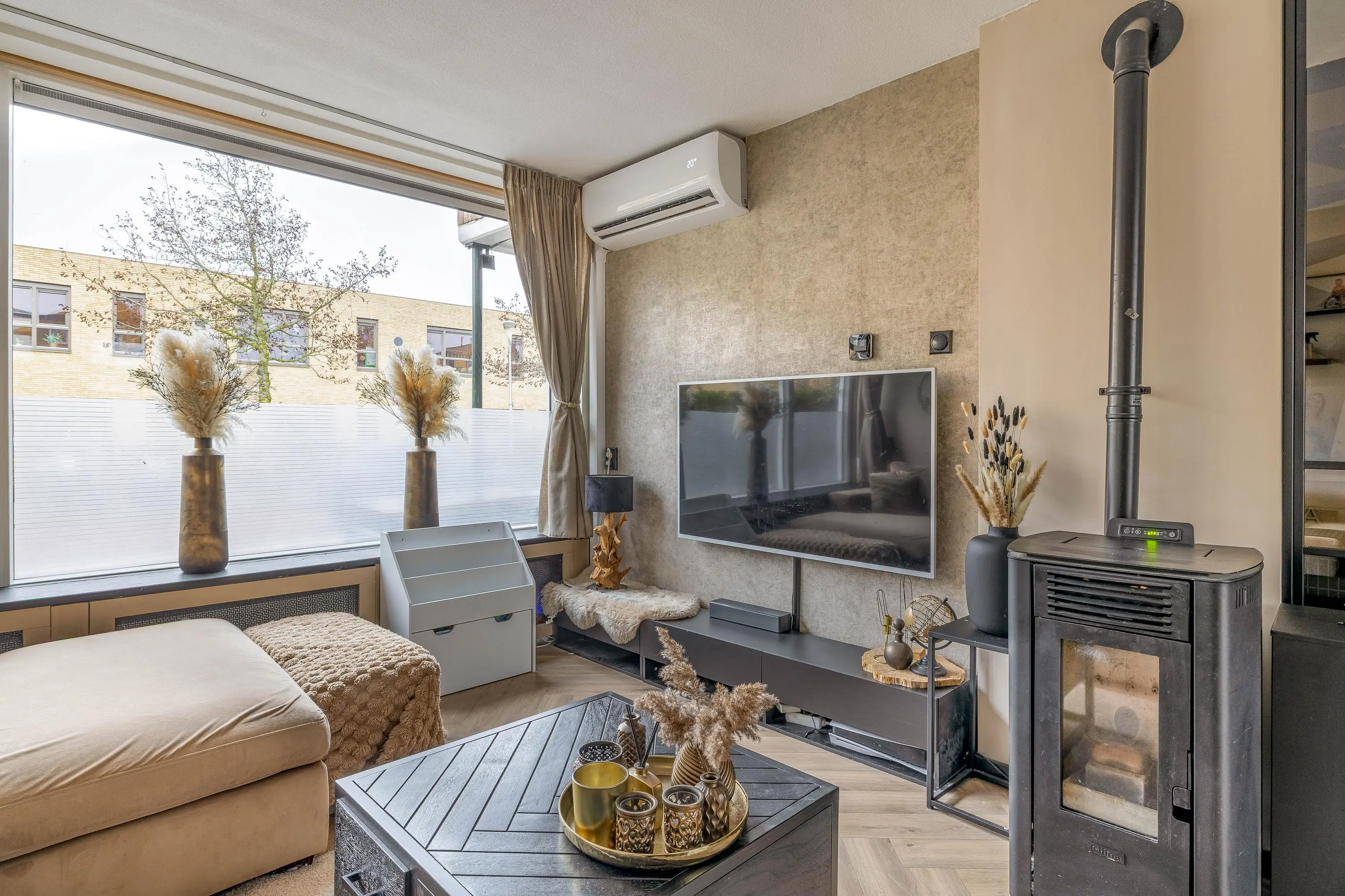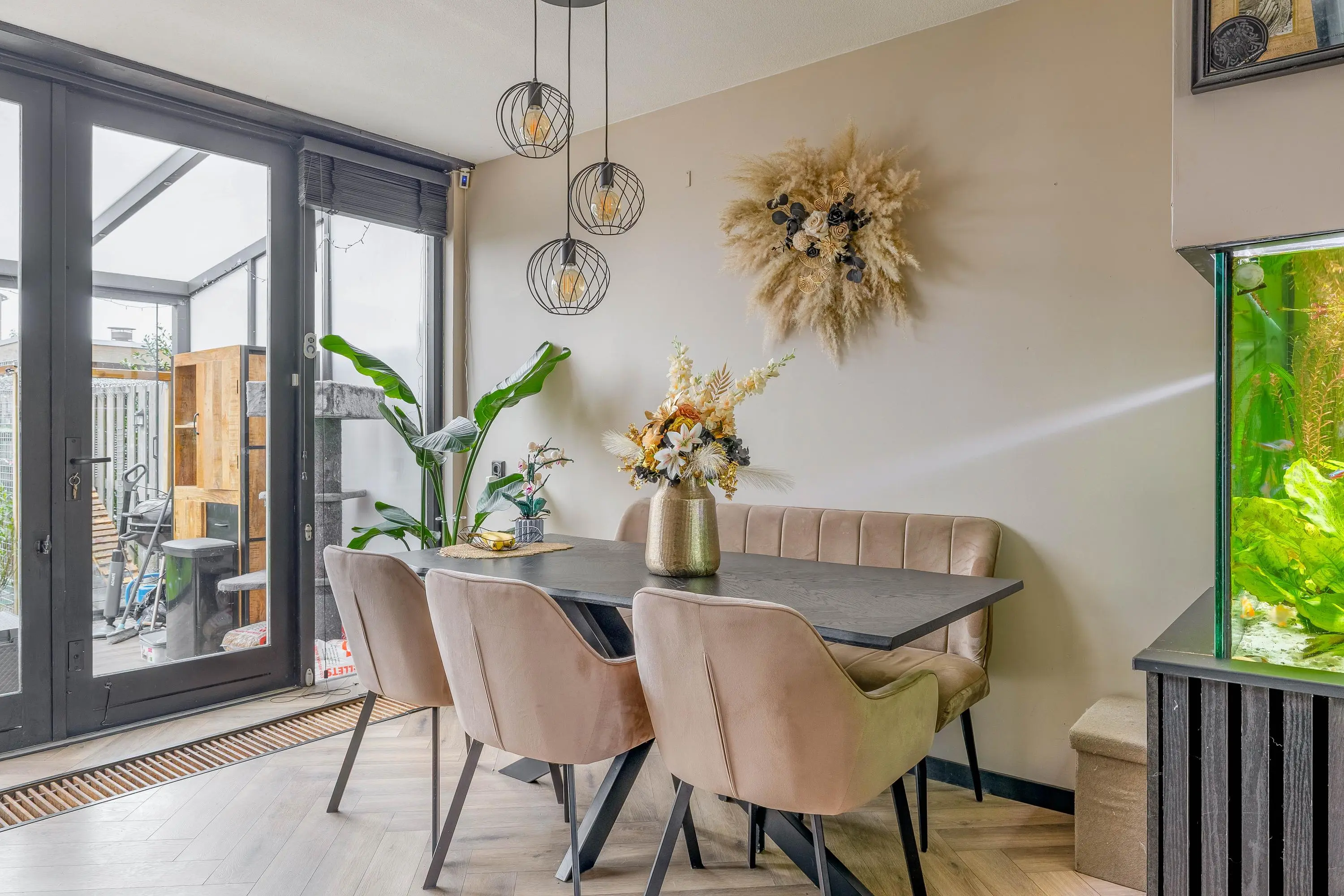 Via een moderne stalen glazen deur betreedt u de ruime en sfeervolle leefruimte. Dankzij het grote raam aan de voorzijde en de openslaande deuren aan de achterzijde geniet de woonkamer van veel natuurlijk daglicht. Het raam aan de voorzijde is bovendien voorzien van een zonnescherm. De royale opzet biedt volop mogelijkheden voor het creëren van een comfortabele zithoek en een aparte eethoek. Voor een aangenaam binnenklimaat is de ruimte uitgerust met zowel airconditioning als een palletkachel, waardoor het hier in elk seizoen prettig verblijven is. Centraal in de woonkamer bevindt zich een stijlvolle tussenwand met een ingebouwd aquarium, wat zorgt voor een uniek en sfeervol element.