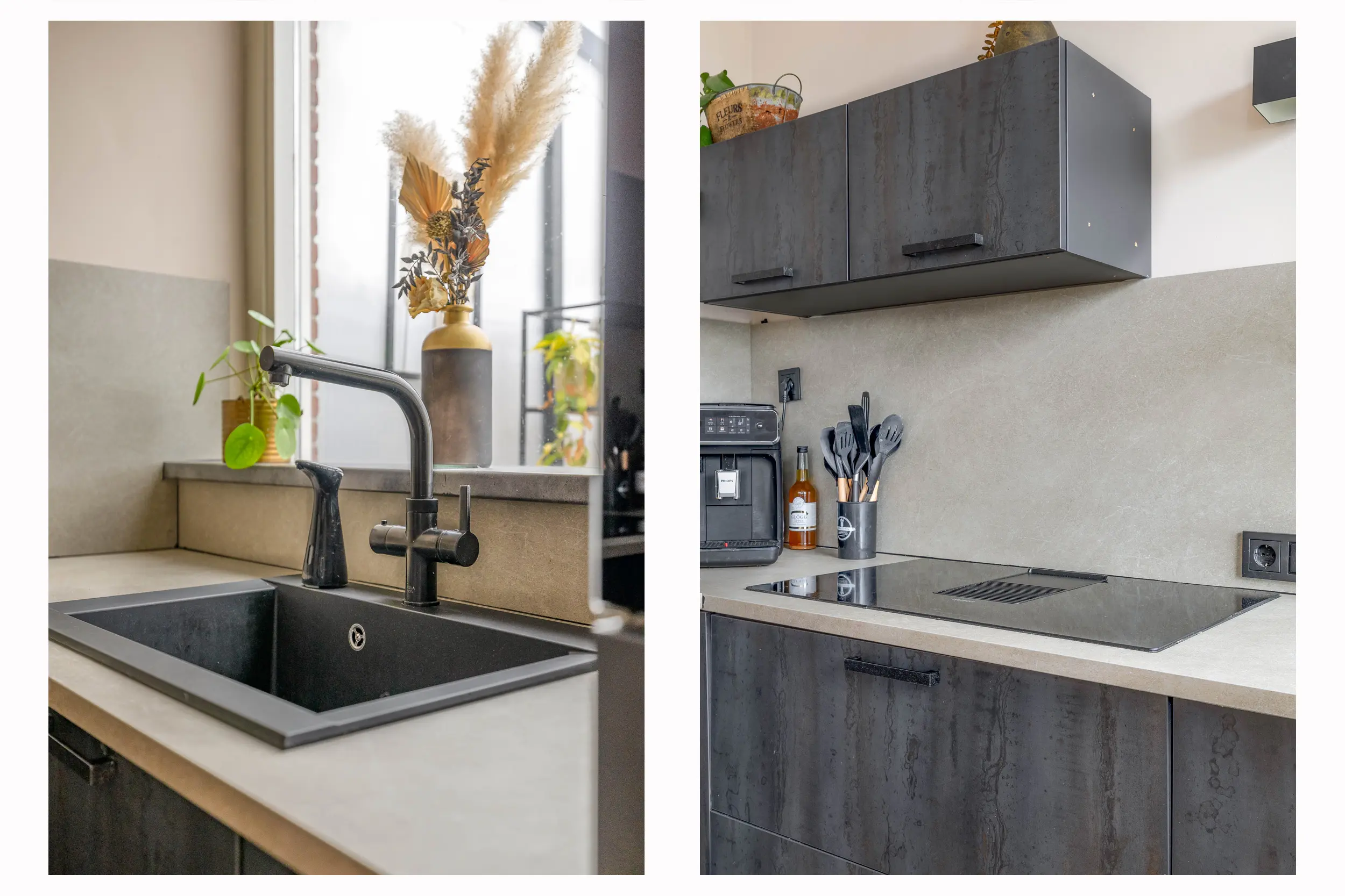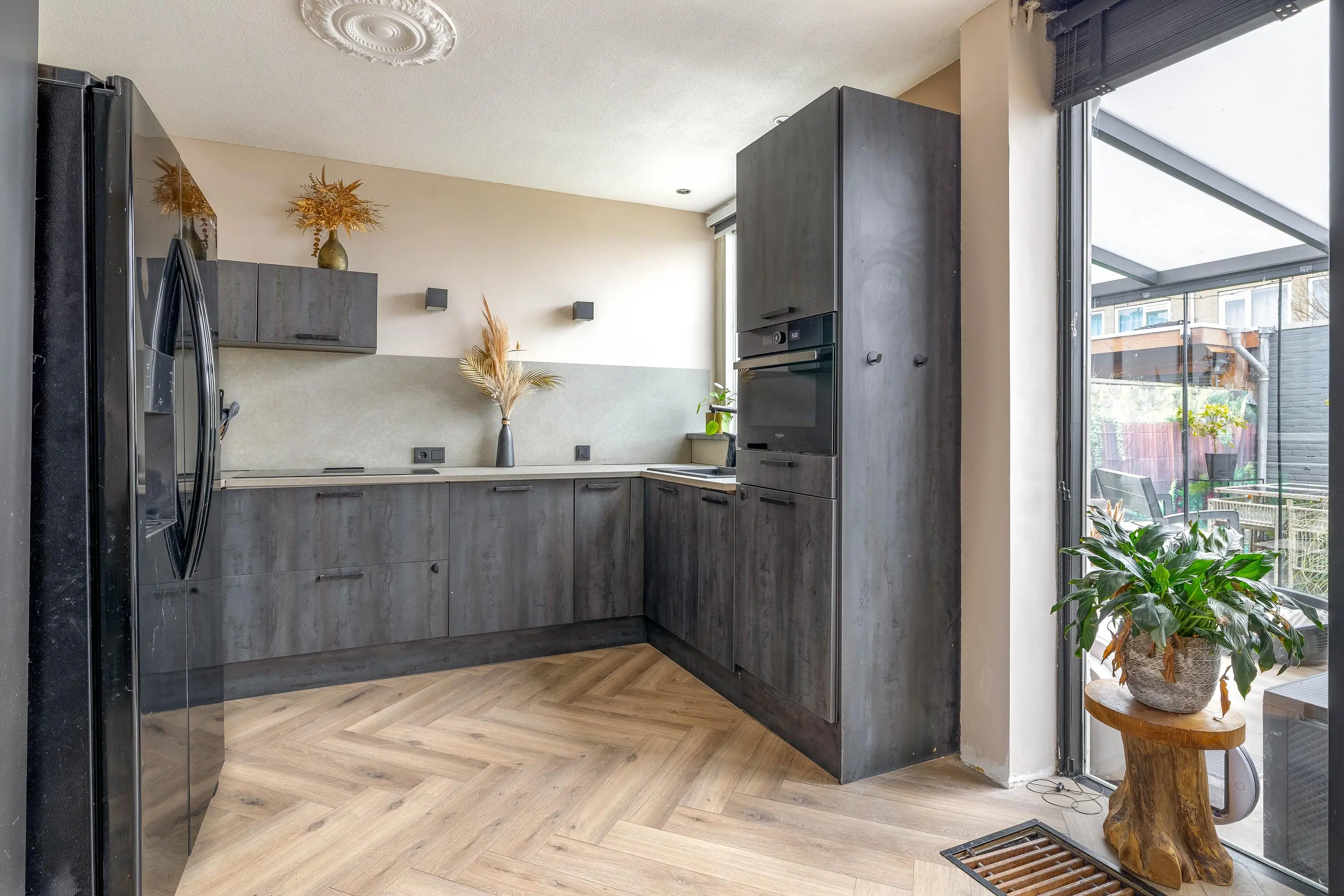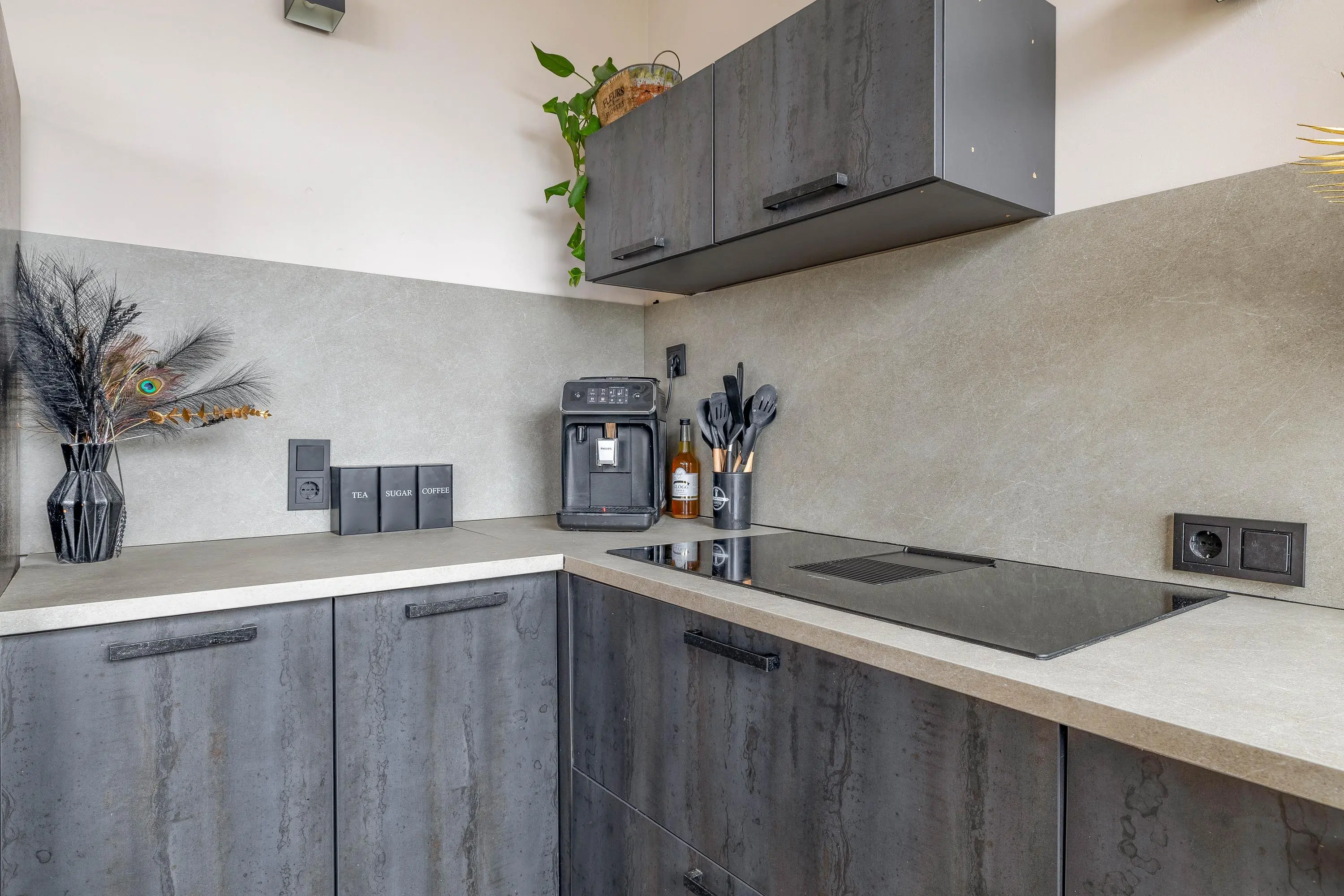 De moderne keuken, geplaatst in 2021, is volledig uitgerust met hoogwaardige inbouwapparatuur. Deze omvat een inductiekookplaat met geïntegreerde afzuiging, een heet waterkraan, een vaatwasser en een combi-oven.