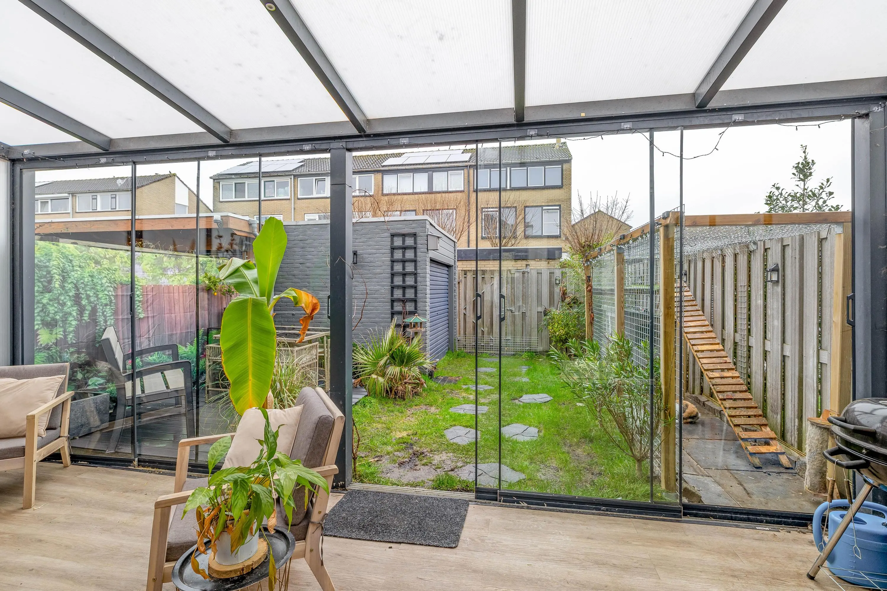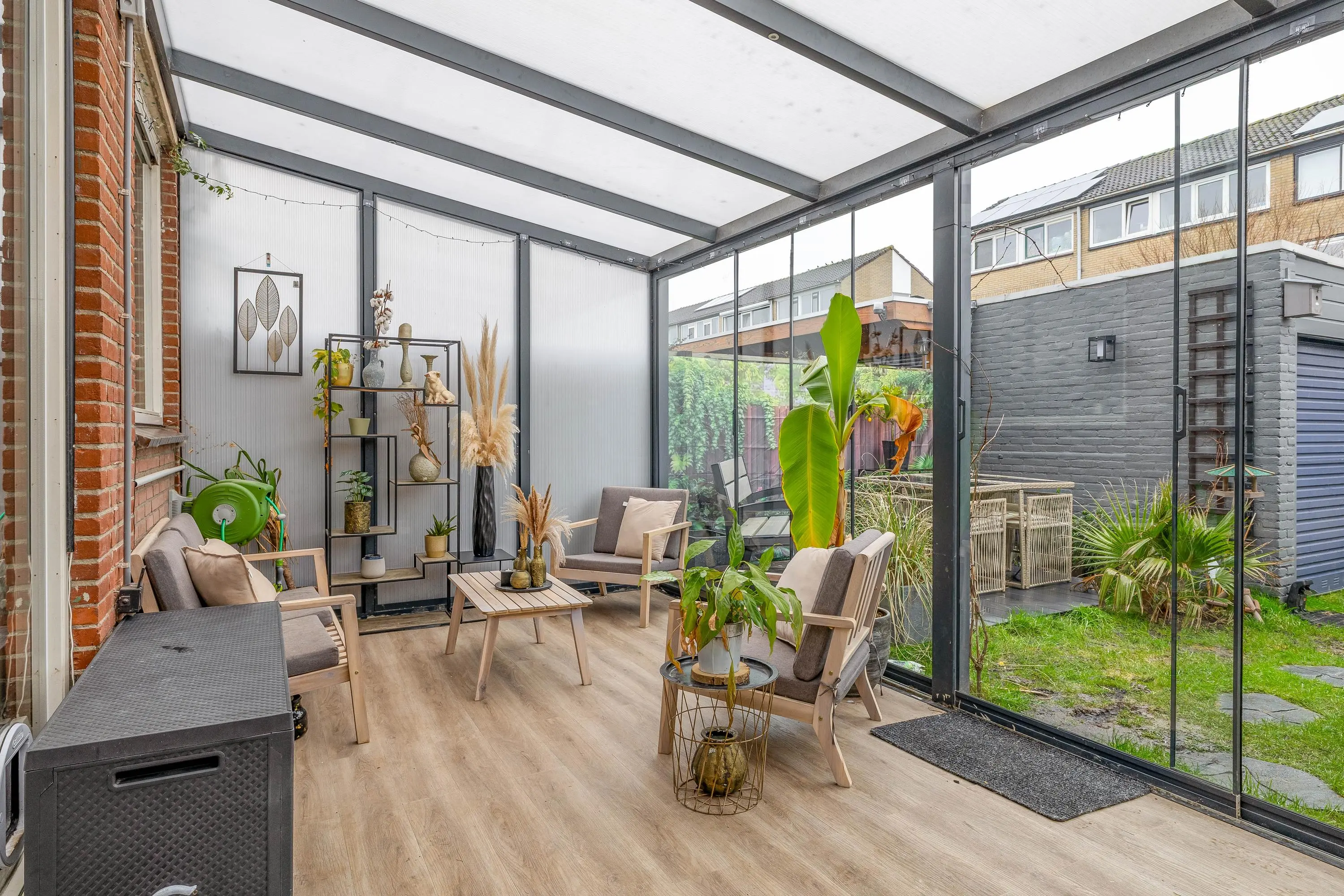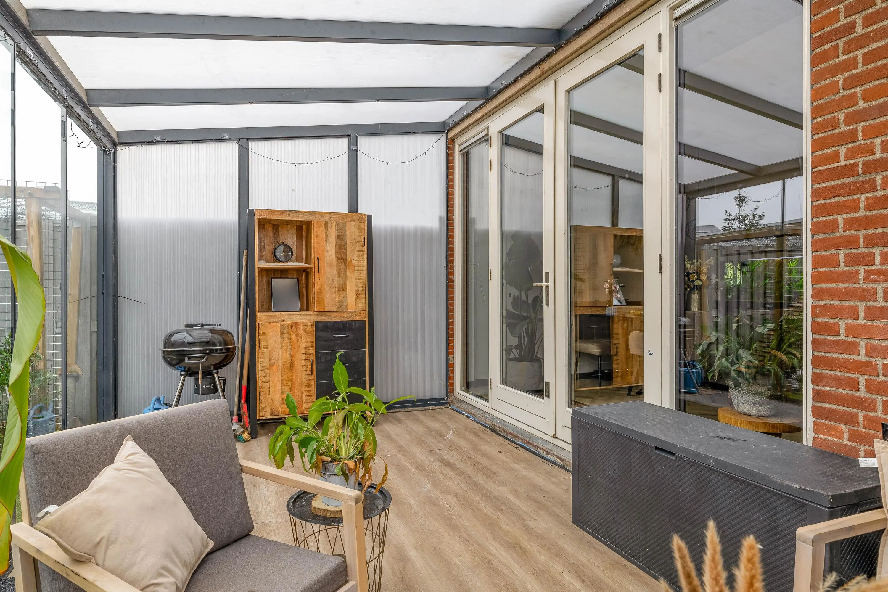 Via de openslaande deuren bereikt u de aangebouwde serre, voorzien van een laminaatvloer en een glazen schuifwand naar de tuin. De serre vormt een volwaardige verlenging van de woonkamer en biedt een heerlijke extra leefruimte waar u het hele jaar door kunt genieten van het buitengevoel.
