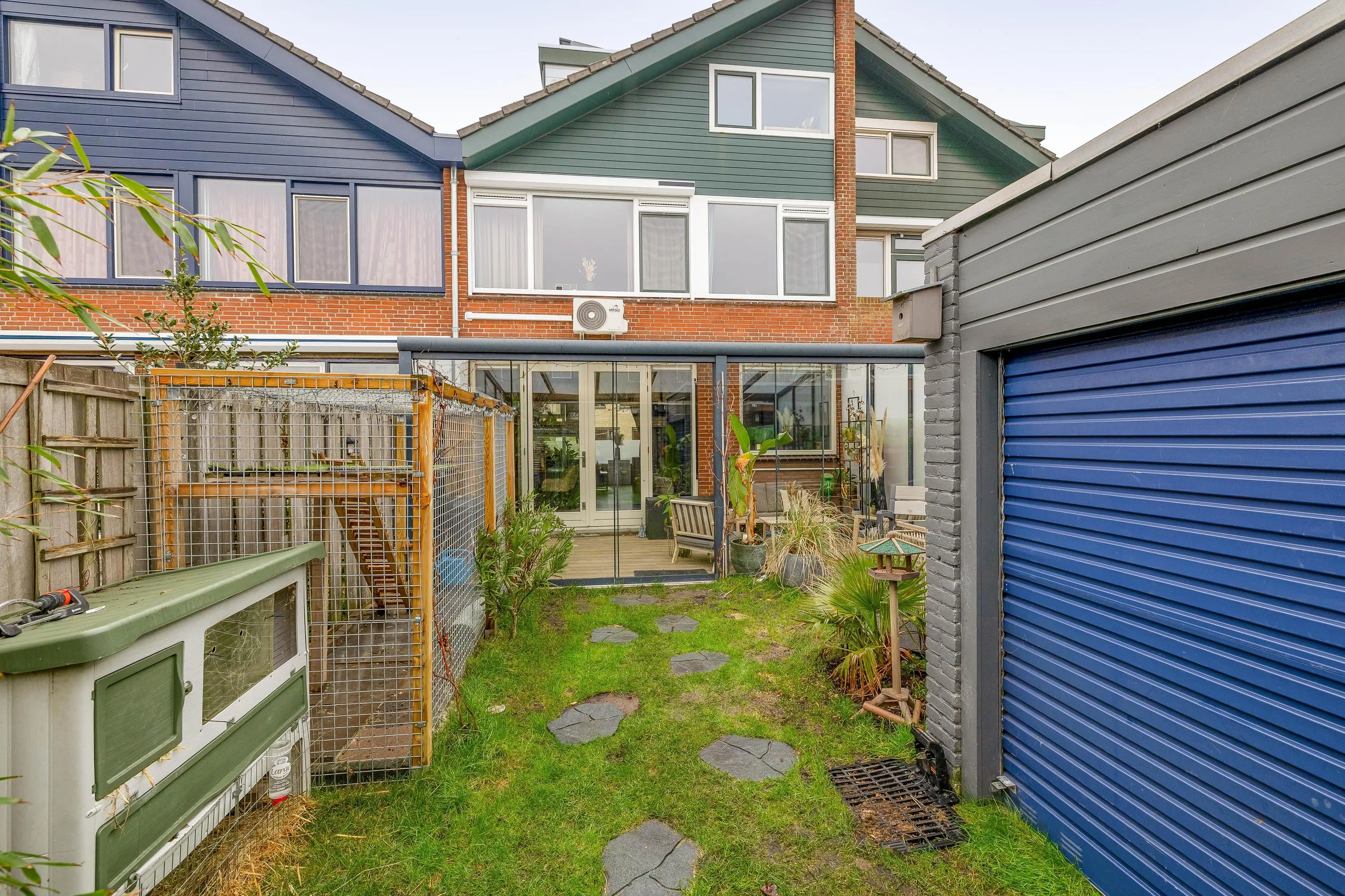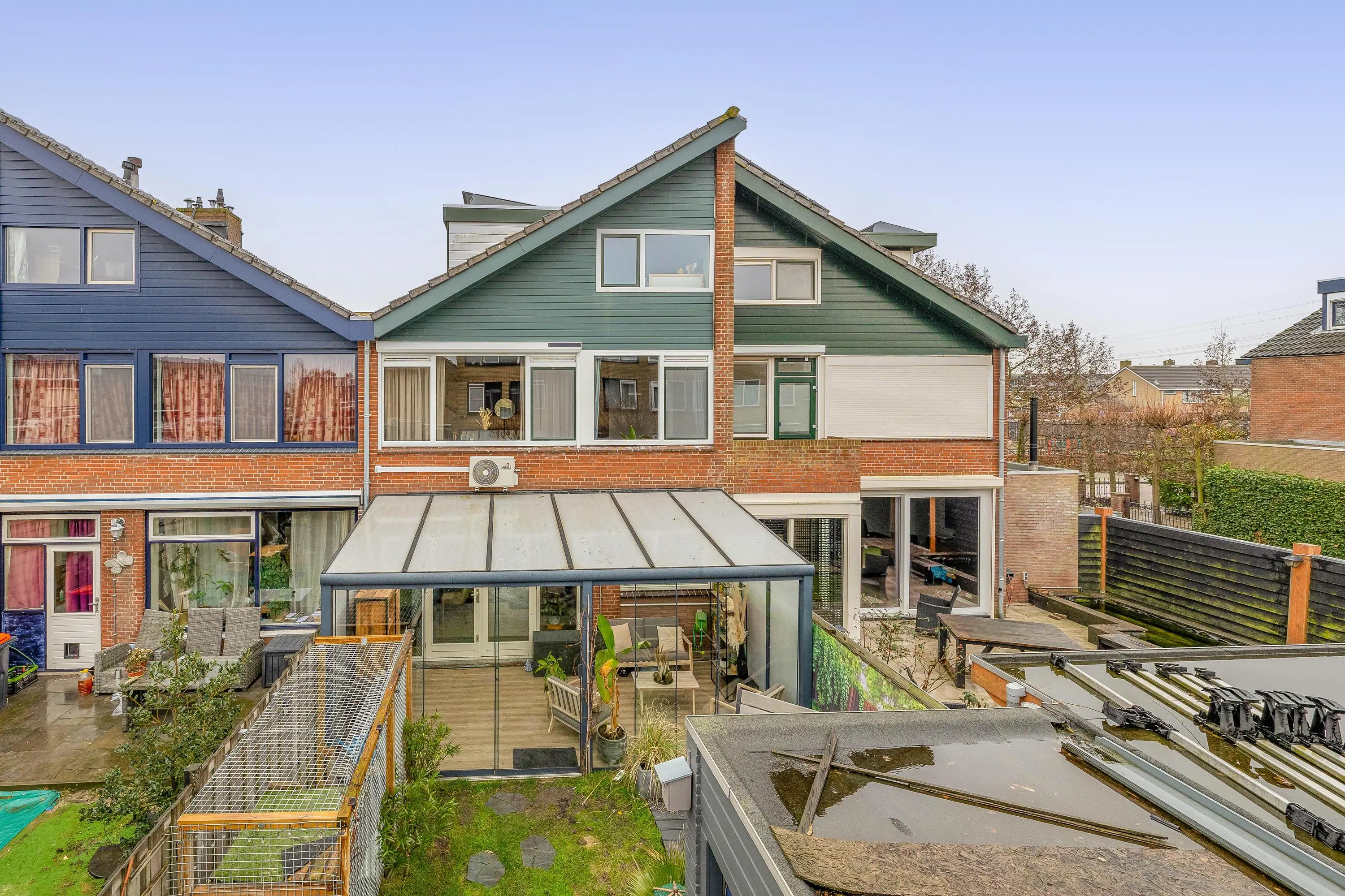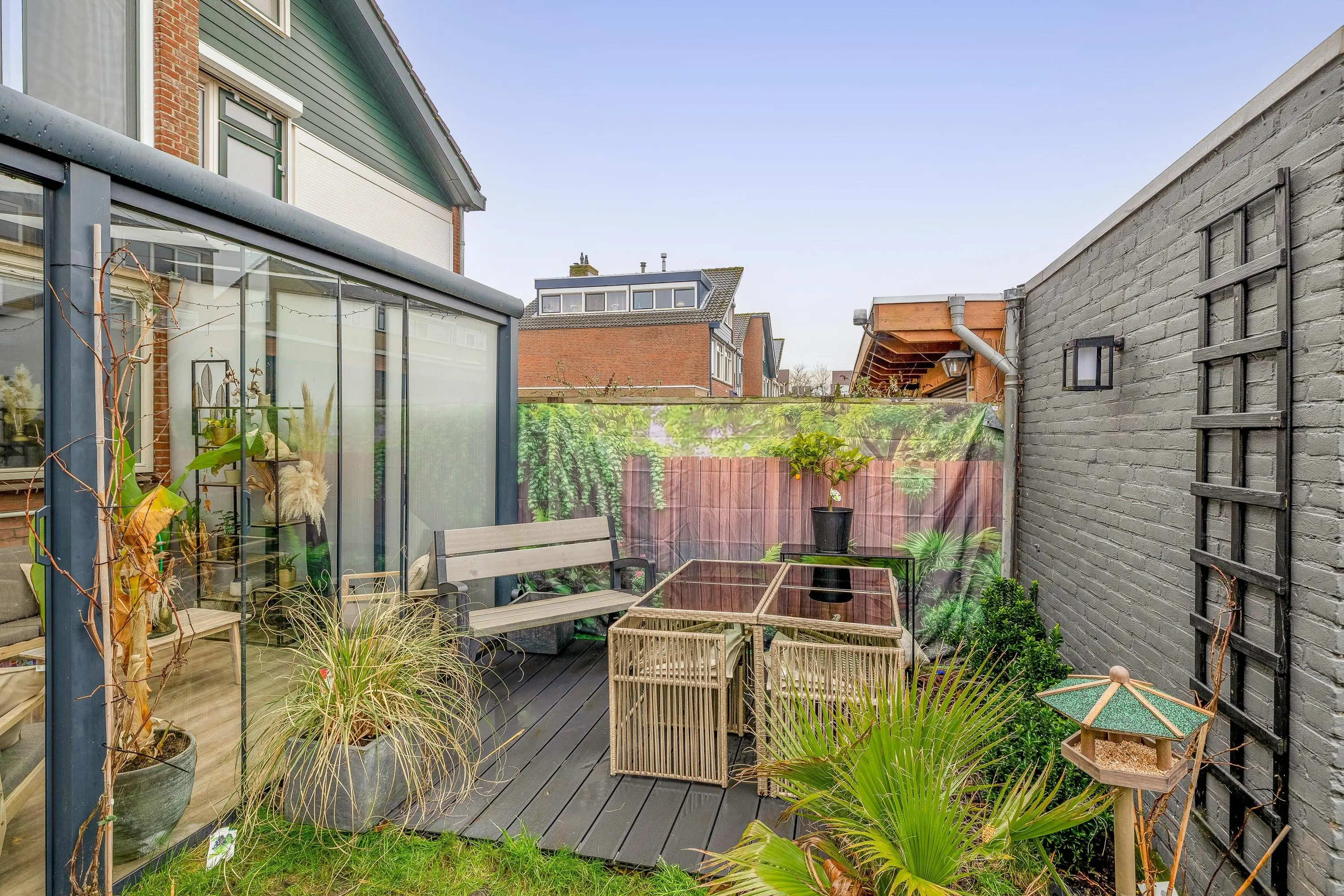 Via de openslaande deuren bereikt u de aangebouwde serre, voorzien van een laminaatvloer en een glazen schuifwand naar de tuin. De serre vormt een volwaardige verlenging van de woonkamer en biedt een heerlijke extra leefruimte waar u het hele jaar door kunt genieten van het buitengevoel.