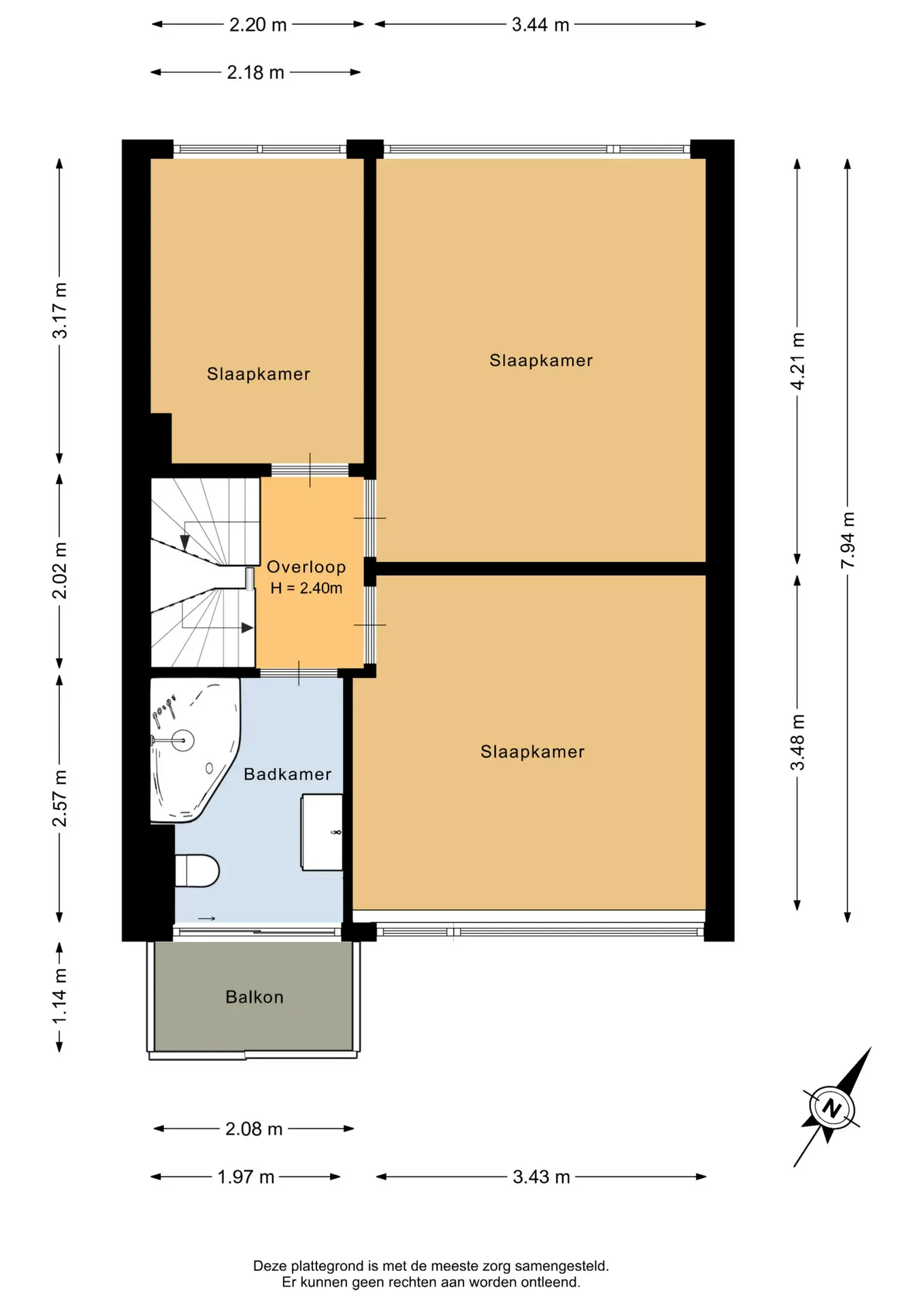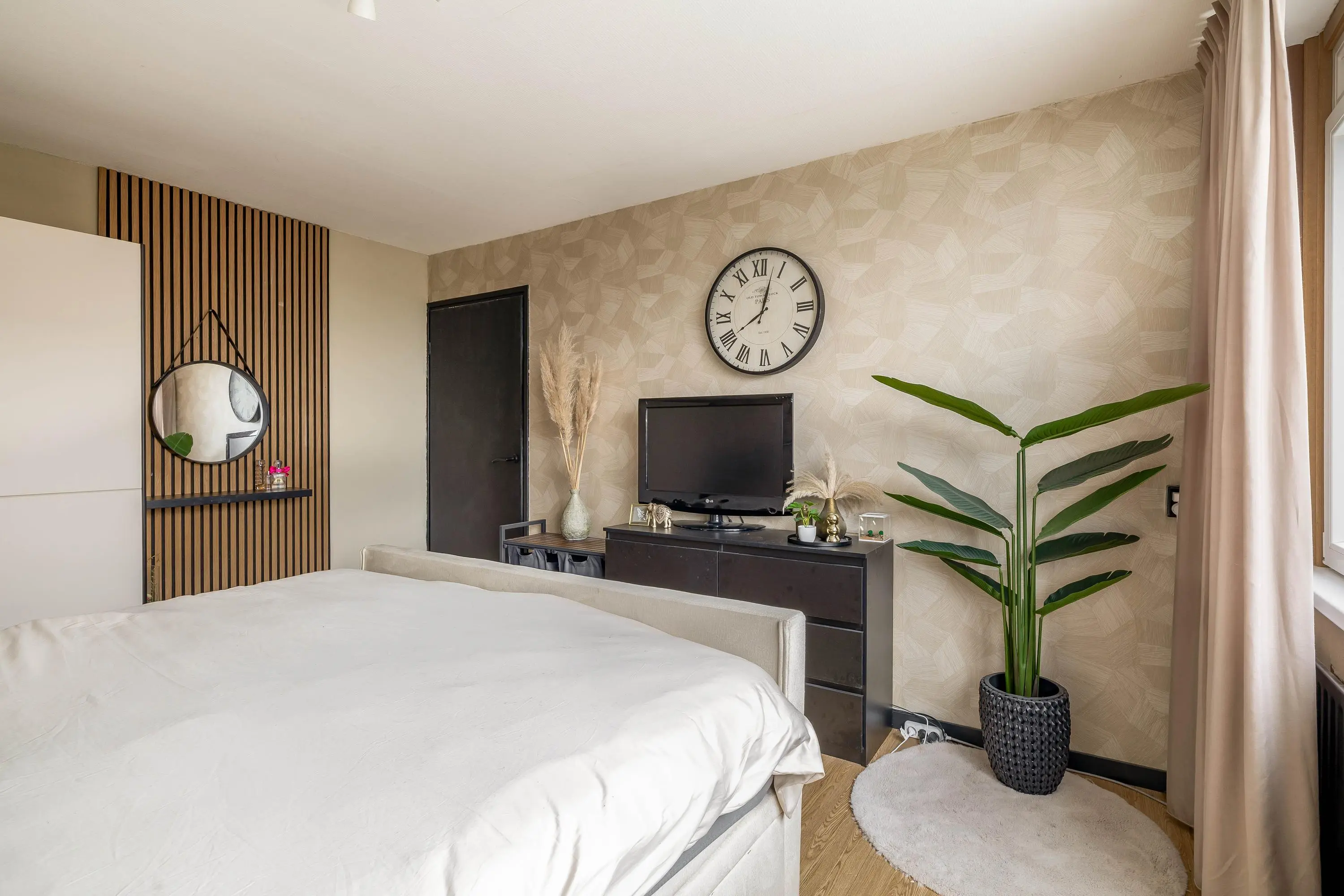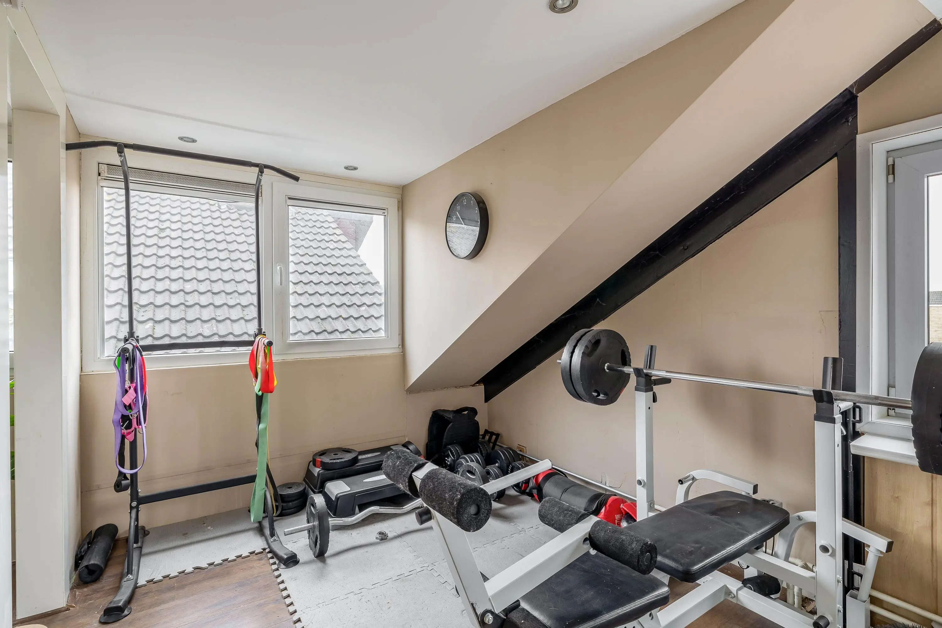 De overloop op de eerste verdieping is voorzien van laminaat en geeft toegang tot drie slaapkamers en de badkamer. De hoofdslaapkamer aan de achterzijde heeft een oppervlakte van circa 14,5m² en is uitgerust met airconditioning en een rolluik. De tweede slaapkamer ligt aan de voorzijde, meet circa 12m² en beschikt eveneens over airconditioning. De derde slaapkamer bevindt zich aan de achterzijde en heeft een oppervlakte van circa 7m². Alle slaapkamers zijn afgewerkt met een laminaatvloer.