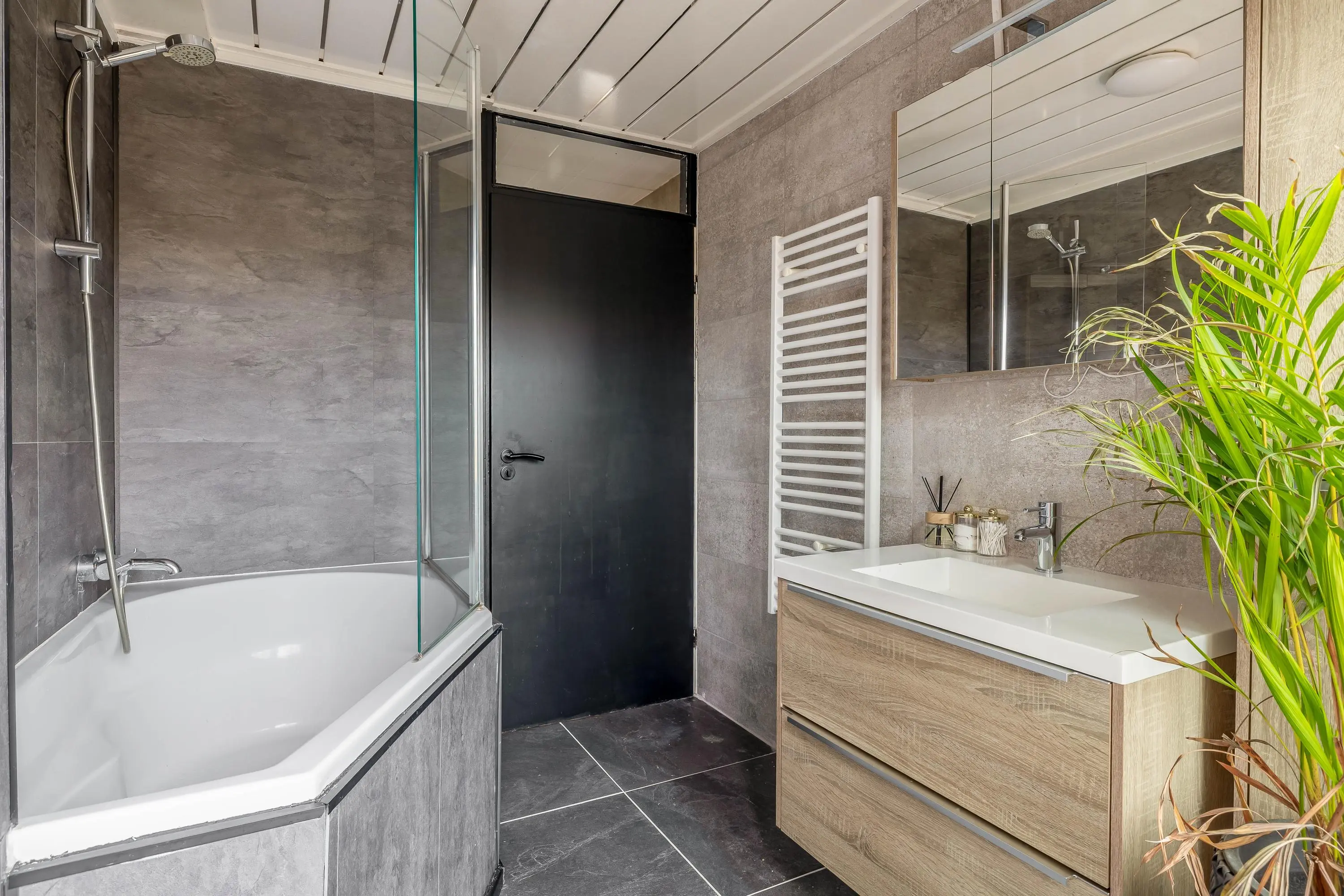 De moderne badkamer, eveneens geplaatst in 2021, is volledig betegeld en voorzien van een ligbad, toilet, wastafelmeubel met bijpassende wandkast en designradiator. Via een schuifdeur is er toegang tot een zonnig balkon op het zuidoosten.