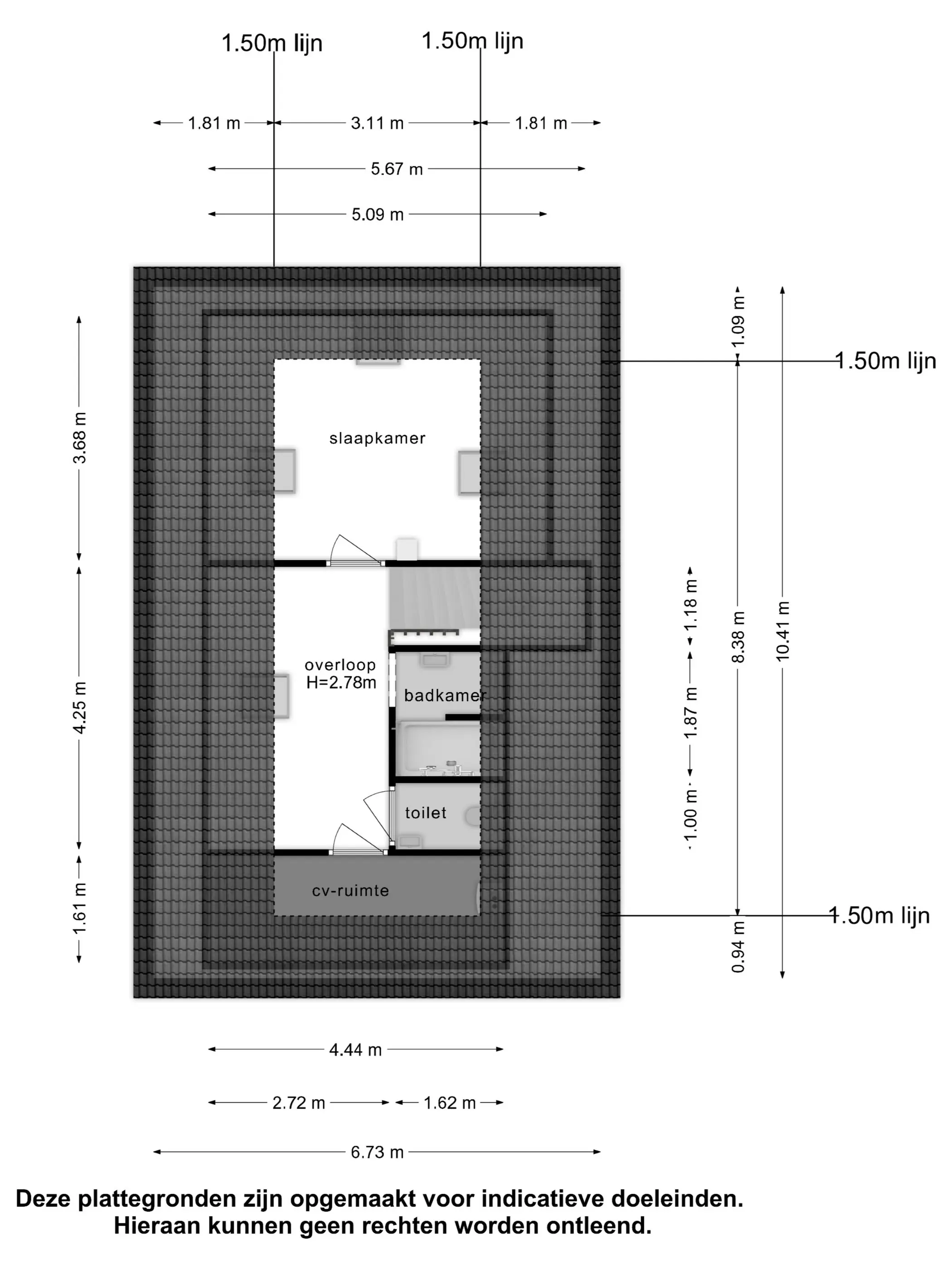 De badkamer is geheel betegeld en voorzien van een douche en wastafelmeubel. Het toilet bevindt zich separaat op deze verdieping.