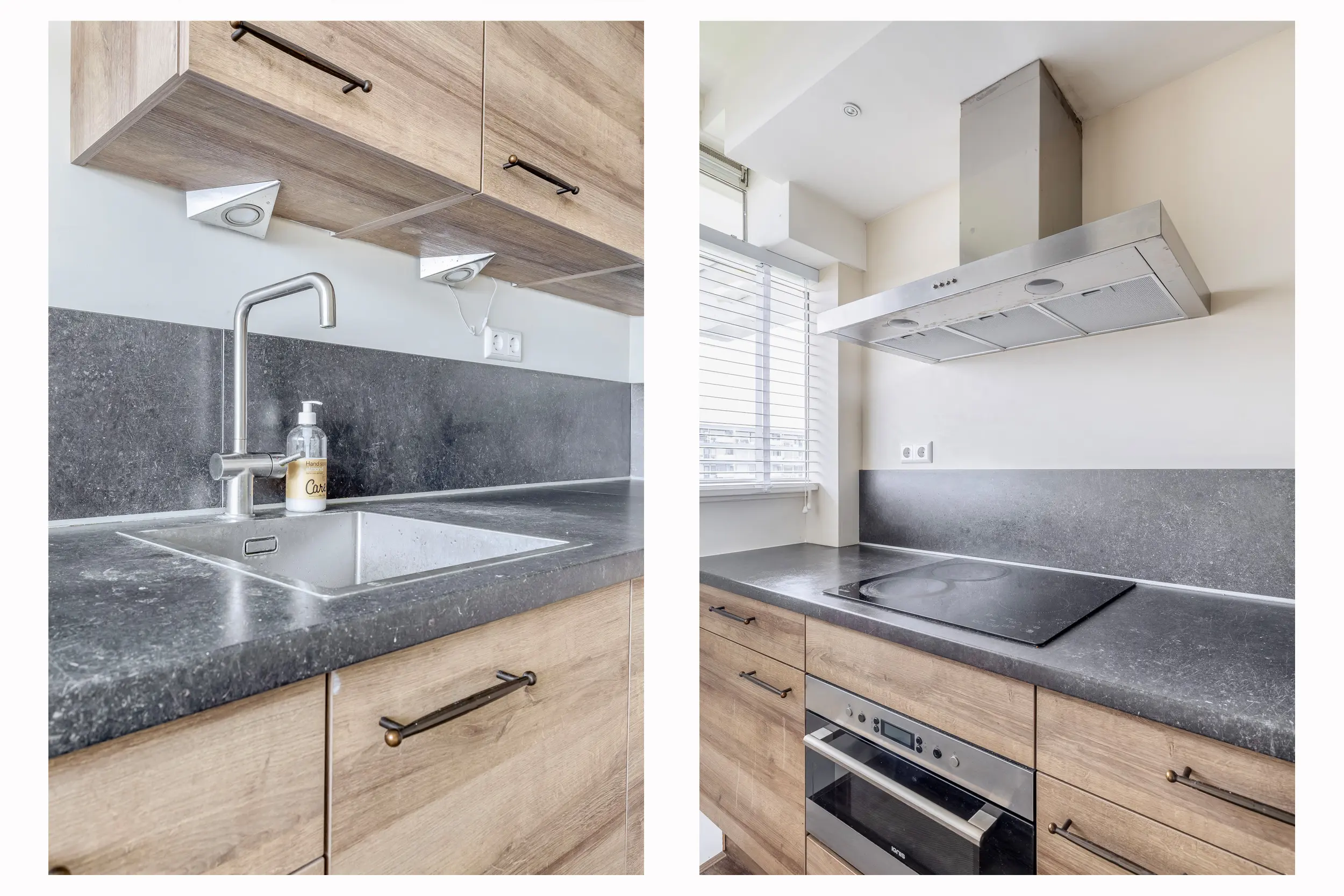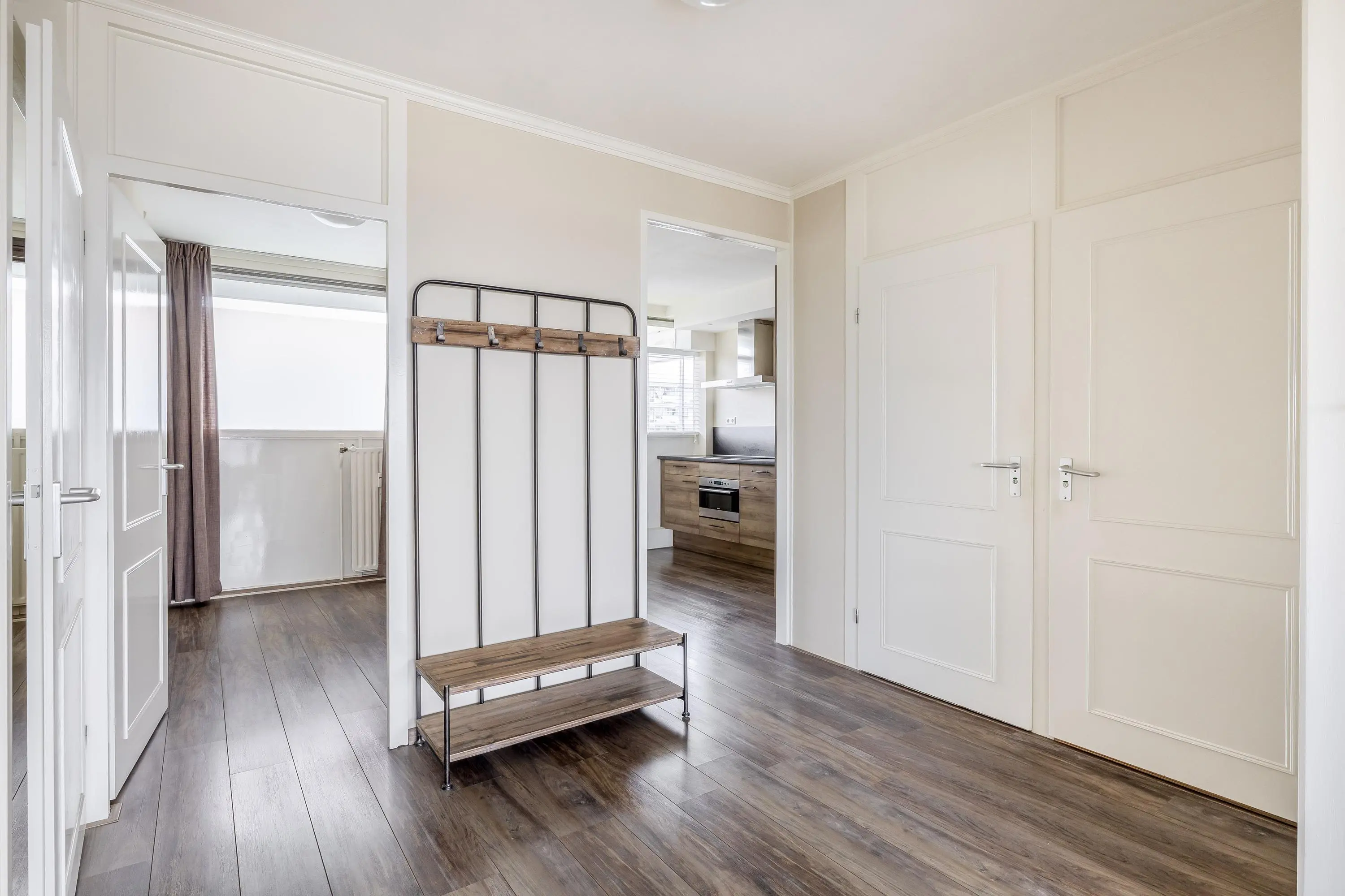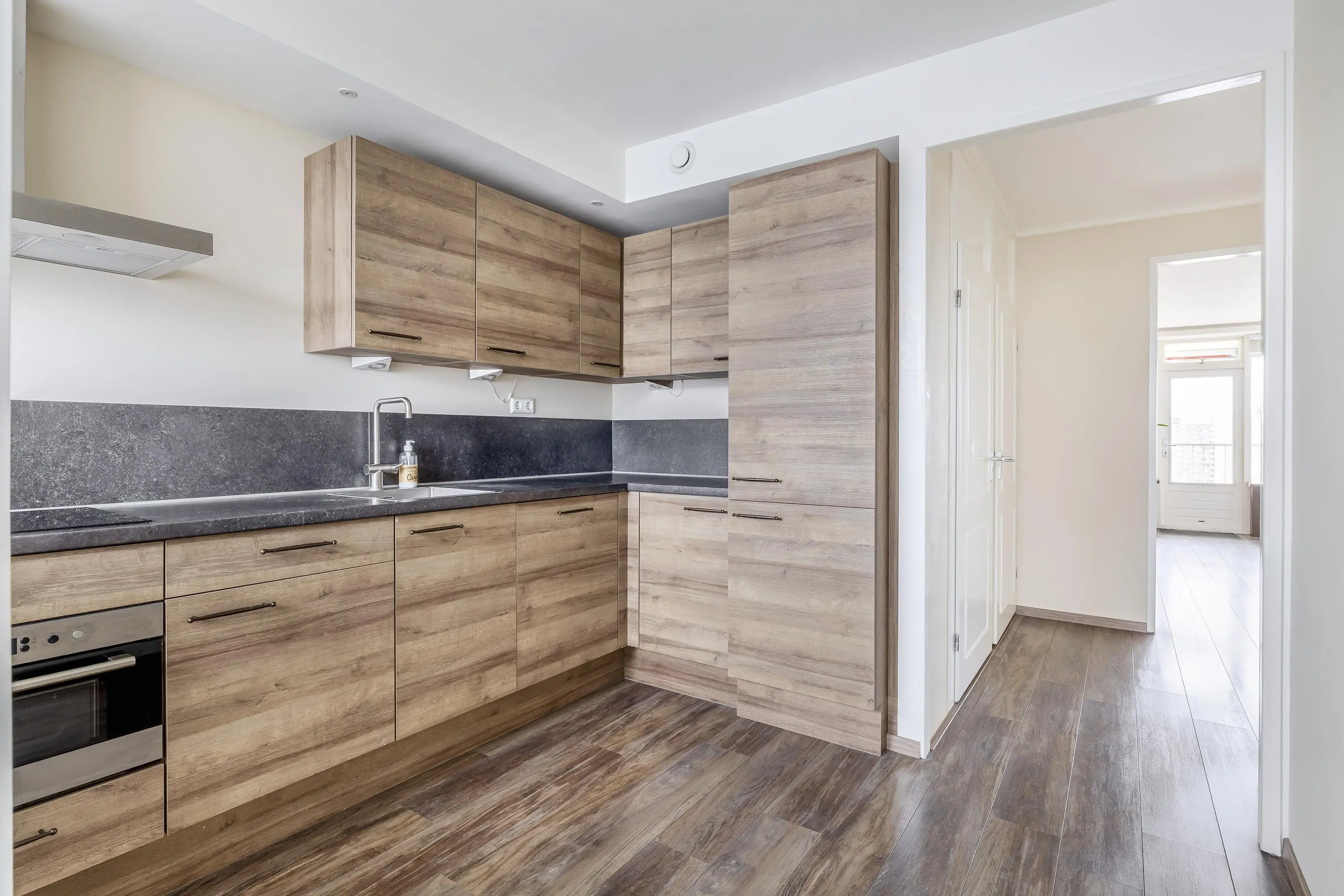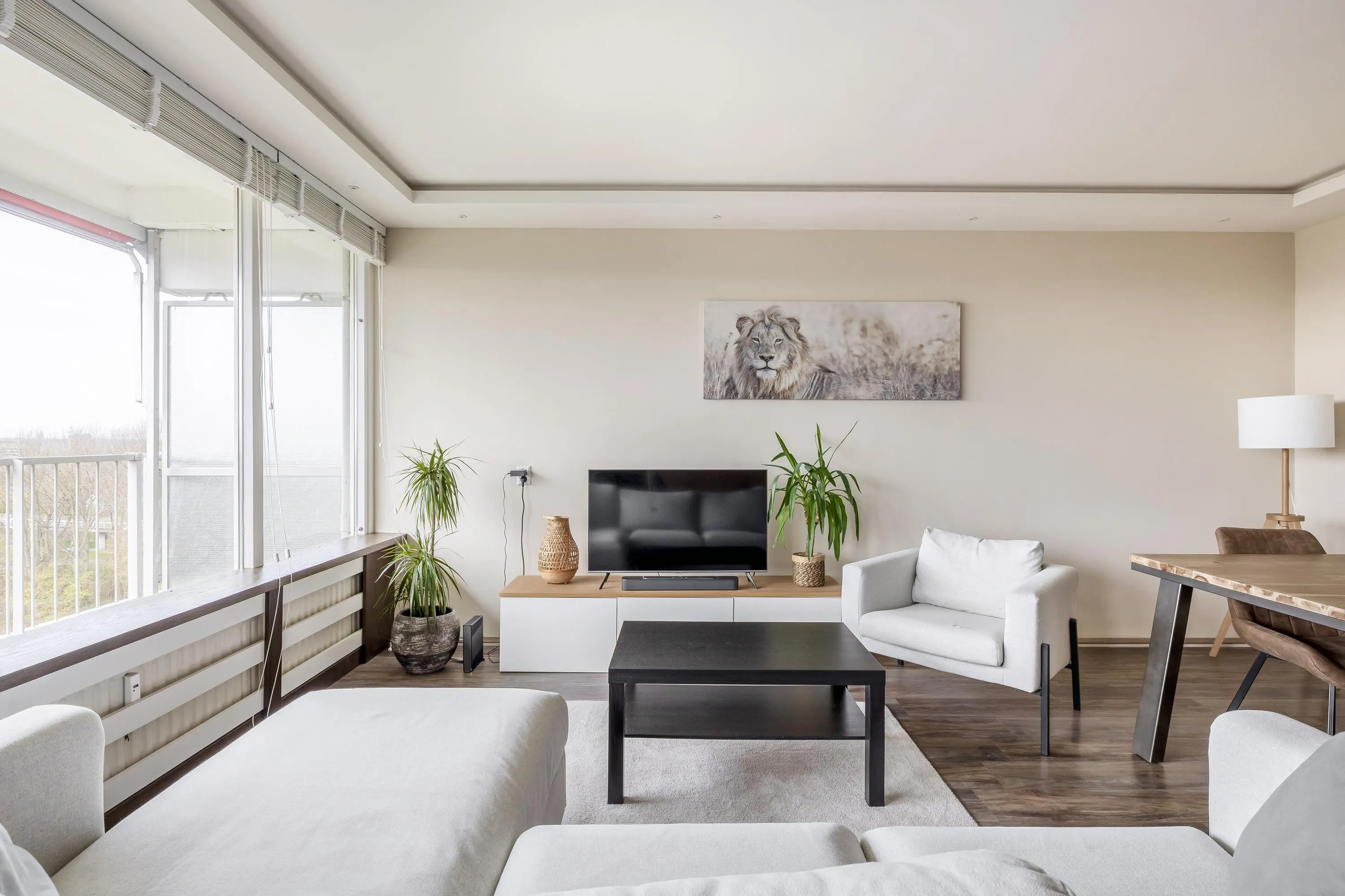 De entree in het appartement is in de hal met daarbij direct de open doorgang naar de keuken. In de hal is verder ook de meterkast aanwezig. De keuken heeft een keurige L-opstelling en is voorzien van veel kastruimte. Aan apparatuur is hier een inductie kookplaat, afzuigkap, oven, spoelbak, koel-/vriescombinatie en een vaatwasser aanwezig. Via de keuken is een open doorgang naar de living Vanuit deze ruimte zijn de verdere kamers in de woning te bereiken. De riante woonkamer geeft een fantastisch uitzicht over groen en richting de stad Rotterdam en is enorm licht door de grote raampartijen. Een leuke bar geeft een speels gevoel aan de ruimte. Aan de voorzijde is de grote slaapkamer gelegen, tussen deze kamer en de woonkamer is een mooie opbergkast. Naast de grote kamer is een fijne tweede slaapkamer te vinden. Deze kamer is ook voorzien van de wasmachine aansluiting. De badkamer en toiletruimte zijn tussen de keuken en de woonruimte in gelegen. De badkamer is ruim van opzet en voorzien van een ruime inloopdouche en een grote wastafel inclusief een dubbele kraan. Naast de badkamer is nog een losse toiletruimte. Het balkon aan de achterzijde is gericht op het zonnige zuiden en geeft een mooi uitzicht over Rotterdam en omstreken.